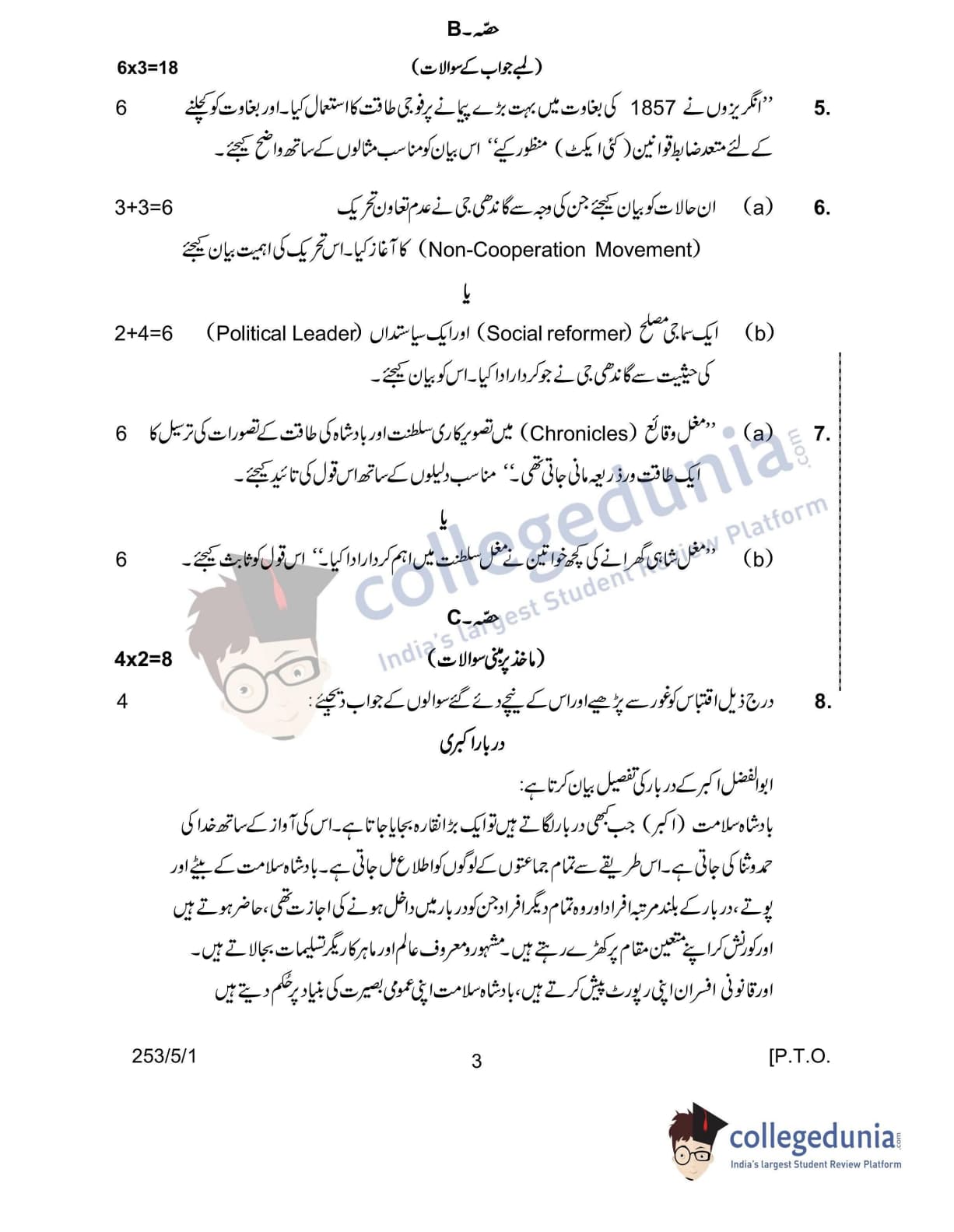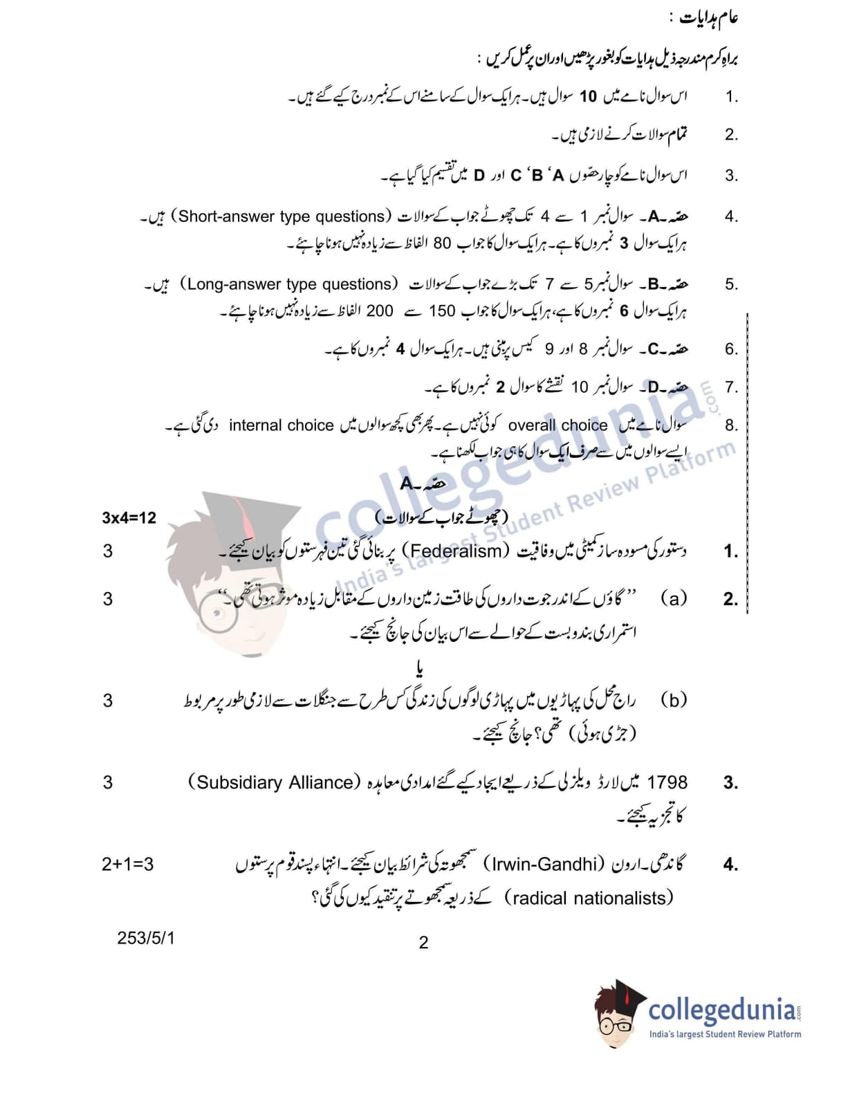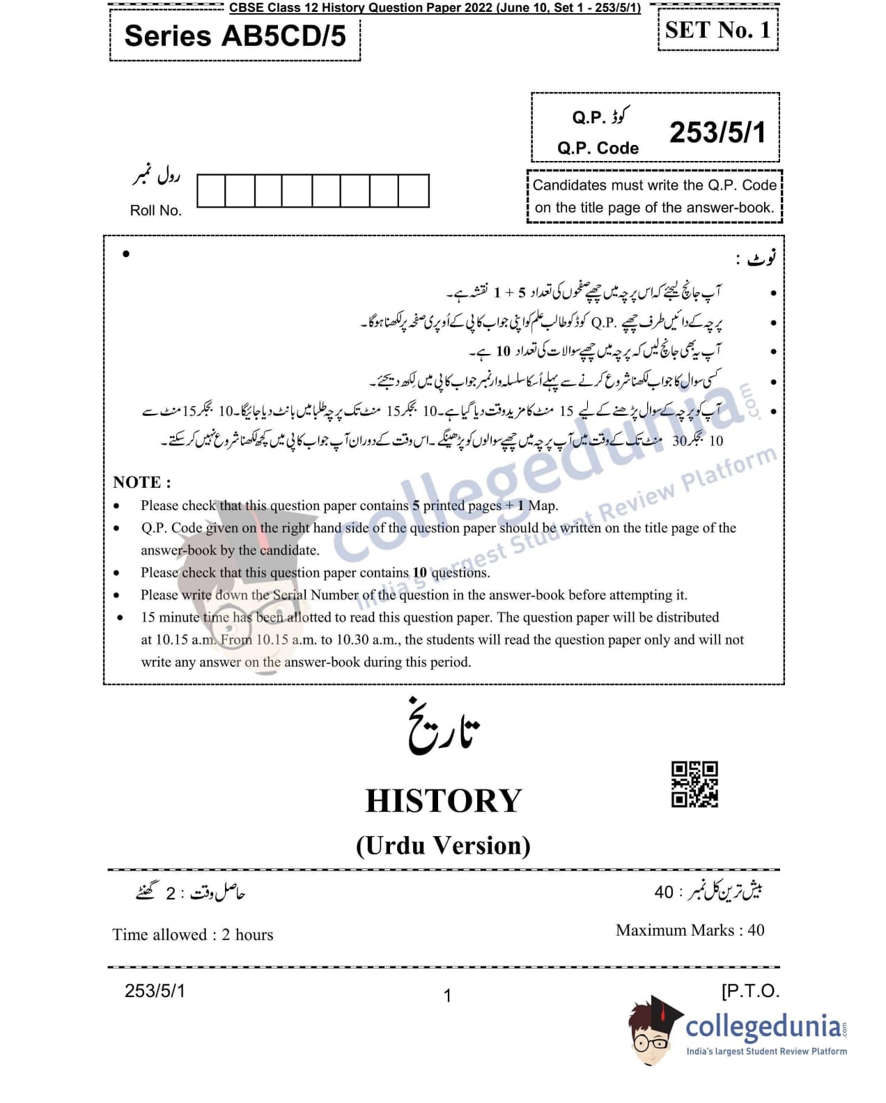 CBSE Class 12 2022 History Question Paper Set 1 - 253/5/1 with Answer Key pdf is available for download. The exam was conducted by Central Board of Secondary Education on June 10, 2022 in the Morning Session 10:30 AM to 12:30 PM. The medium of paper was Urdu. In terms of difficulty level, CBSE Class 12 History paper was of Easy level. The question paper comprised a total of 10 questions divided among 4 sections.