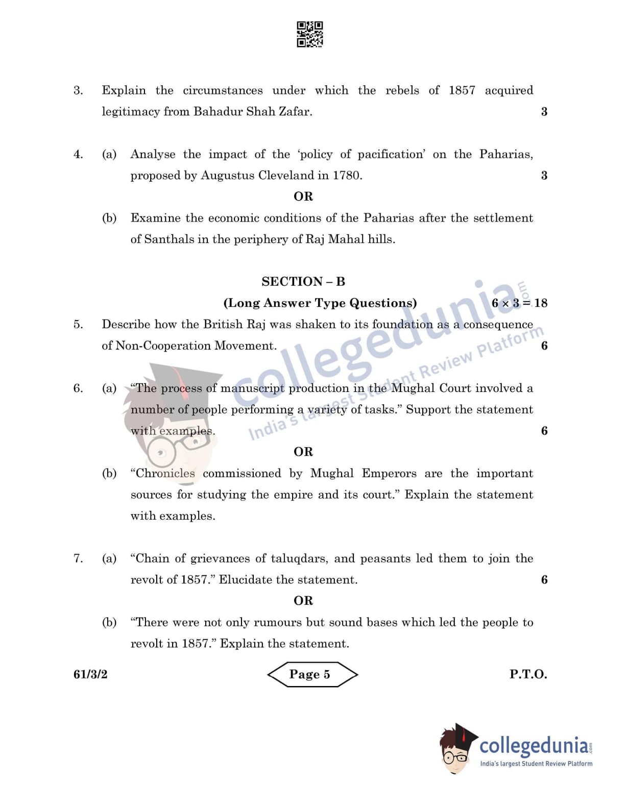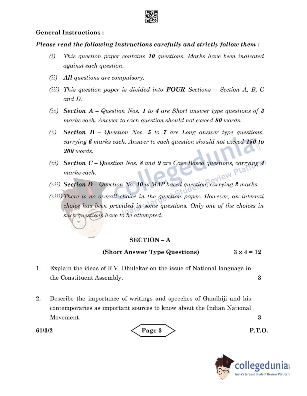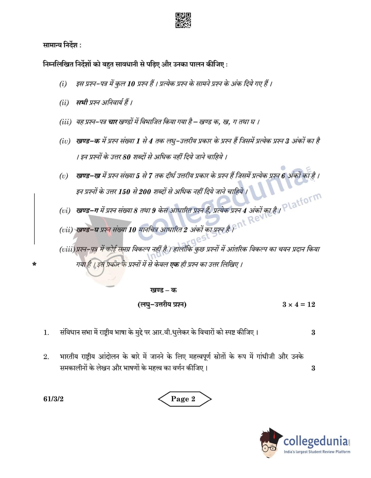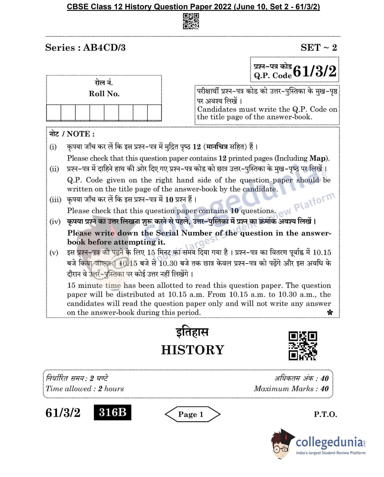 CBSE Class 12 2022 History Question Paper Set 2 - 61/3/2 with Answer Key pdf is available for download. The exam was conducted by Central Board of Secondary Education on June 10, 2022 in the Morning Session 10:30 AM to 12:30 PM. The medium of paper was English & Hindi. In terms of difficulty level, CBSE Class 12 History paper was of Easy level. The question paper comprised a total of 10 questions divided among 4 sections.
