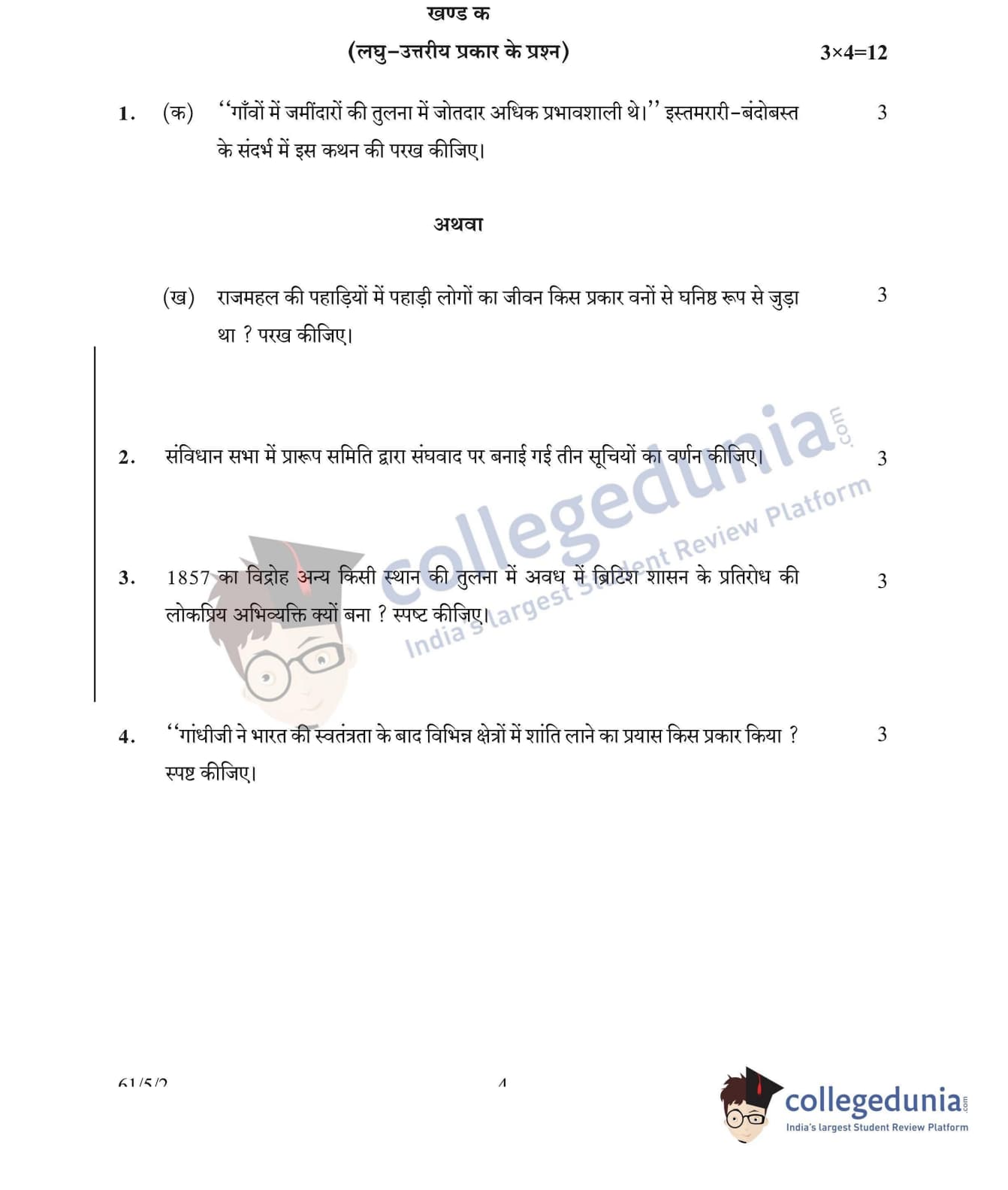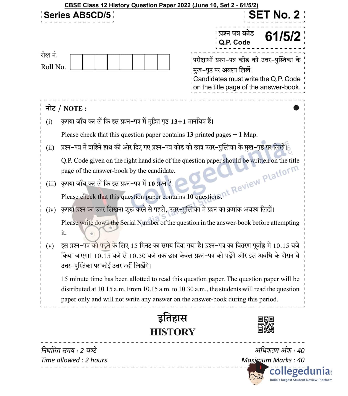 CBSE Class 12 2022 History Question Paper Set 2 - 61/5/2 with Answer Key pdf is available for download. The exam was conducted by Central Board of Secondary Education on June 10, 2022 in the Morning Session 10:30 AM to 12:30 PM. The medium of paper was English & Hindi. In terms of difficulty level, CBSE Class 12 History paper was of Easy level. The question paper comprised a total of 10 questions divided among 4 sections.
