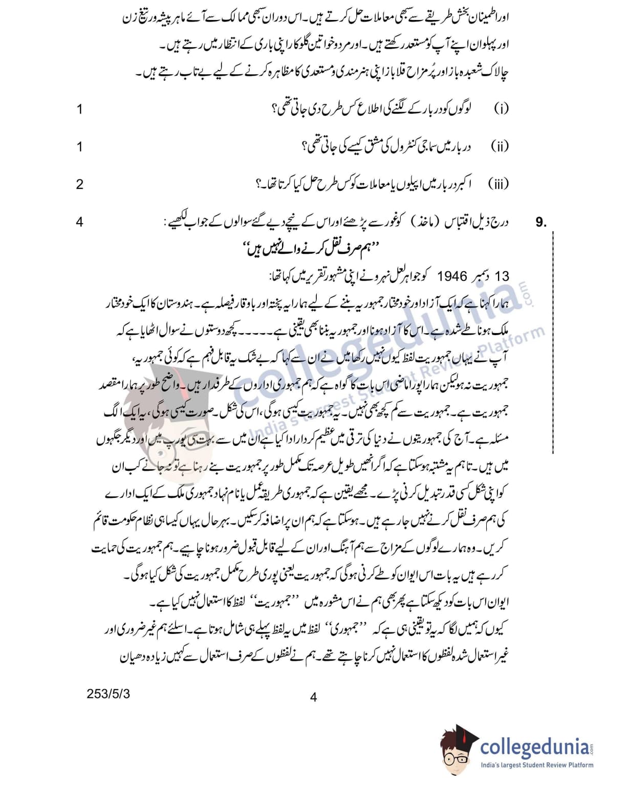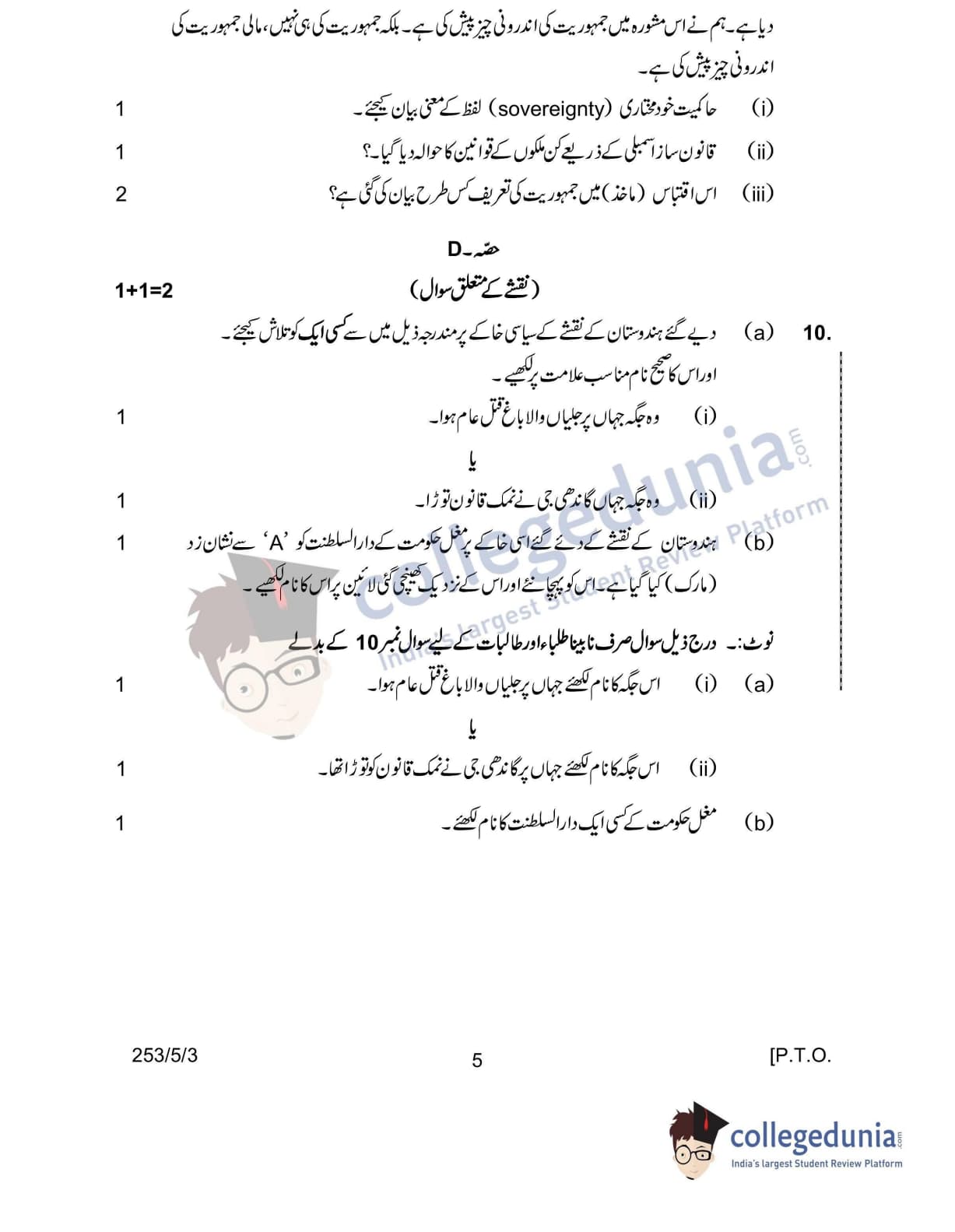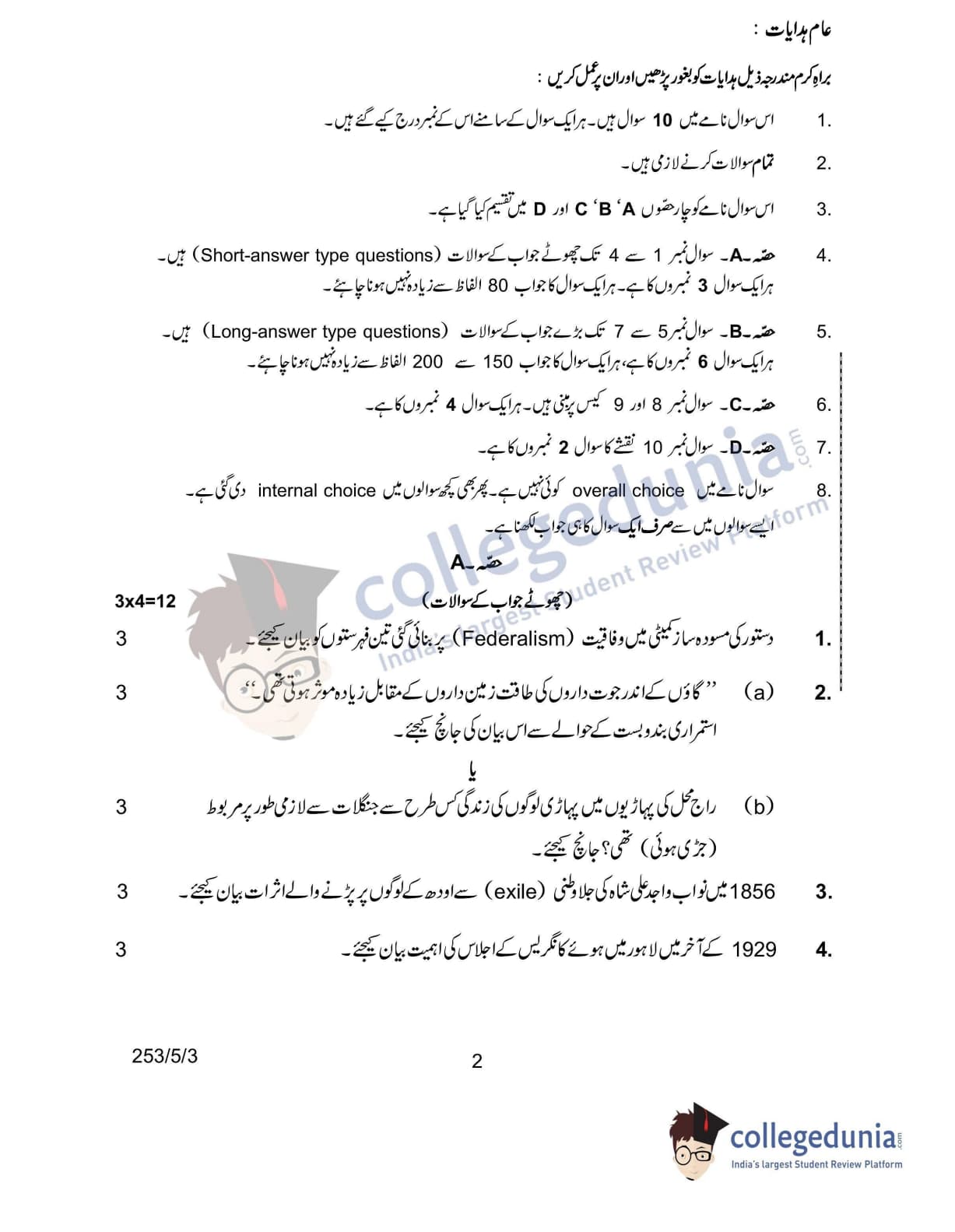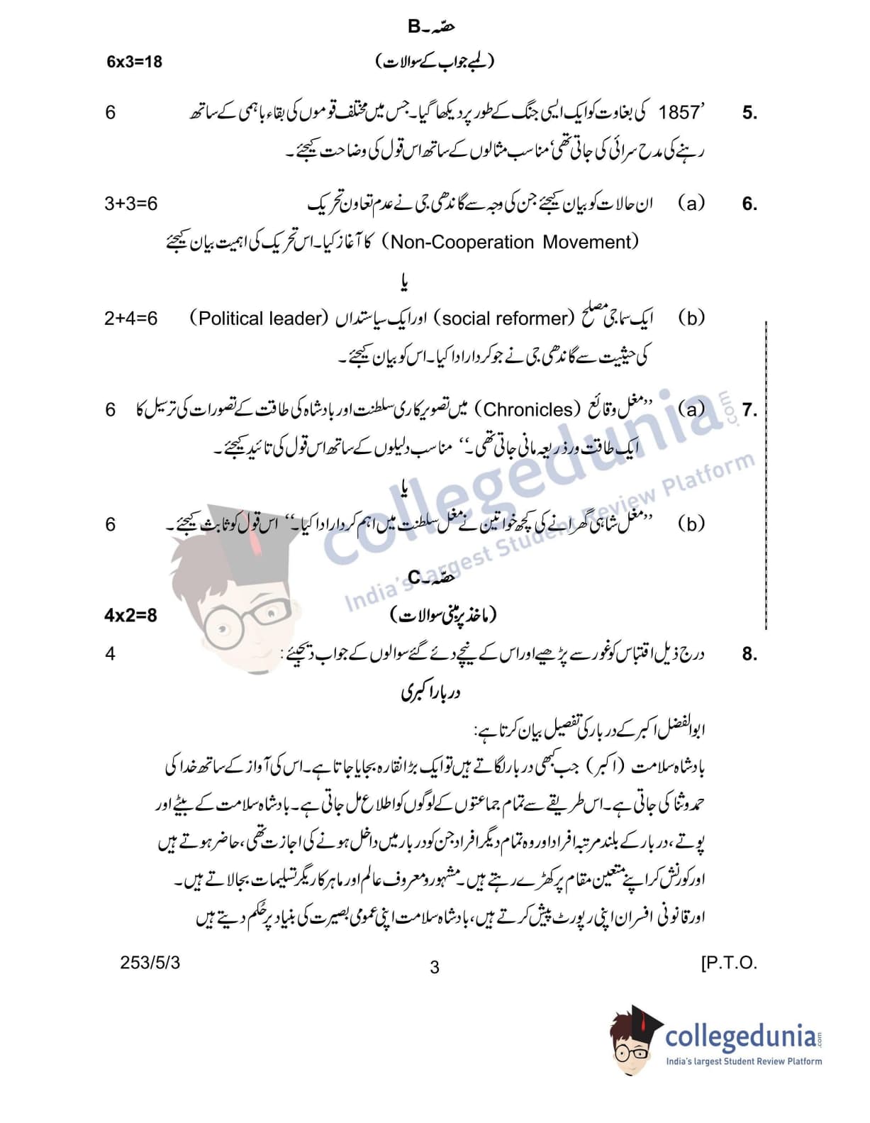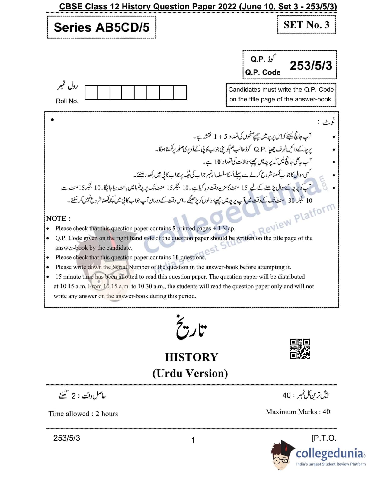 CBSE Class 12 2022 History Question Paper Set 3 - 253/5/3 with Answer Key pdf is available for download. The exam was conducted by Central Board of Secondary Education on June 10, 2022 in the Morning Session 10:30 AM to 12:30 PM. The medium of paper was Urdu. In terms of difficulty level, CBSE Class 12 History paper was of Easy level. The question paper comprised a total of 10 questions divided among 4 sections.
