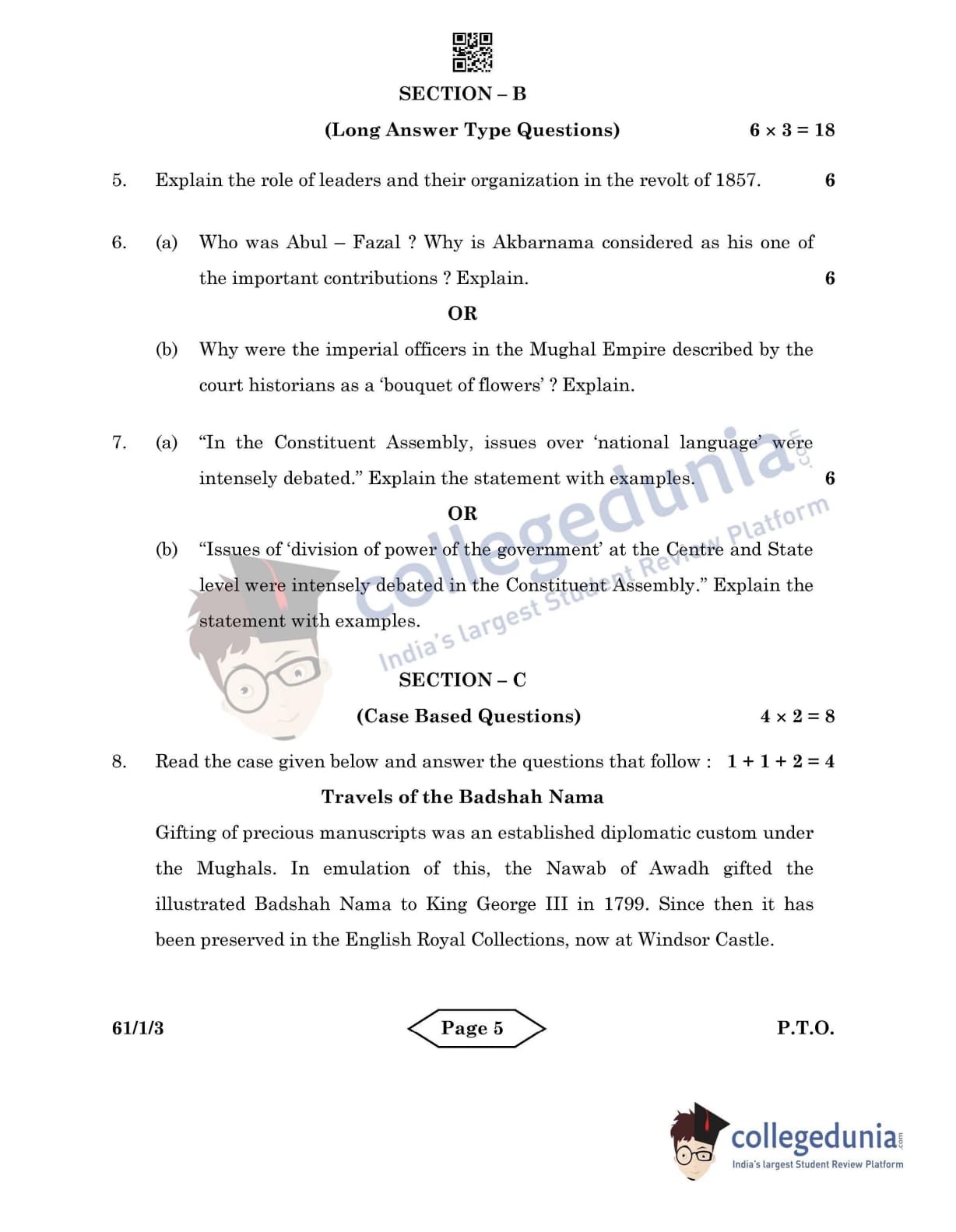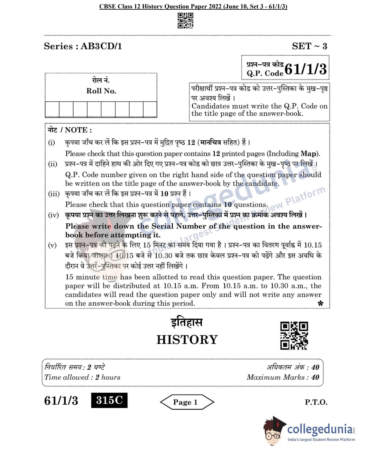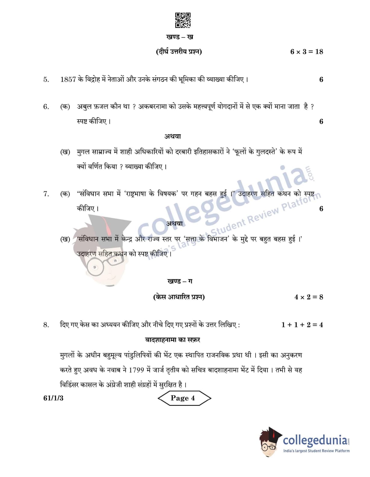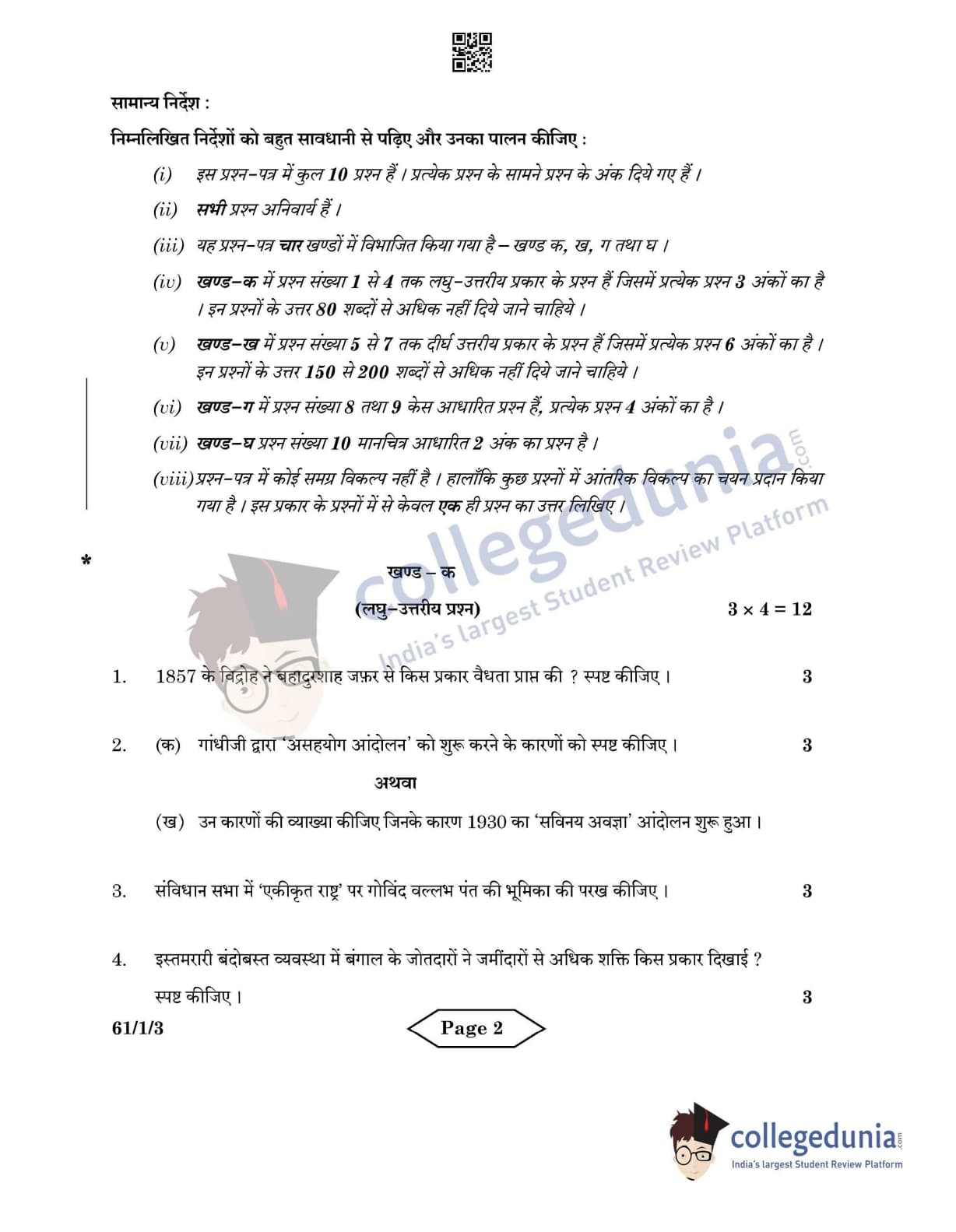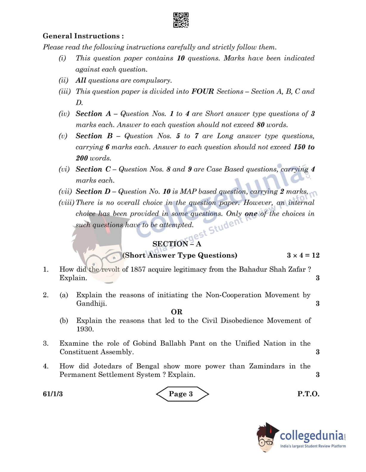 CBSE Class 12 2022 History Question Paper Set 3 - 61/1/3 with Answer Key pdf is available for download. The exam was conducted by Central Board of Secondary Education on June 10, 2022 in the Morning Session 10:30 AM to 12:30 PM. The medium of paper was English & Hindi. In terms of difficulty level, CBSE Class 12 History paper was of Easy level. The question paper comprised a total of 10 questions divided among 4 sections.