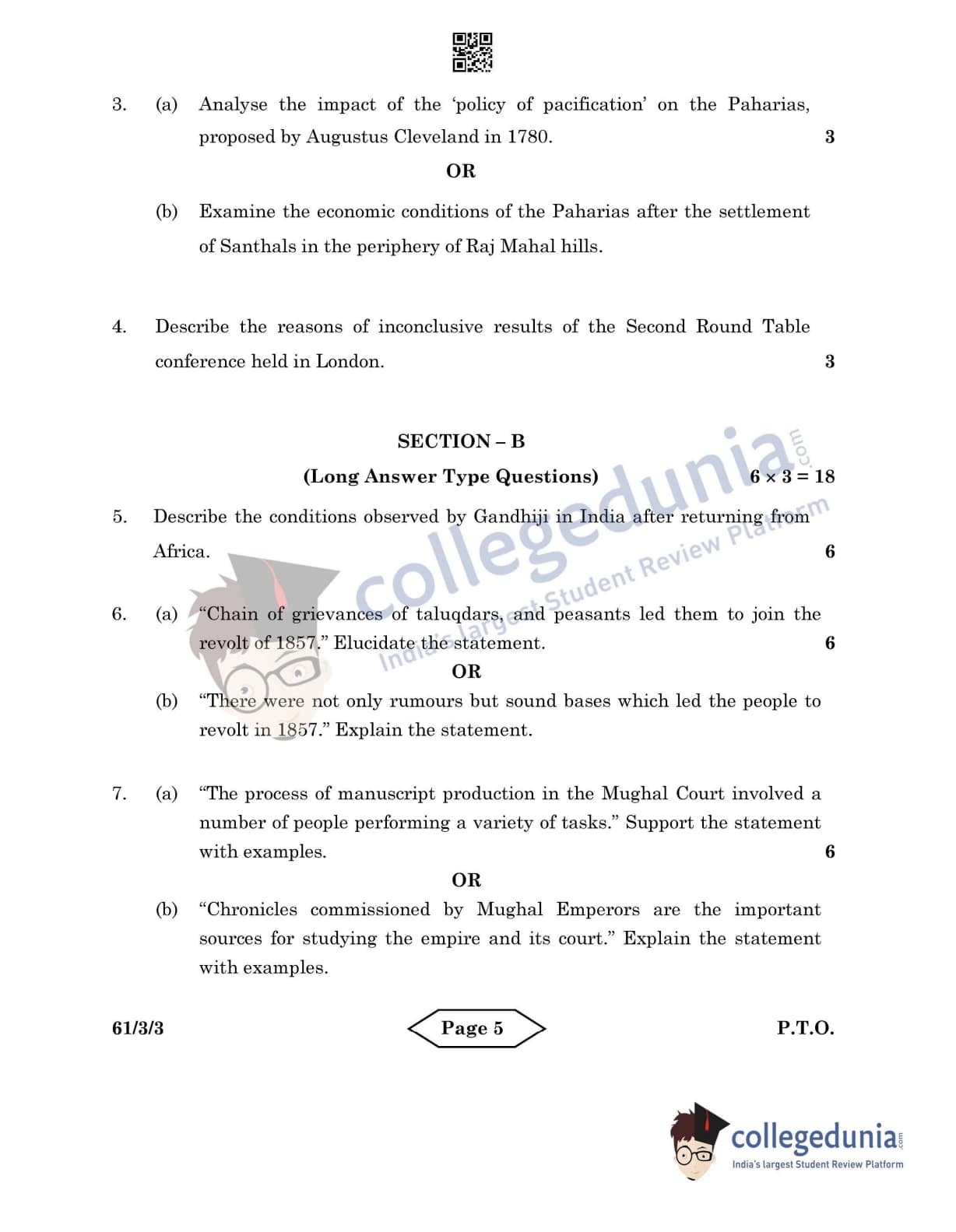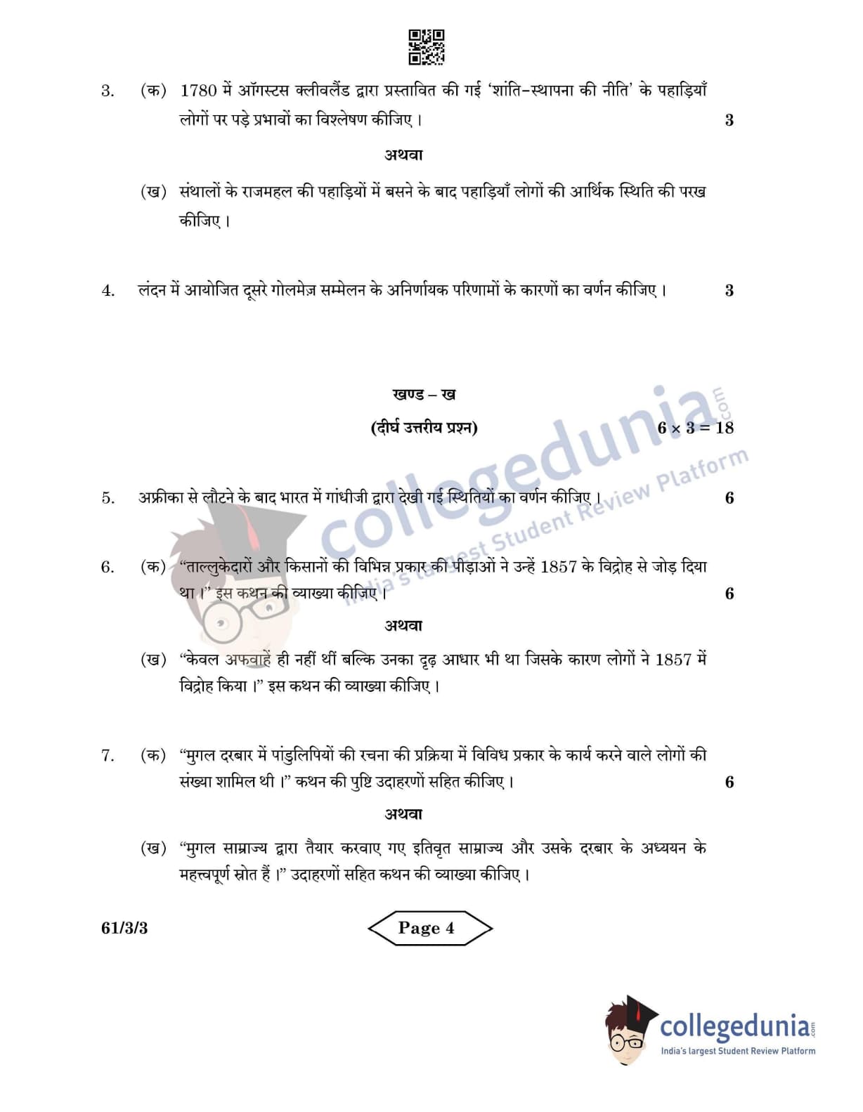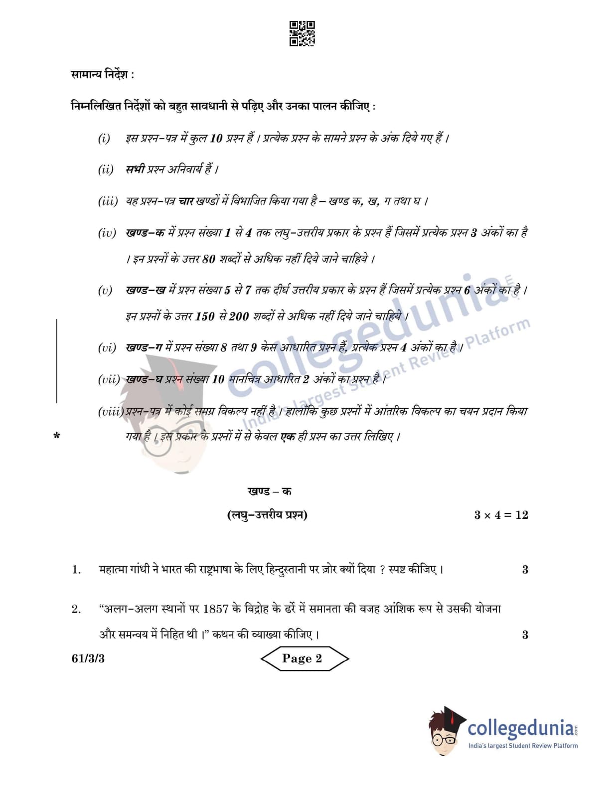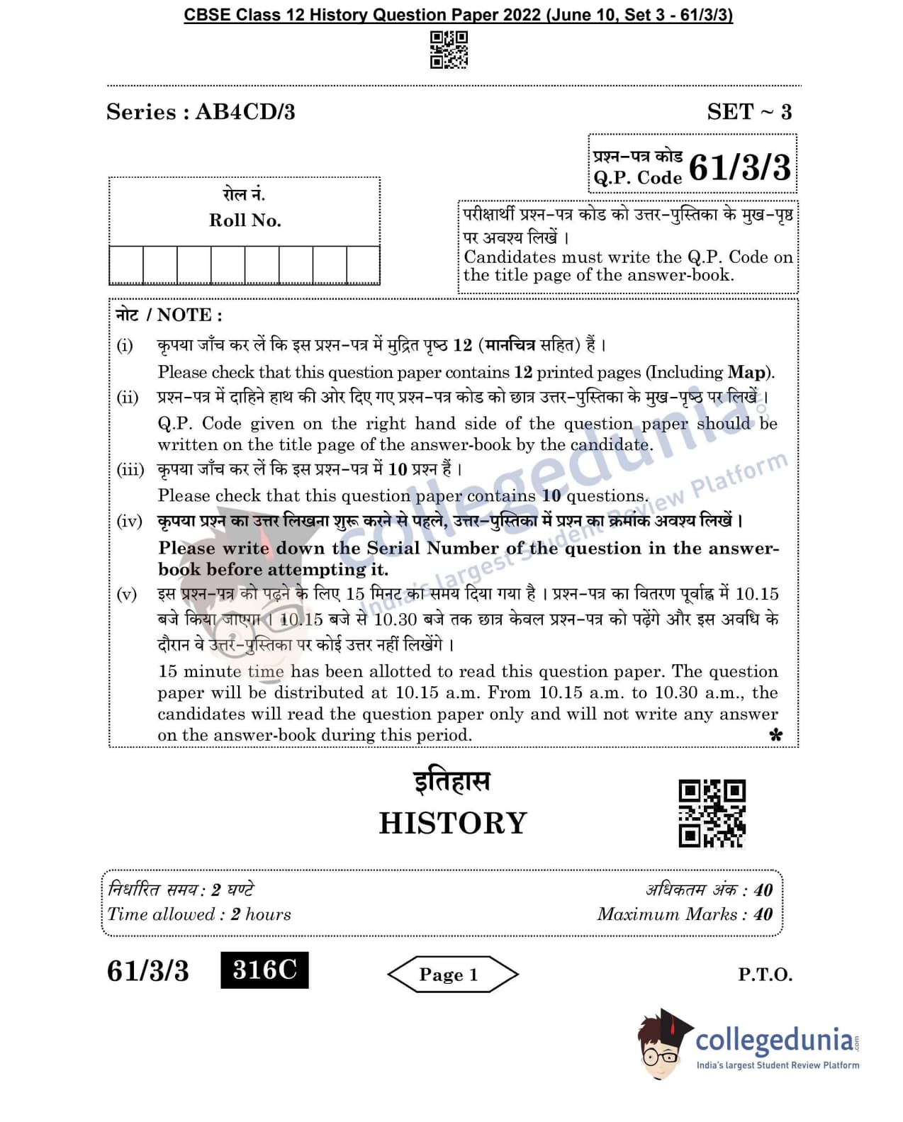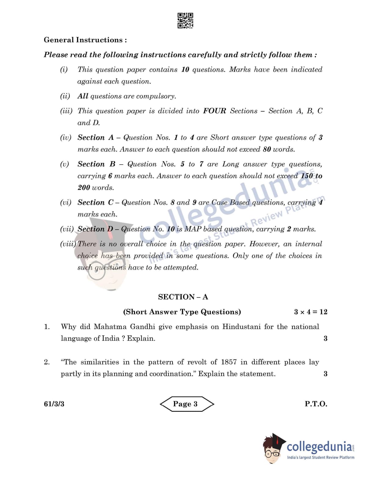 CBSE Class 12 2022 History Question Paper Set 3 - 61/3/3 with Answer Key pdf is available for download. The exam was conducted by Central Board of Secondary Education on June 10, 2022 in the Morning Session 10:30 AM to 12:30 PM. The medium of paper was English & Hindi. In terms of difficulty level, CBSE Class 12 History paper was of Easy level. The question paper comprised a total of 10 questions divided among 4 sections.