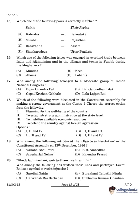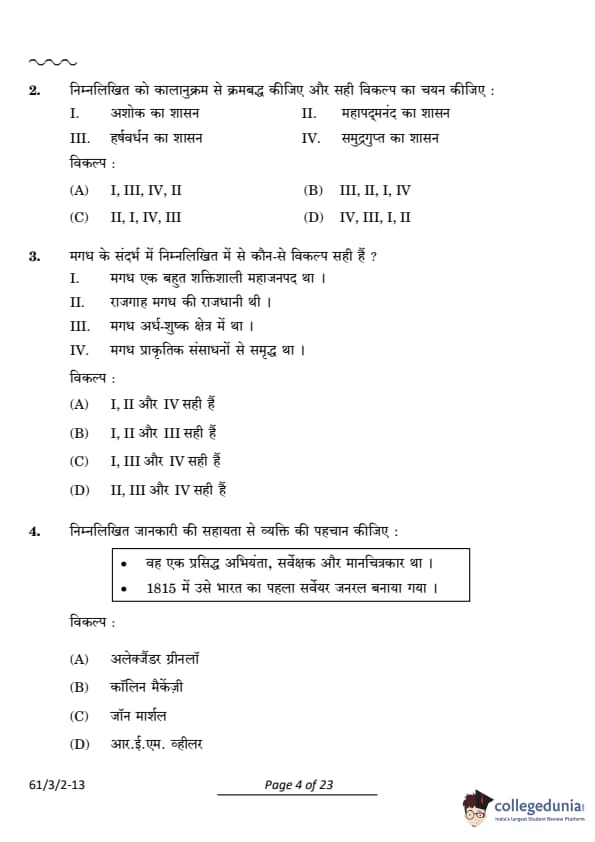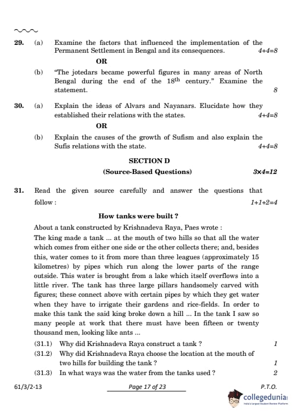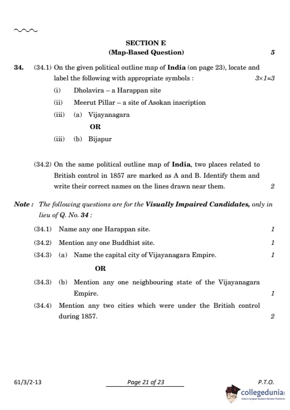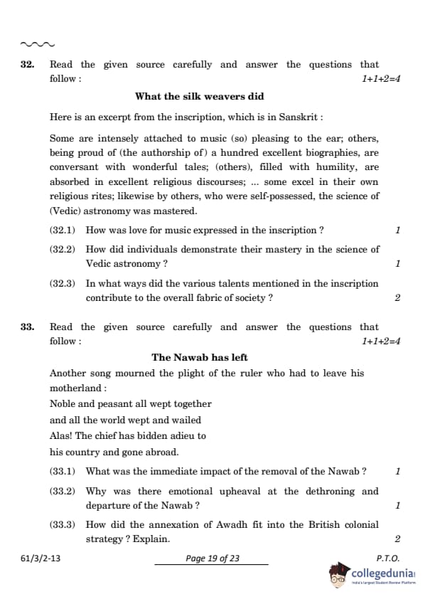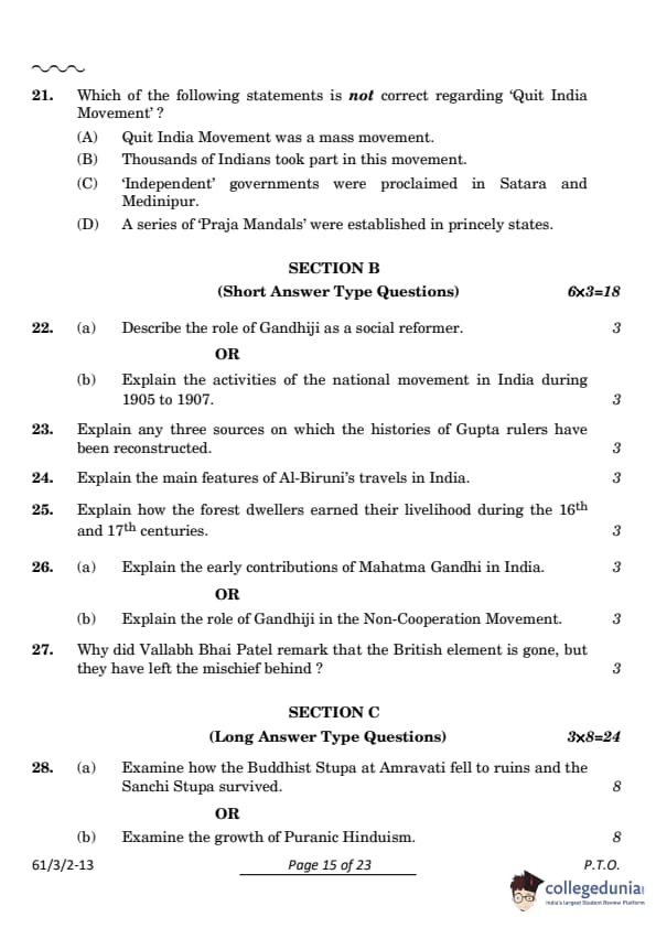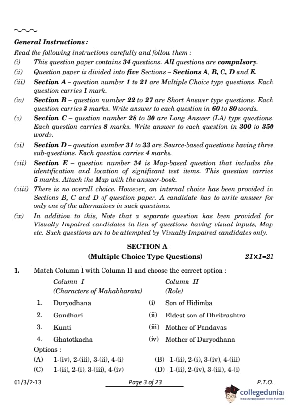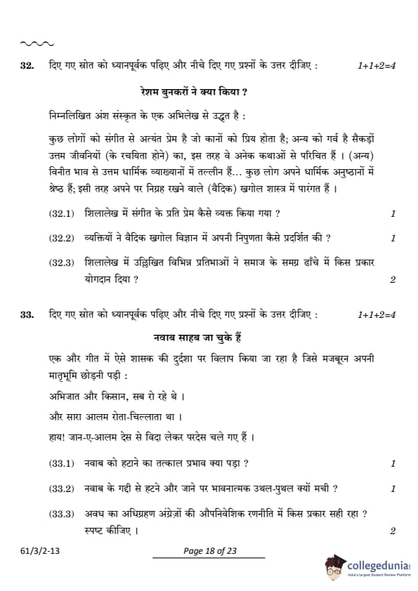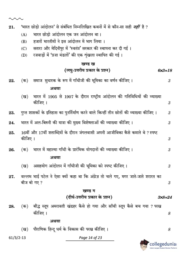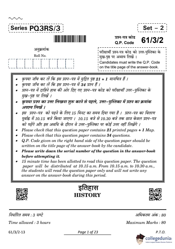 CBSE Class 12 History Set 2 Question Paper PDF (Code: 61/3/2) is now available for download. CBSE conducted the Class 12 History examination on March 28, 2024, from 10:30 AM to 1:30 PM. The question paper consists of 34 questions carrying a total of 80 marks. Section A includes 21 MCQs for 1 mark each, Section B contains 6 short-answer questions for 3 marks each, Section C comprises 3 long-answer questions for 8 marks each, Section D comprises 3 Source-based questions having three sub-questions carries 4 marks each and Section E comprises 1 Map-based question that carries 5 marks.