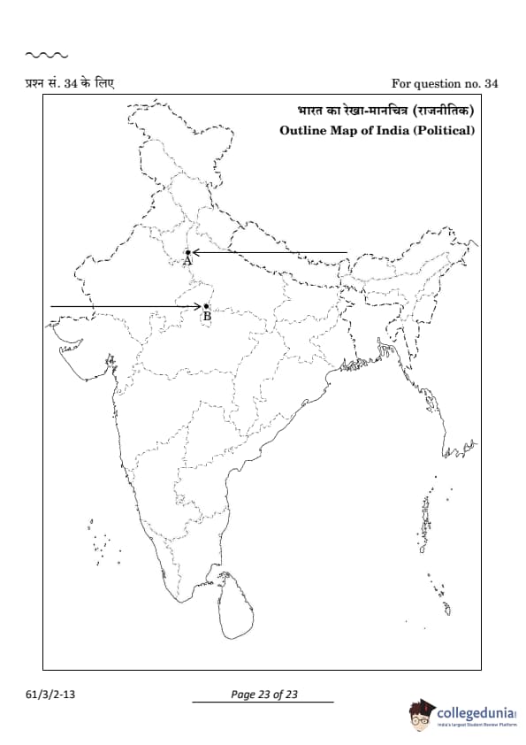 (34.2) On the same political outline map of India, two places related to British control in 1857 are marked as A and B. Identify them and write their correct names on the lines drawn near them.