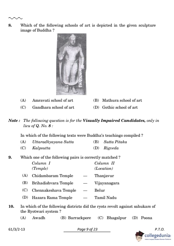 Gandhara School of Art: Gandhara art is known for having a Greco-Roman influence and has figures with wavy hair, well defined facial features, and draped robes that cover the entire body. This is mainly found in the northwestern region.