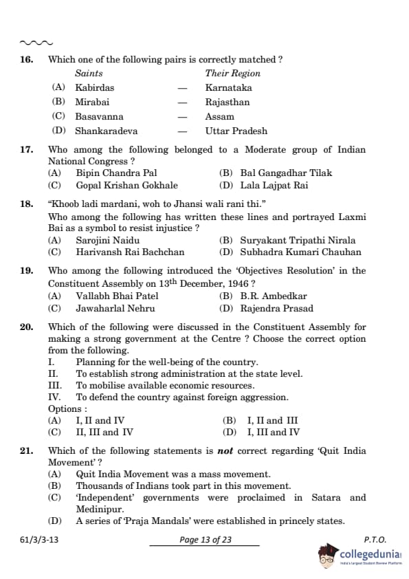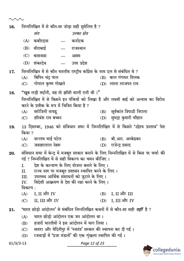 CBSE Class 12 History Set 3 Question Paper PDF (Code: 61/3/3) is now available for download. CBSE conducted the Class 12 History examination on March 28, 2024, from 10:30 AM to 1:30 PM. The question paper consists of 34 questions carrying a total of 80 marks. Section A includes 21 MCQs for 1 mark each, Section B contains 6 short-answer questions for 3 marks each, Section C comprises 3 long-answer questions for 8 marks each, Section D comprises 3 Source-based questions having three sub-questions carries 4 marks each and Section E comprises 1 Map-based question that carries 5 marks.