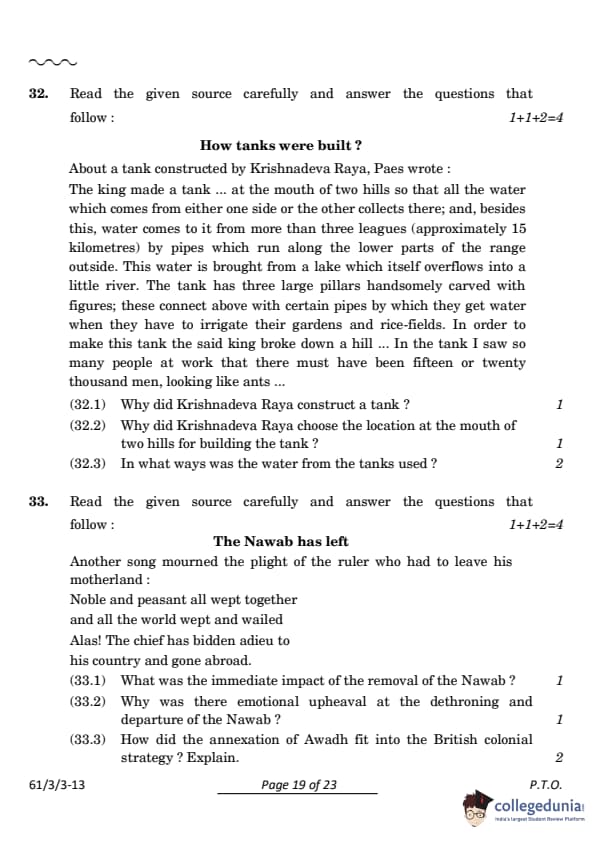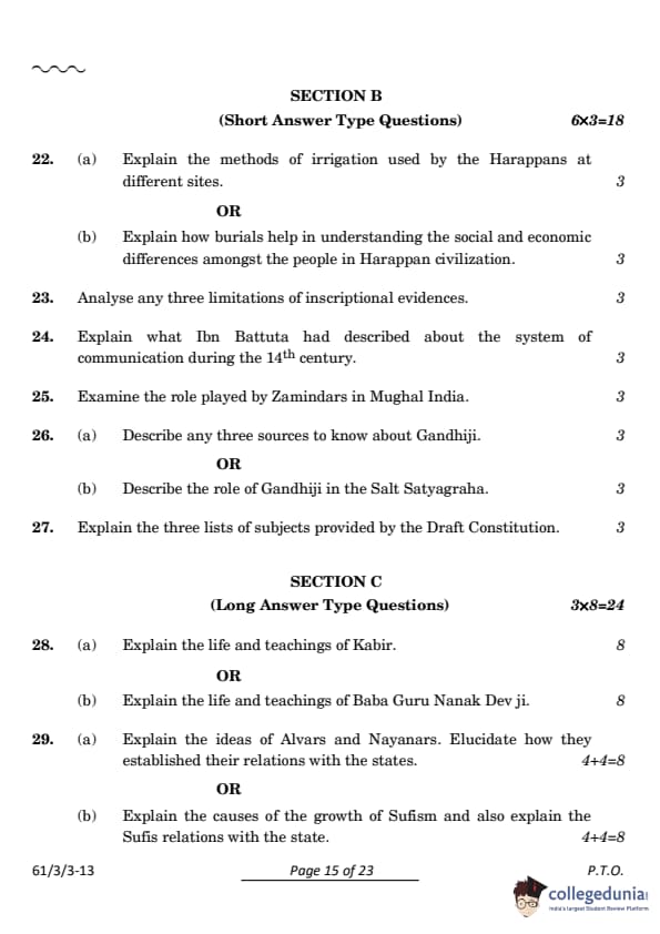 CBSE Class 12 History Question Paper 2024 (Set 3- 61/3/3) with Answer Key