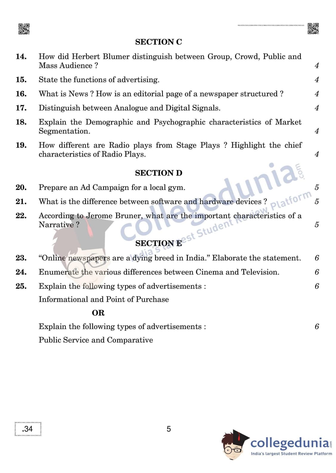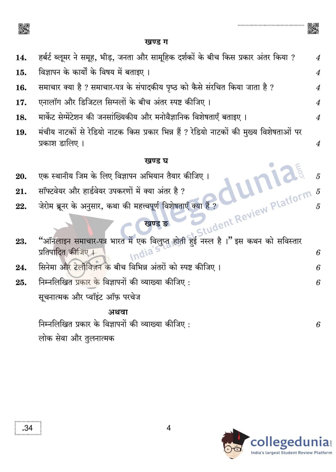 CBSE Class 12 Mass Media Studies (Old) Question Paper 2020 with Answer Key Set 4 is available for download. The exam was conducted by the Central Board of Secondary Education on February 15, 2020 in the Morning Session 10:30 AM to 1:30 PM. The medium of paper was English & Hindi. The question paper comprised a total of 25 questions divided among 5 sections.
