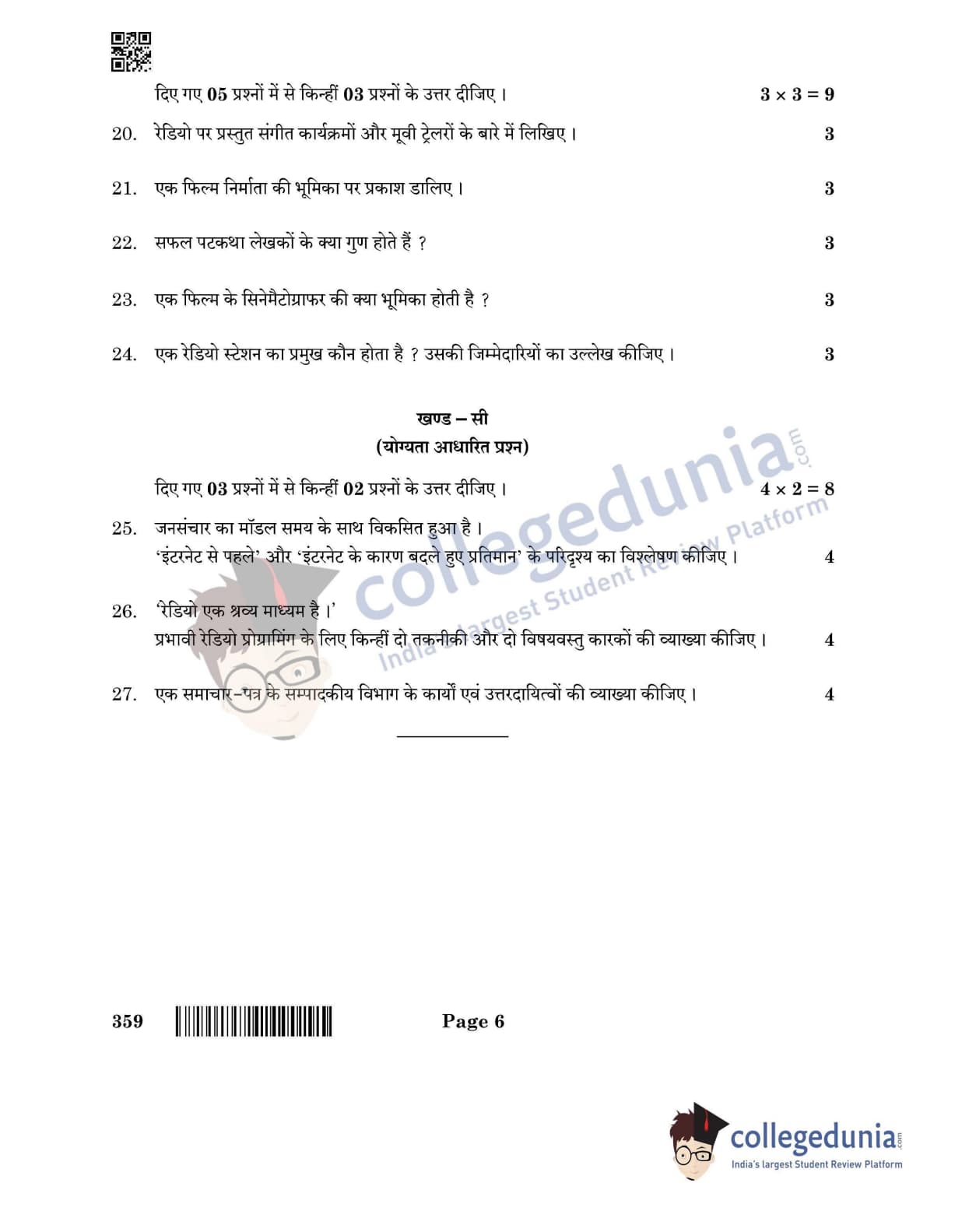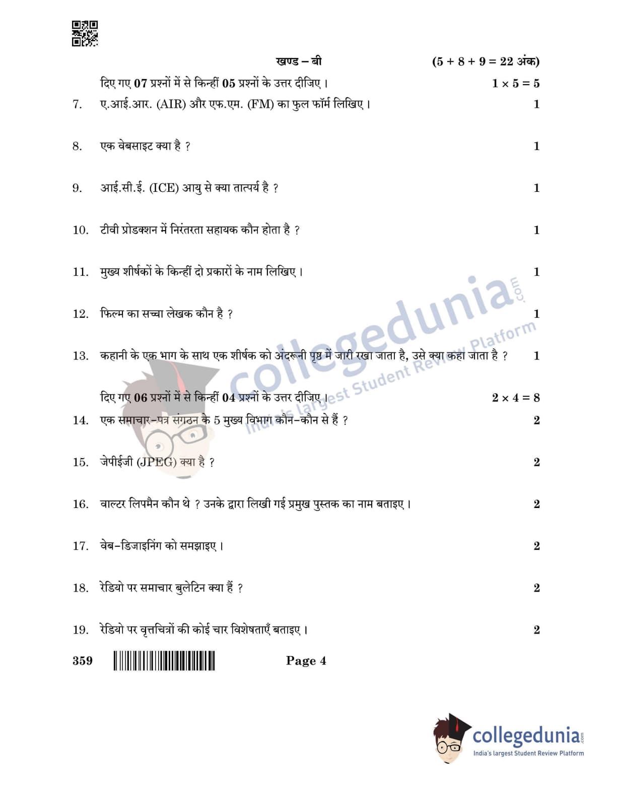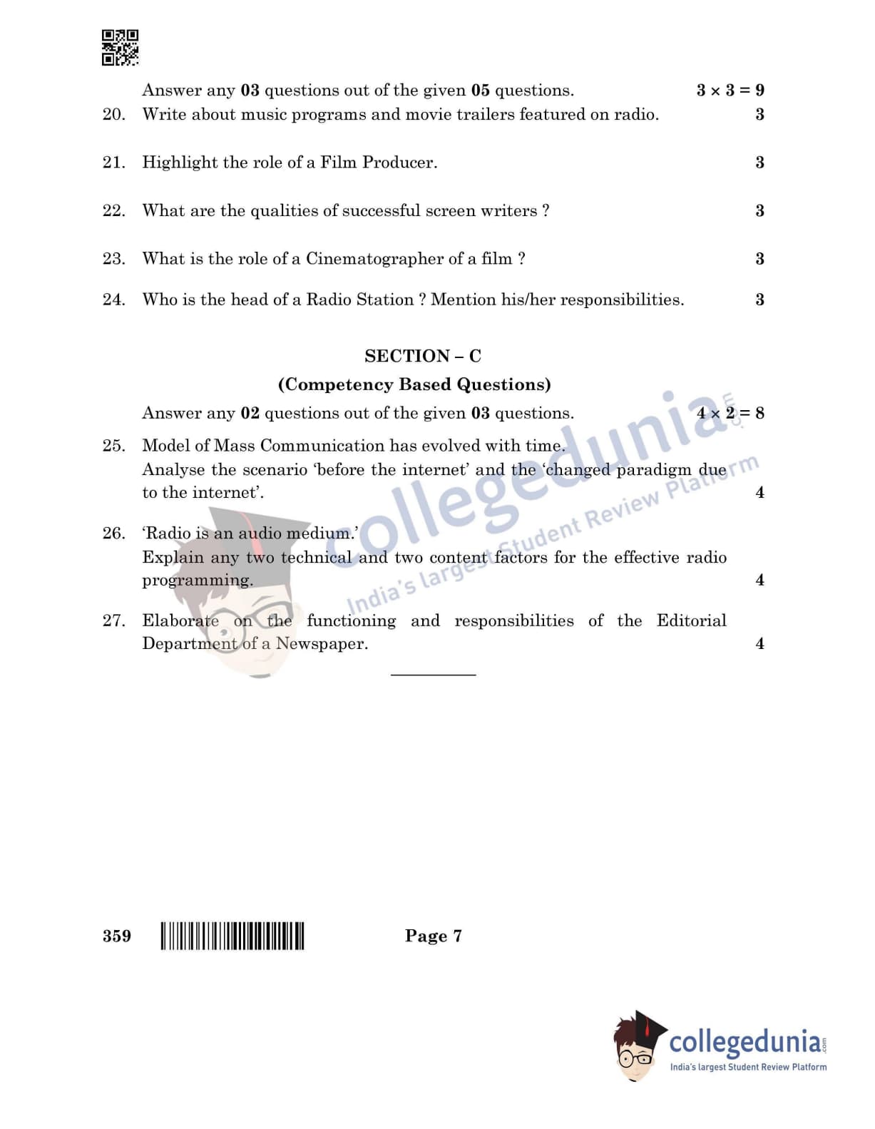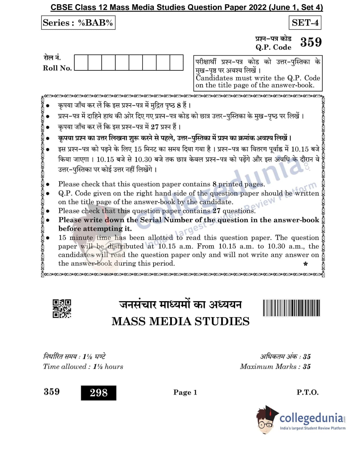 CBSE Class 12 2022 Mass Media Studies Question Paper Set 4 with Answer Key pdf is available for download. The exam was conducted by Central Board of Secondary Education on June 1, 2022 in the Morning Session 10:30 AM to 12:00 PM. The medium of paper was English & Hindi. In terms of difficulty level, CBSE Class 12 Mass Media Studies paper was of Moderate level. The question paper comprised a total of 27 questions divided among 3 sections.