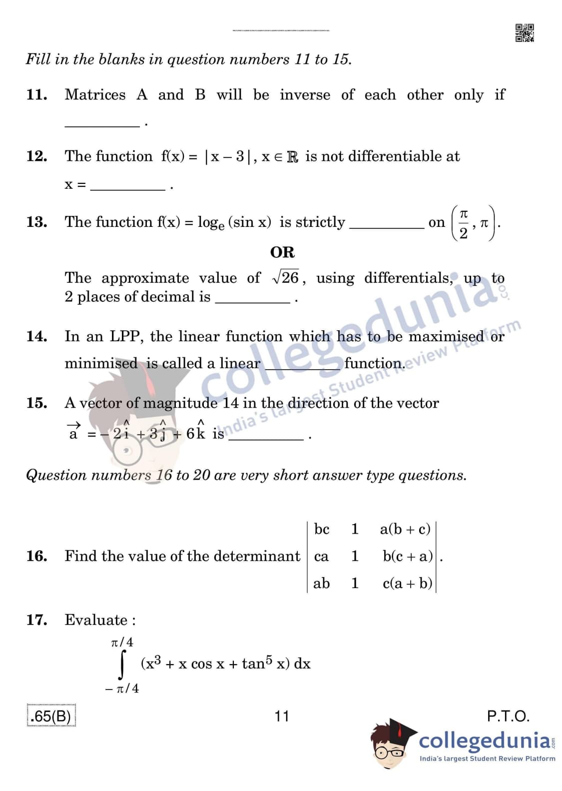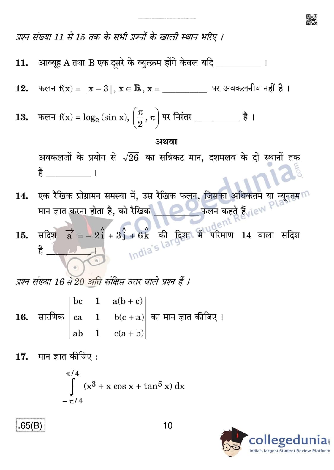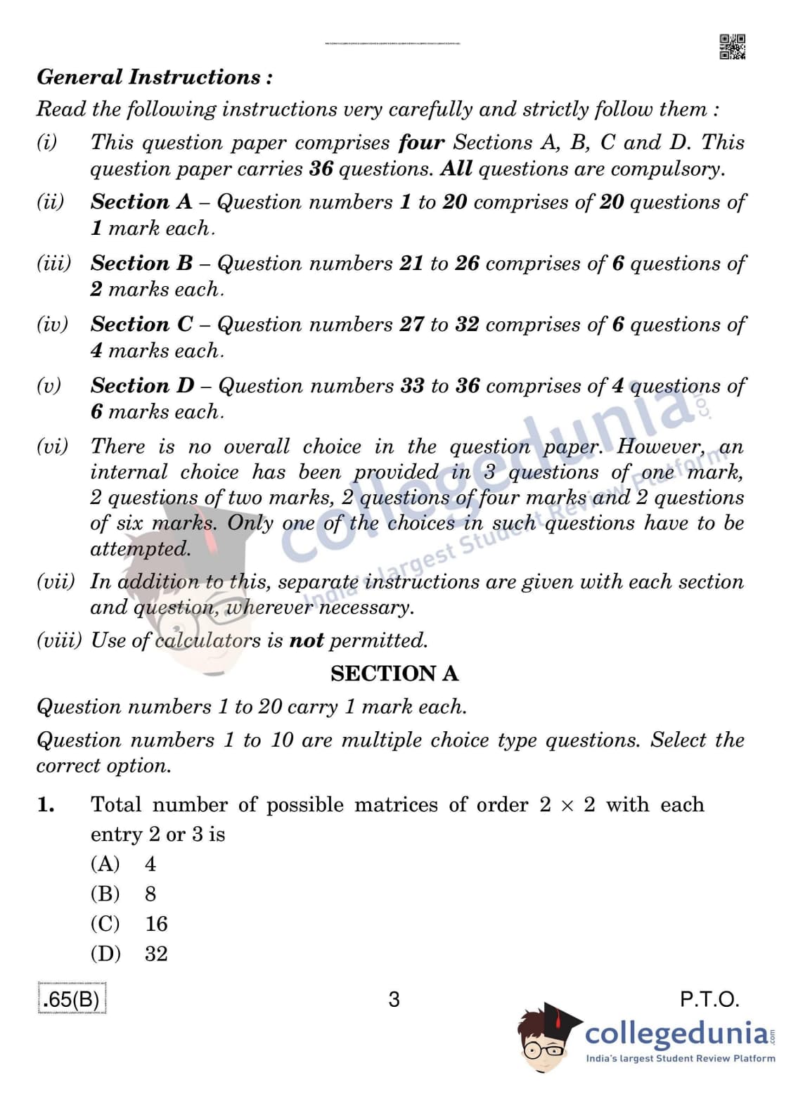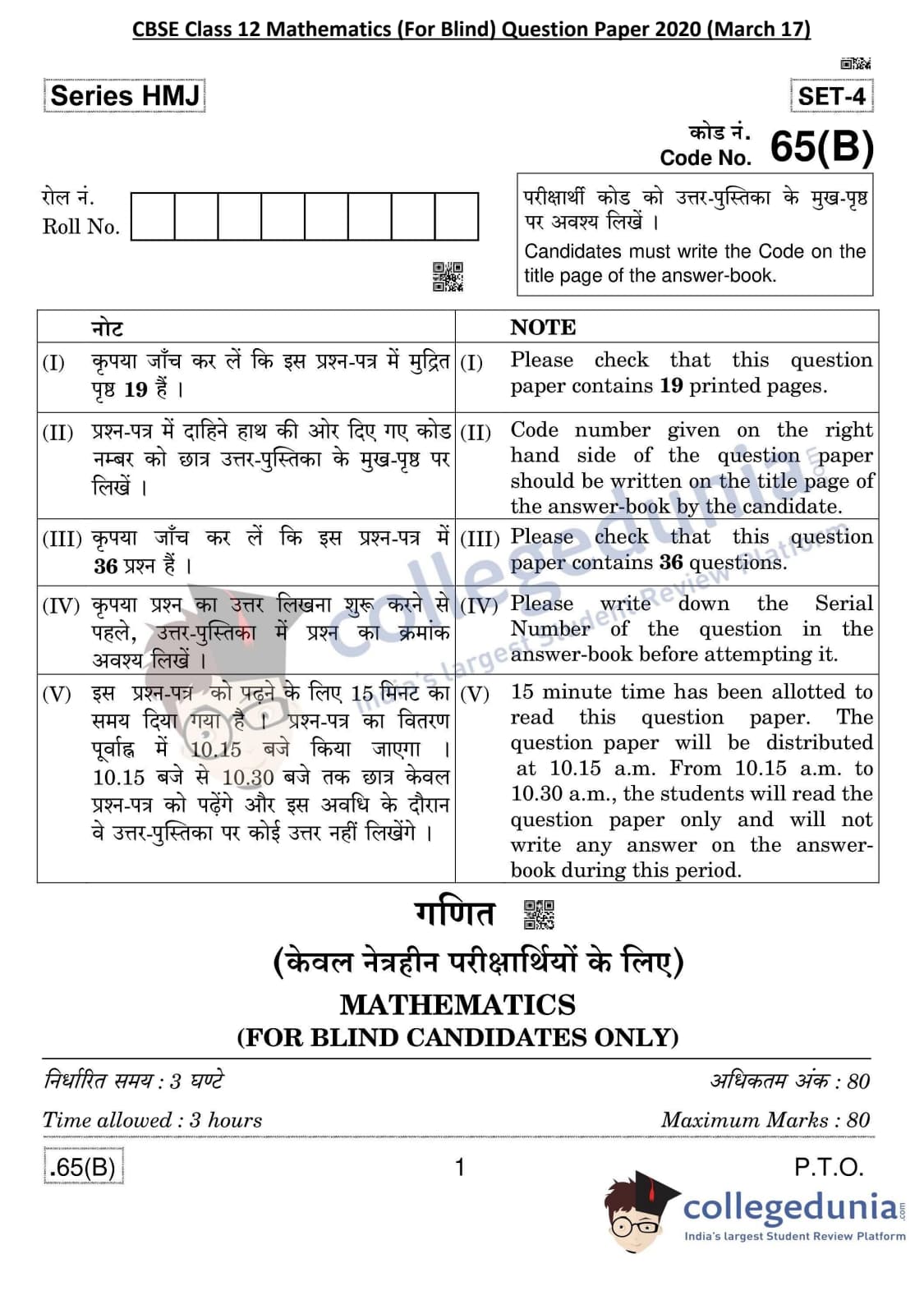 CBSE Class 12 Mathematics (For Blind) Question Paper 2020 with Answer Key Set 4 - 65/B is available for download. The exam was conducted by the Central Board of Secondary Education on March 17, 2020 in the Morning Session 10:30 AM to 1:30 PM. The medium of paper was English & Hindi. In terms of difficulty level, CBSE Class 12 Mathematics paper was of Moderate level. The question paper comprised a total of 36 questions divided among 4 sections.