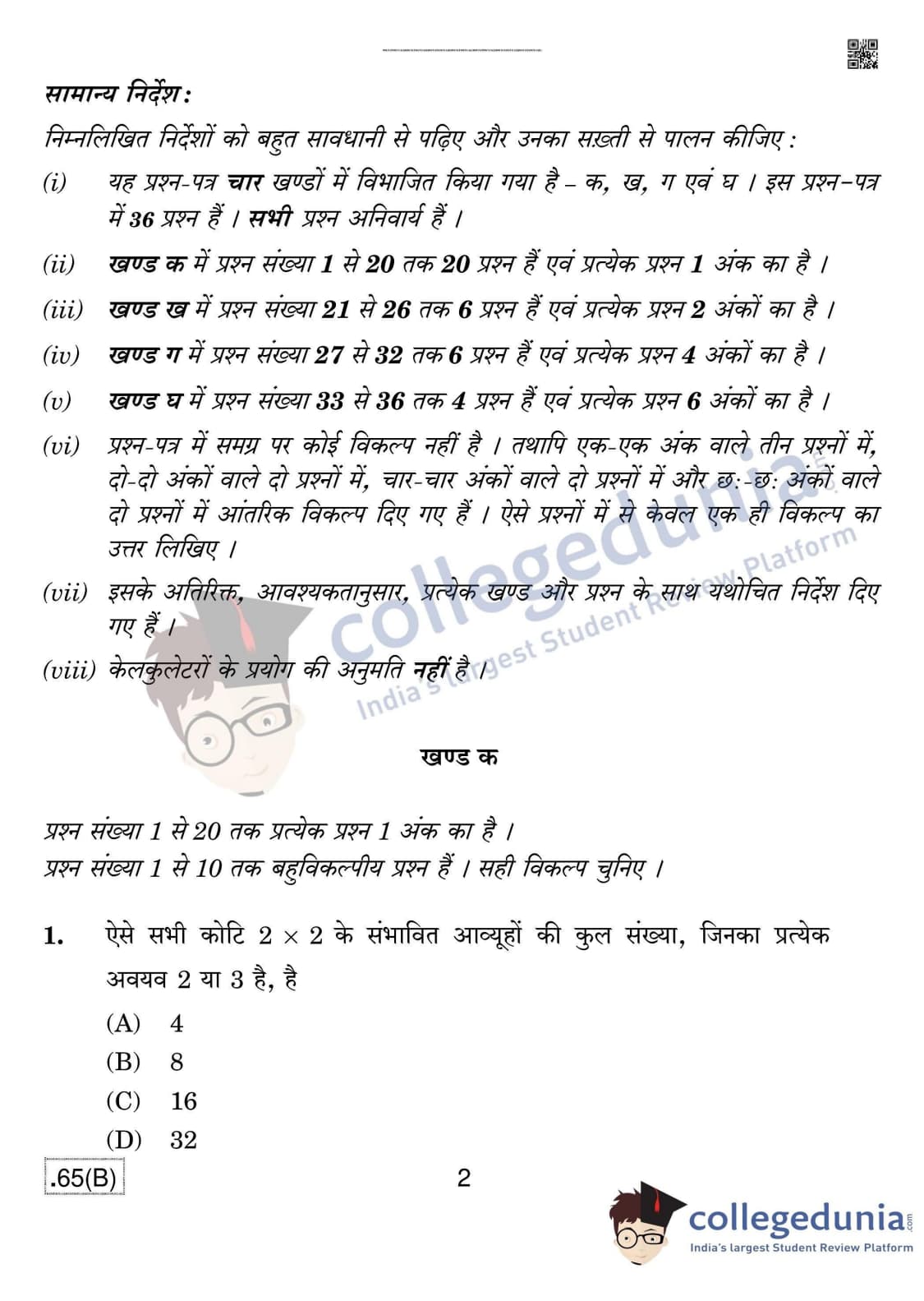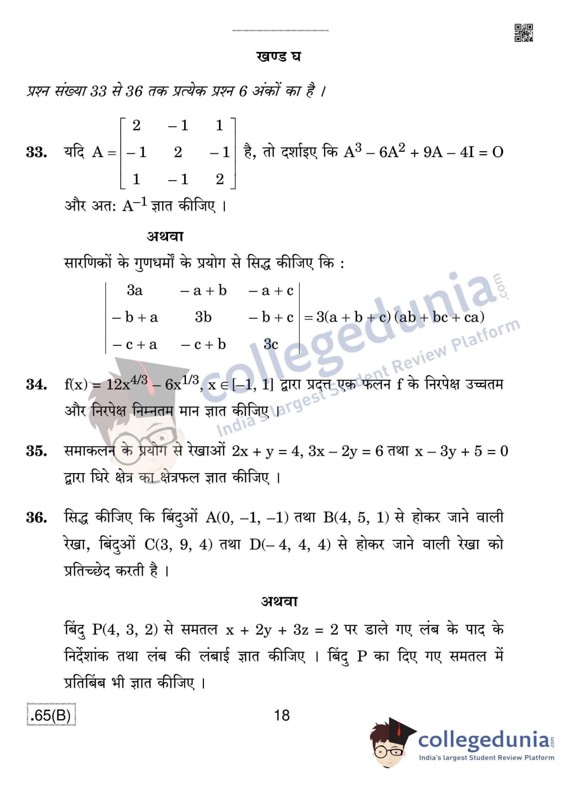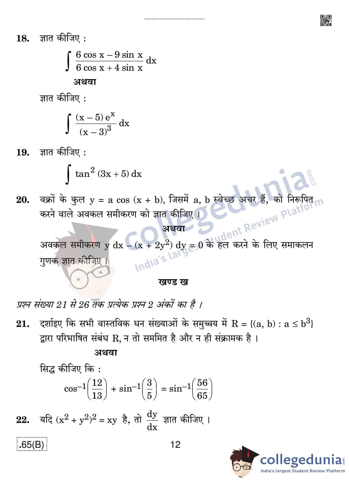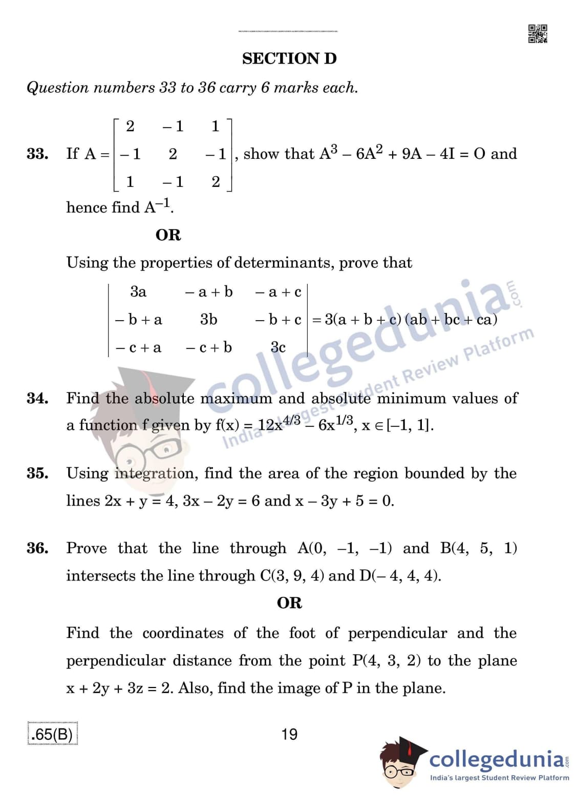 CBSE Class 12 Mathematics (For Blind) Question Paper 2020 with Answer Key Set 4 - 65/B is available for download. The exam was conducted by the Central Board of Secondary Education on March 17, 2020 in the Morning Session 10:30 AM to 1:30 PM. The medium of paper was English & Hindi. In terms of difficulty level, CBSE Class 12 Mathematics paper was of Moderate level. The question paper comprised a total of 36 questions divided among 4 sections.