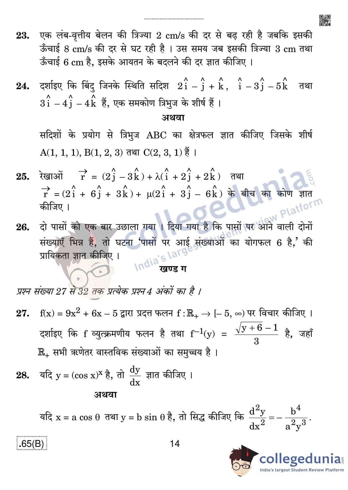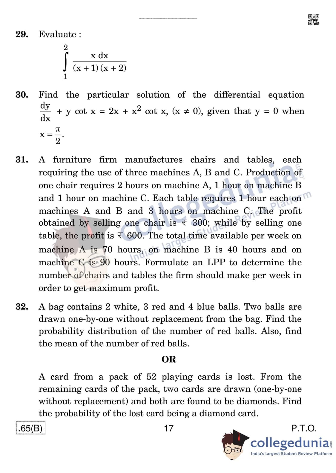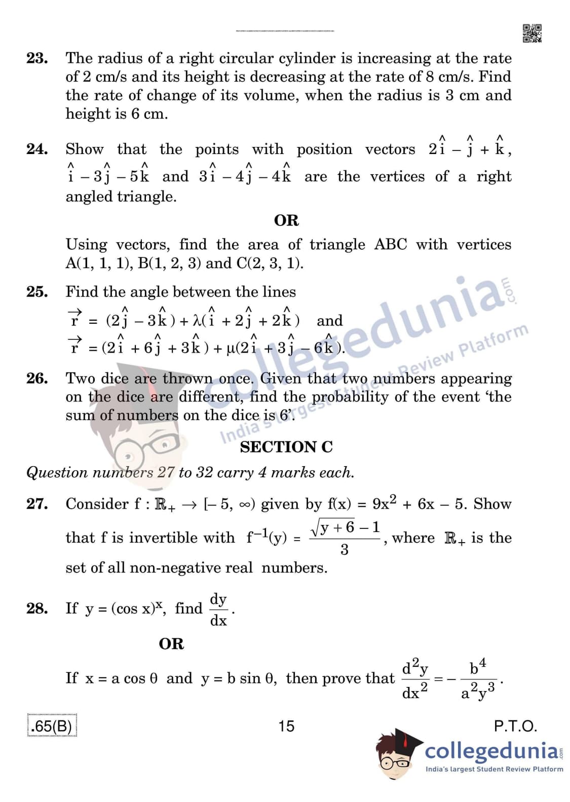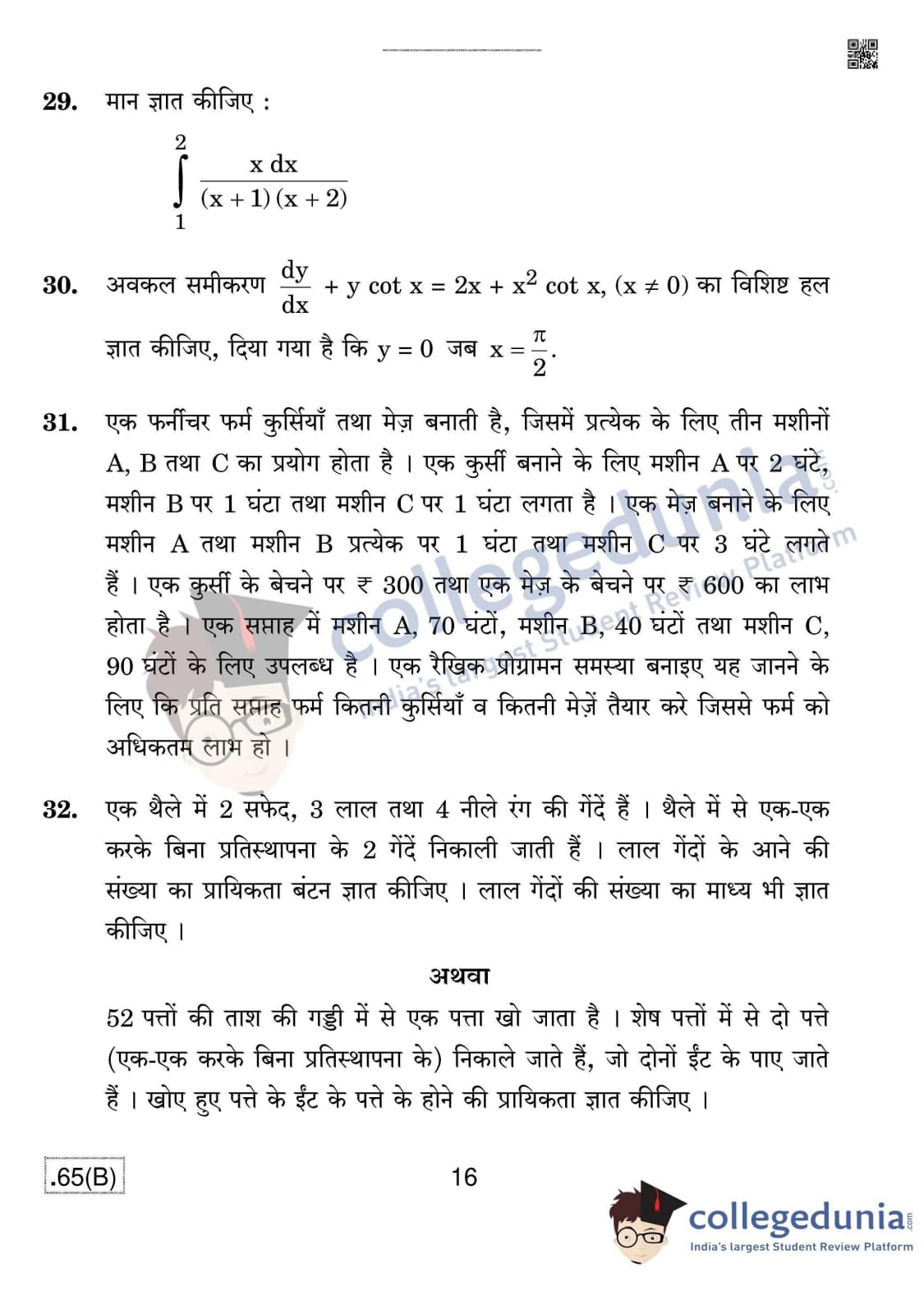 CBSE Class 12 Mathematics (For Blind) Question Paper 2020 with Answer Key Set 4 - 65/B is available for download. The exam was conducted by the Central Board of Secondary Education on March 17, 2020 in the Morning Session 10:30 AM to 1:30 PM. The medium of paper was English & Hindi. In terms of difficulty level, CBSE Class 12 Mathematics paper was of Moderate level. The question paper comprised a total of 36 questions divided among 4 sections.