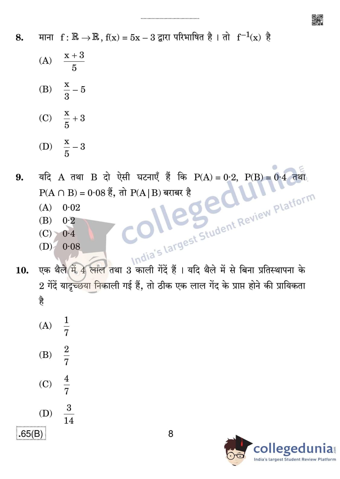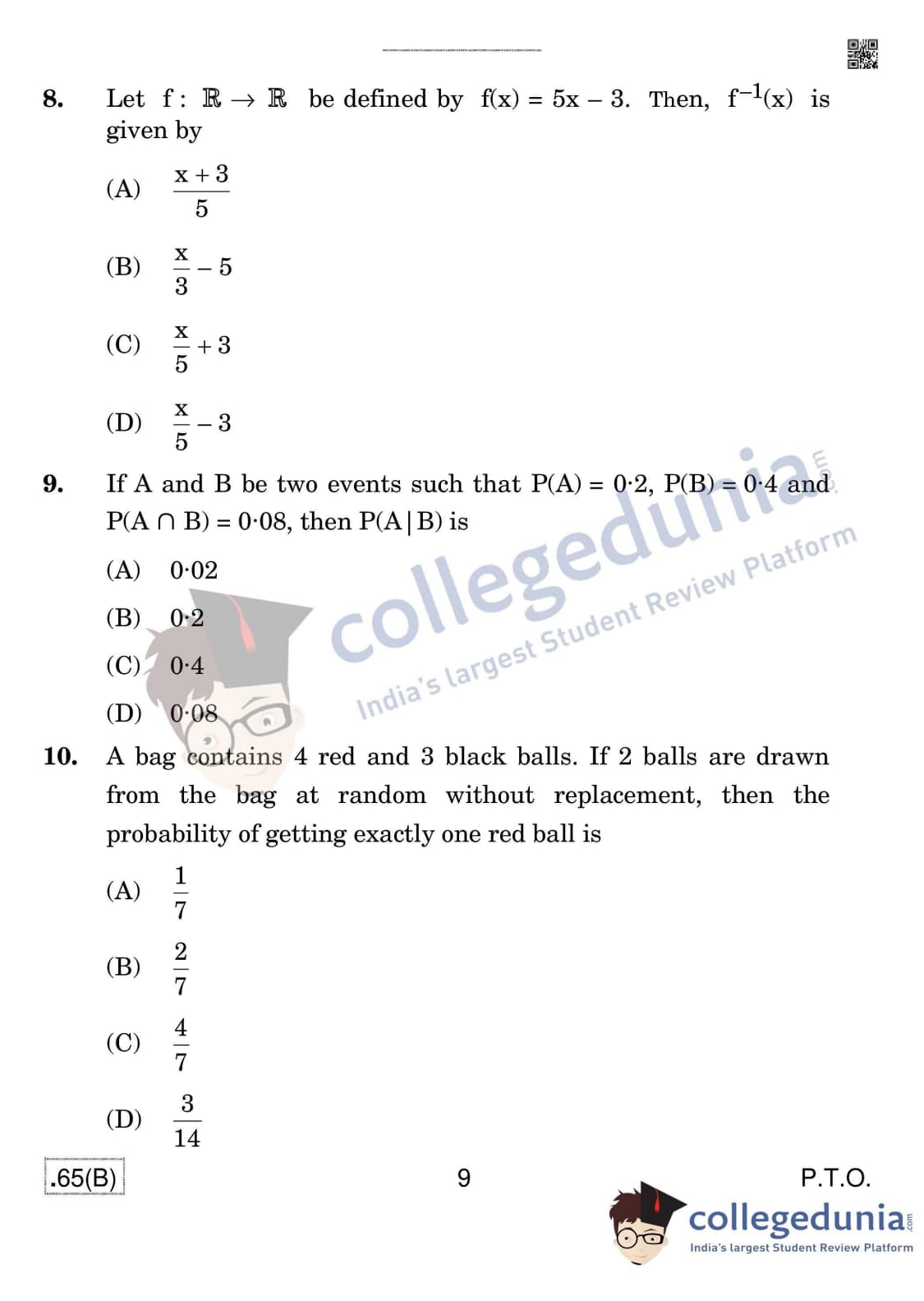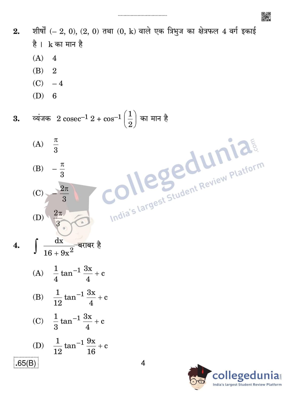 CBSE Class 12 Mathematics (For Blind) Set 4 - 65/B Question Paper 2020 with Answer Key (March 17)