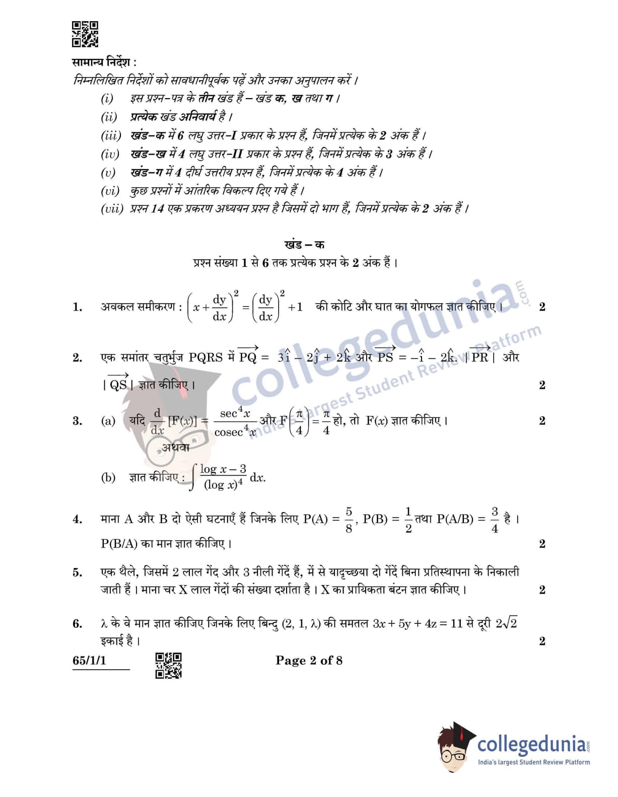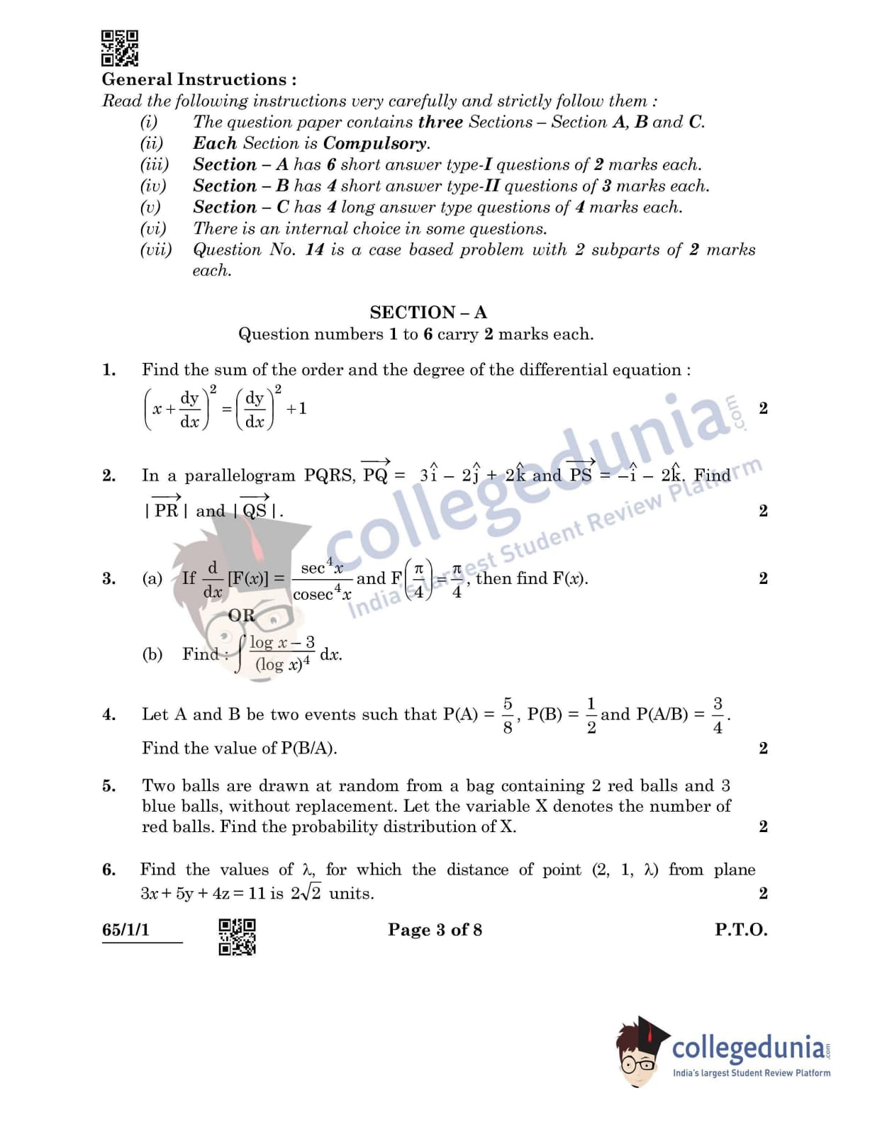 CBSE Class 12 2022 Mathematics Question Paper Set 1 - 65/1/1 with Answer Key pdf is available for download. The exam was conducted by Central Board of Secondary Education on June 7, 2022 in the Morning Session 10:30 AM to 12:30 PM. The medium of paper was English & Hindi. In terms of difficulty level, CBSE Class 12 Mathematics paper was of Moderate level. The question paper comprised a total of 14 questions divided among 3 sections.