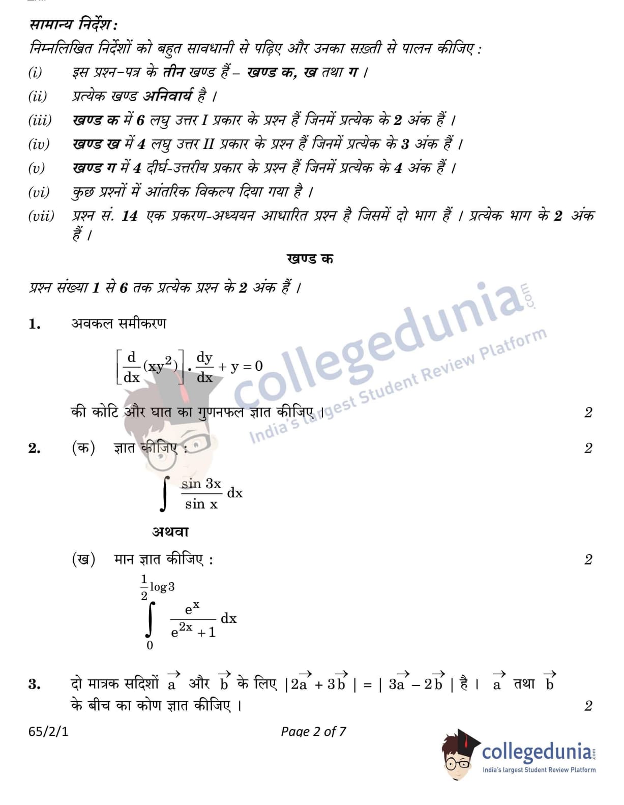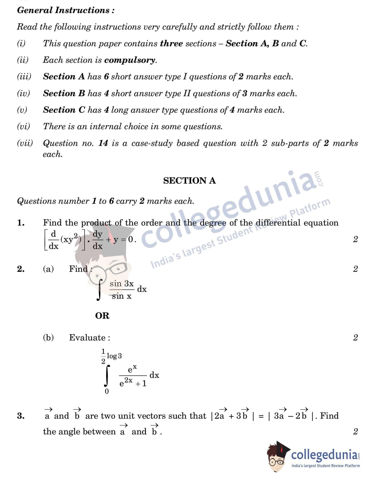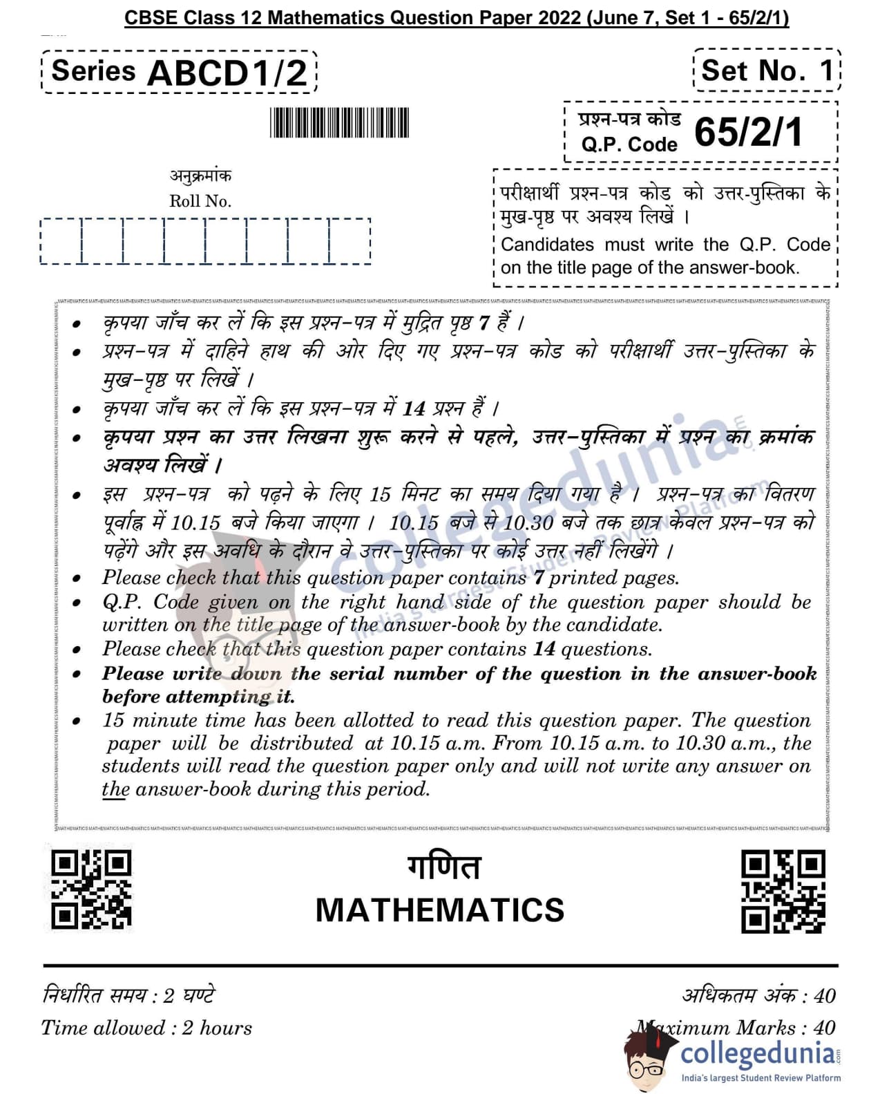 CBSE Class 12 2022 Mathematics Question Paper Set 1 - 65/2/1 with Answer Key pdf is available for download. The exam was conducted by Central Board of Secondary Education on June 7, 2022 in the Morning Session 10:30 AM to 12:30 PM. The medium of paper was English & Hindi. In terms of difficulty level, CBSE Class 12 Mathematics paper was of Moderate level. The question paper comprised a total of 14 questions divided among 3 sections.
