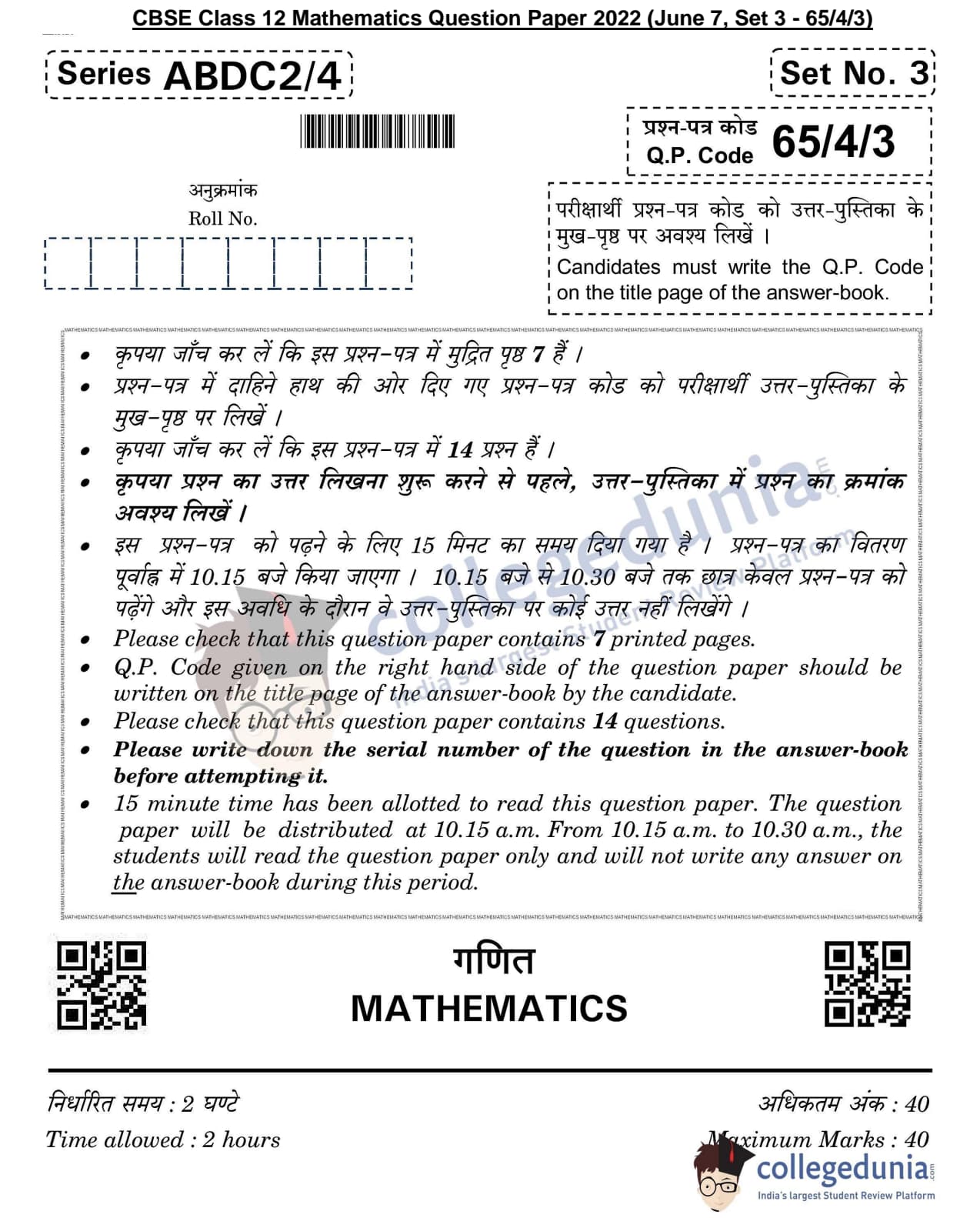 CBSE Class 12 2022 Mathematics Question Paper Set 3 - 65/4/3 with Answer Key pdf is available for download. The exam was conducted by Central Board of Secondary Education on June 7, 2022 in the Morning Session 10:30 AM to 12:30 PM. The medium of paper was English & Hindi. In terms of difficulty level, CBSE Class 12 Mathematics paper was of Moderate level. The question paper comprised a total of 14 questions divided among 3 sections.