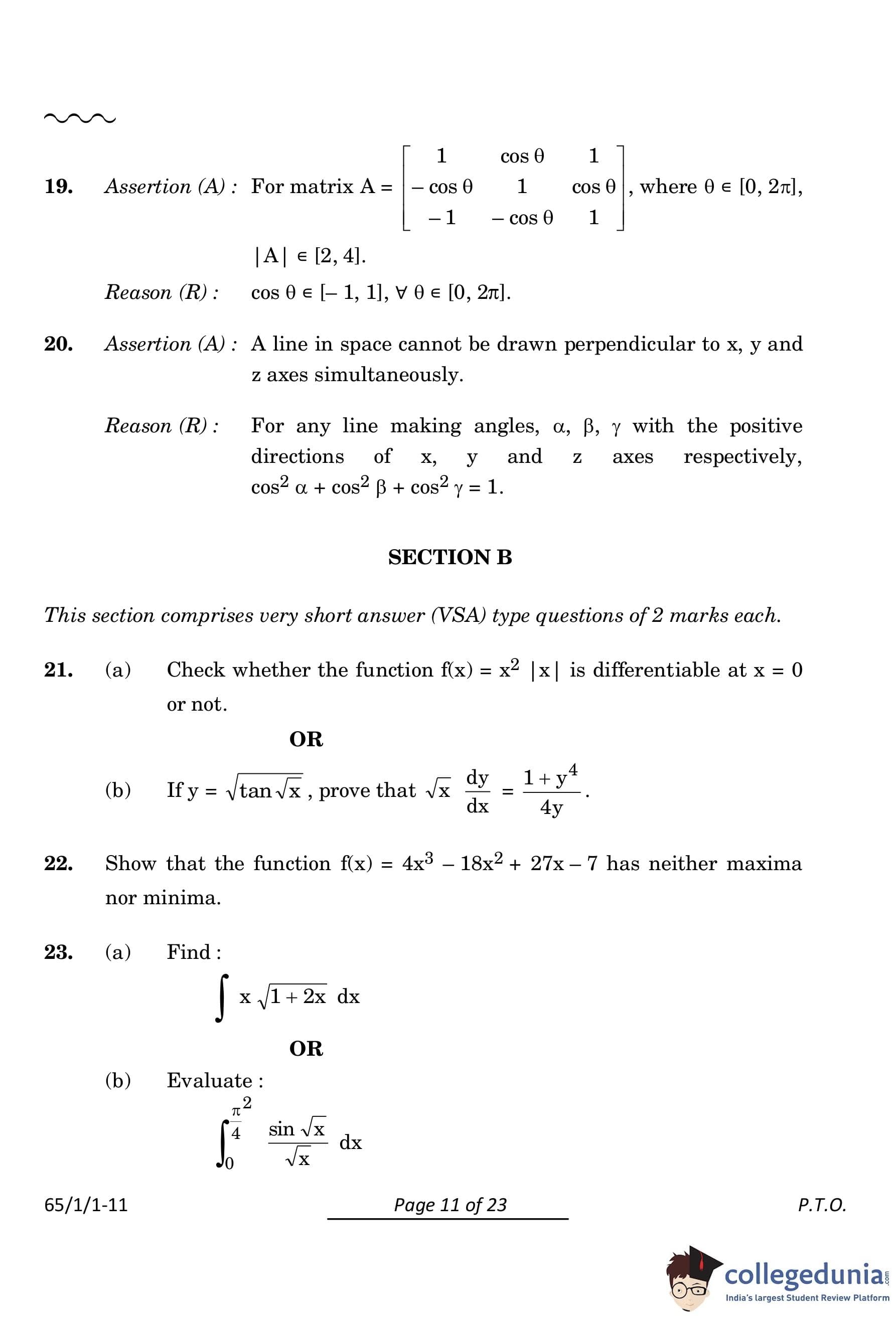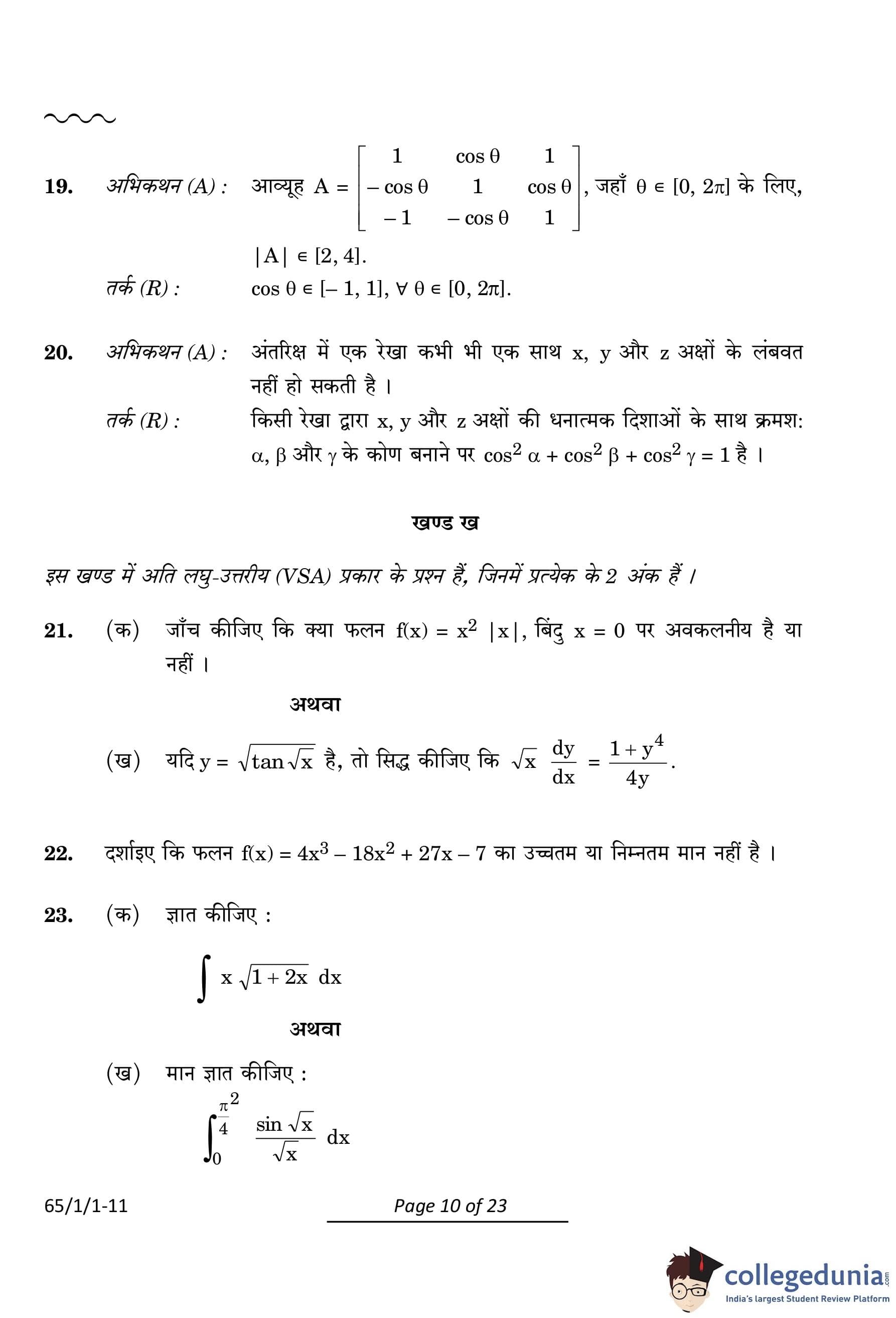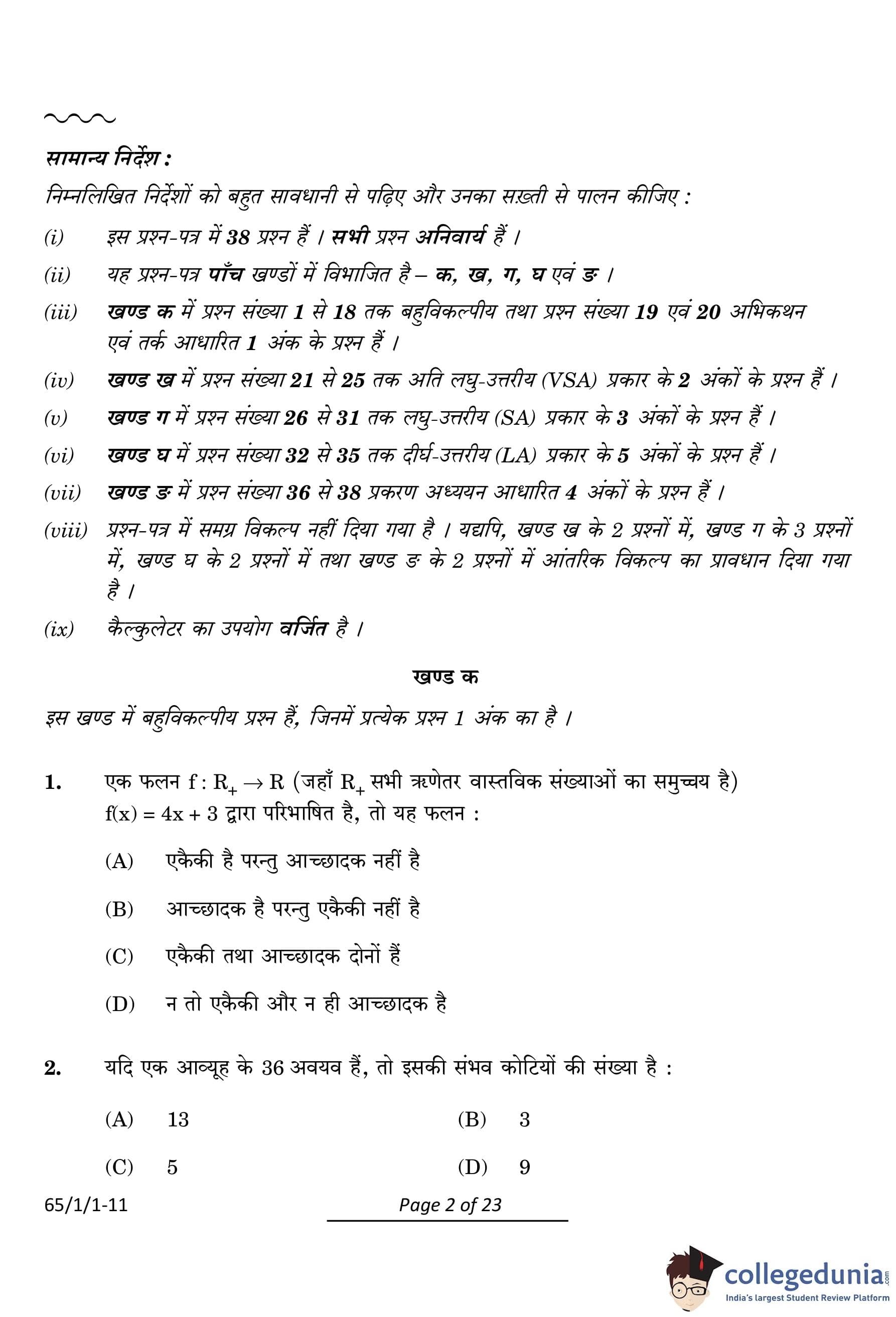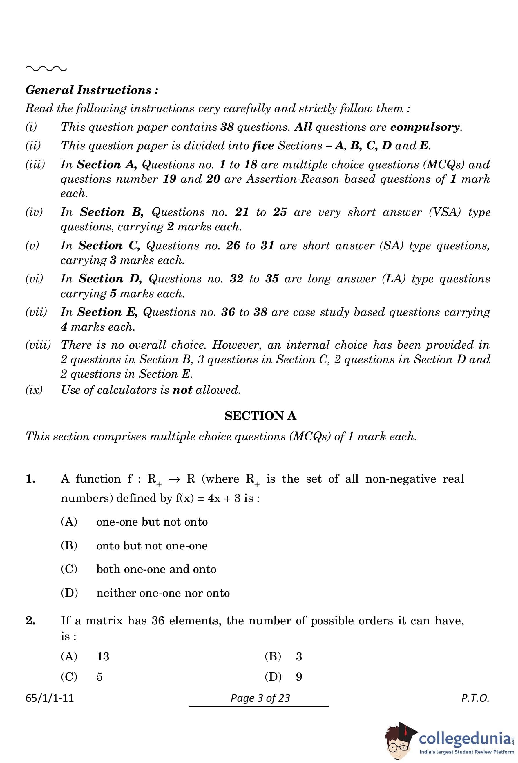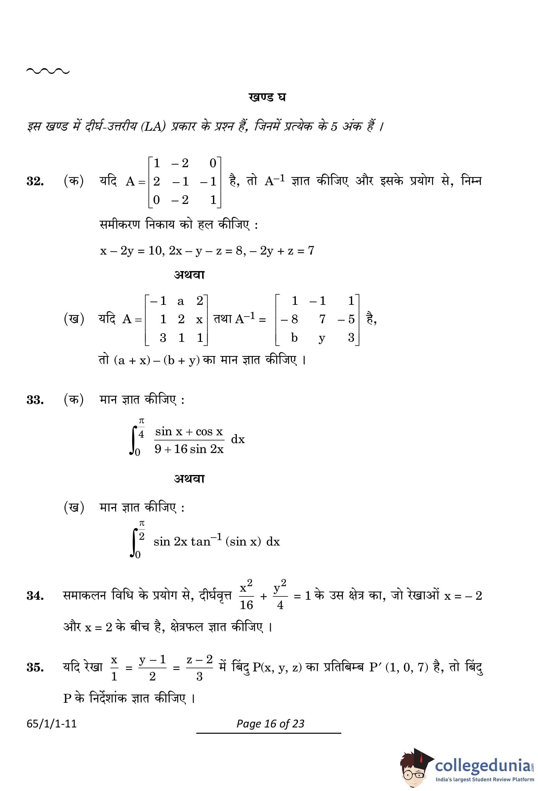 CBSE Class 12 Mathematics Question Paper 2024 PDF (Set 1- 65/1/1) is available for download here. CBSE conducted the Mathematics exam on March 9, 2024 from 10:30 AM to 1:30 PM. The total marks for the theory paper are 80. The question paper contains 20% MCQ-based questions, 40% competency-based questions, and 40% short and long answer type questions.