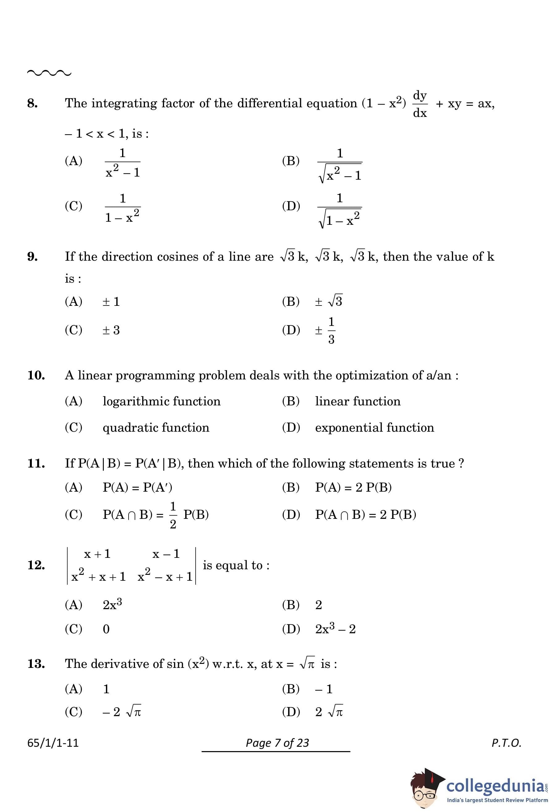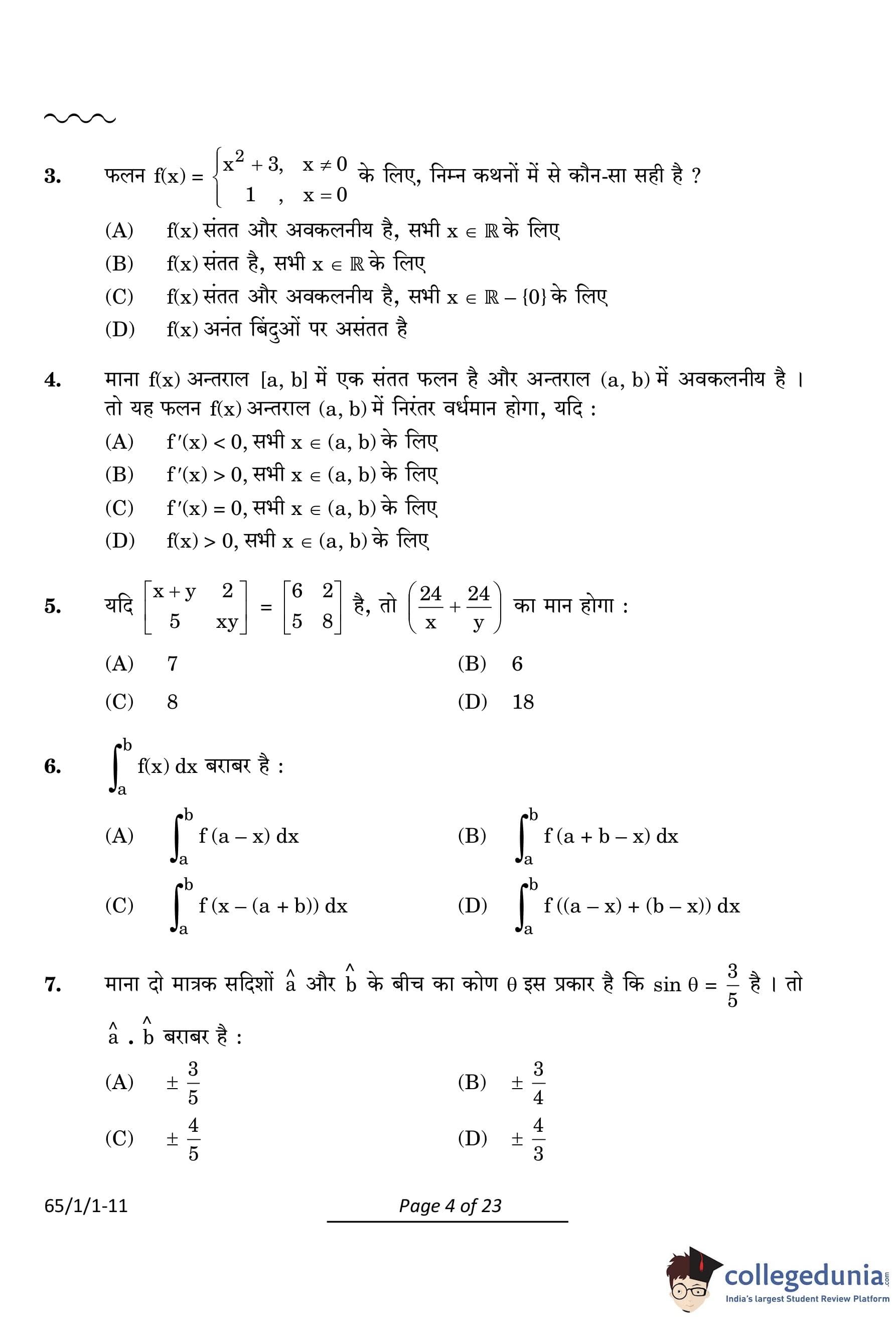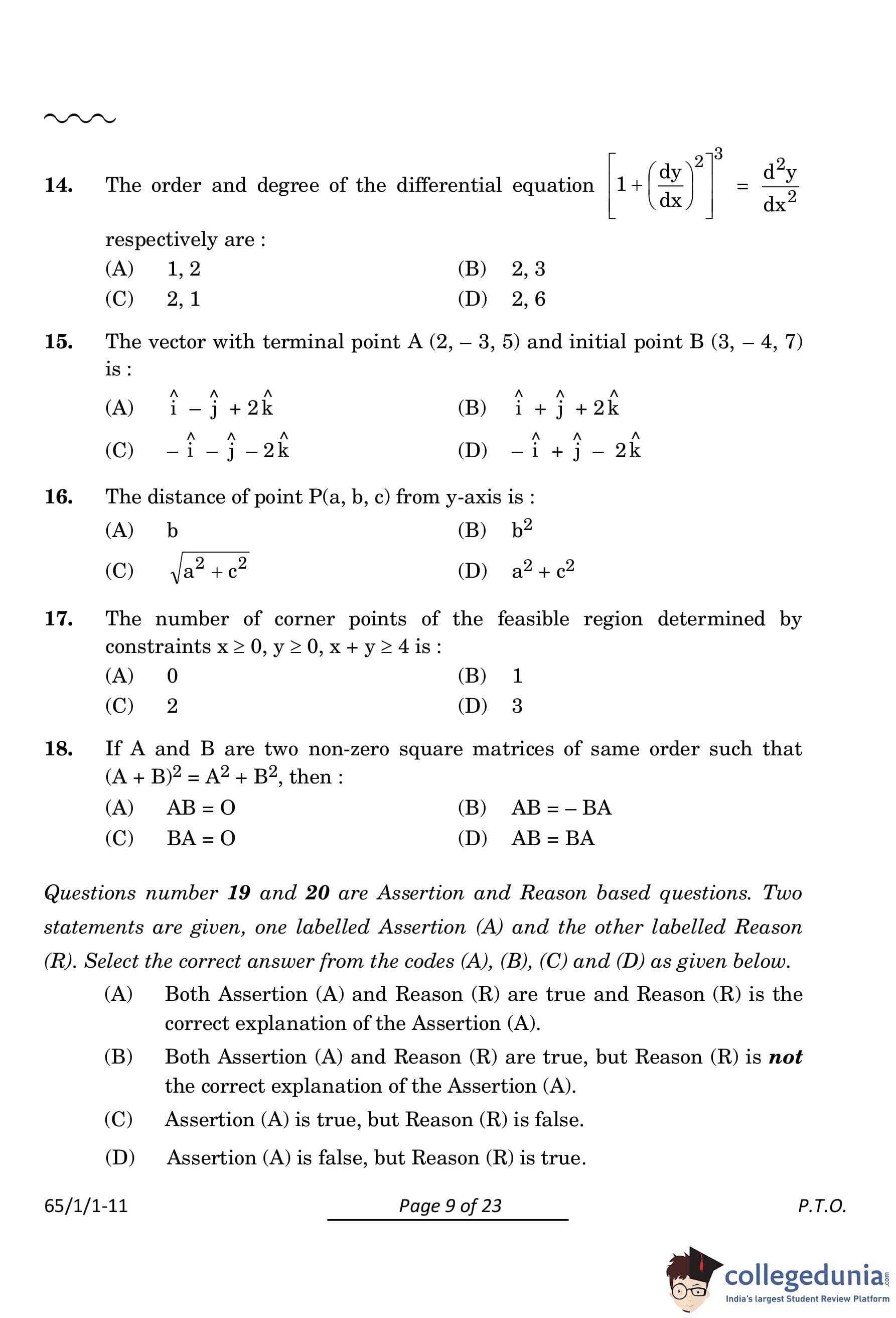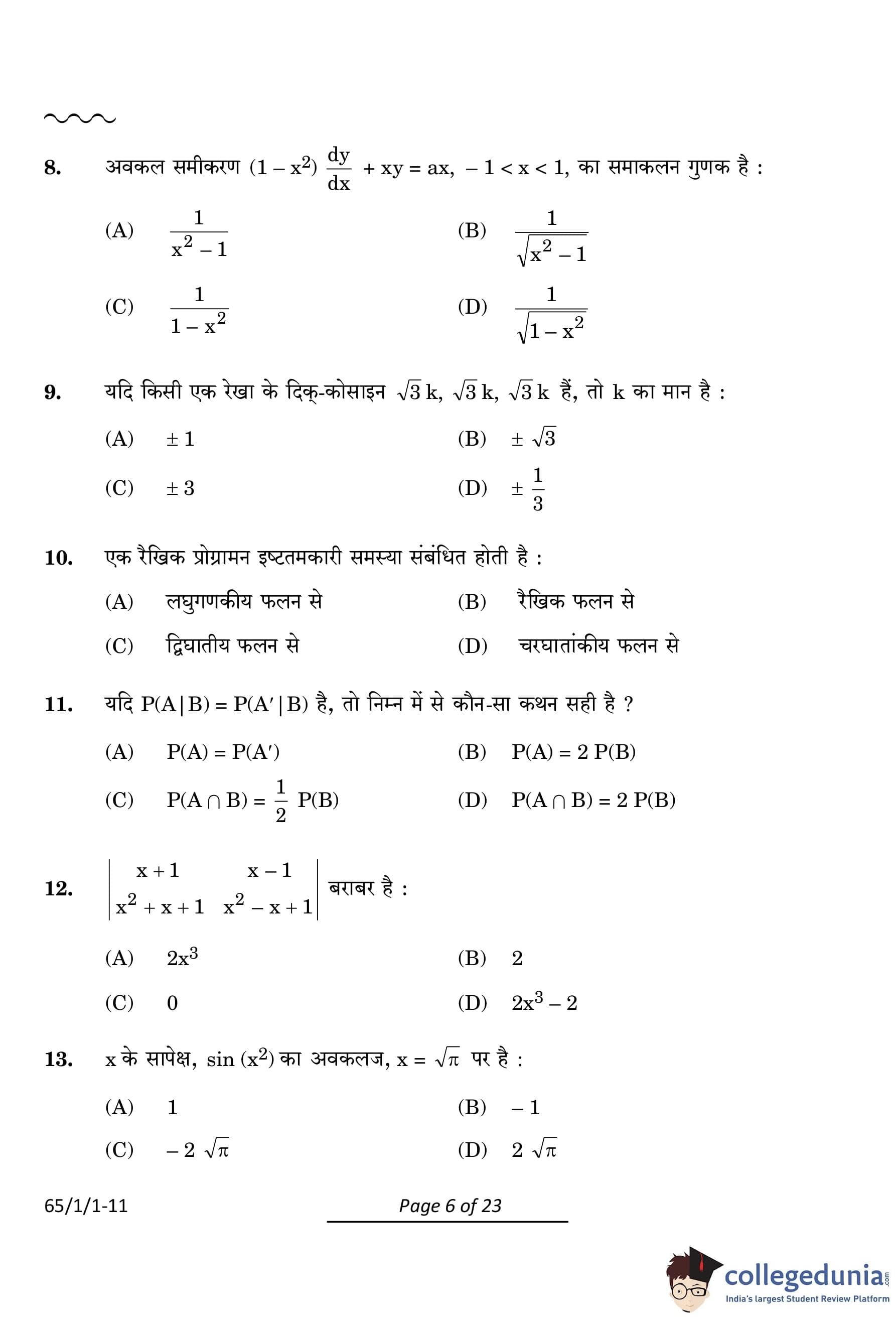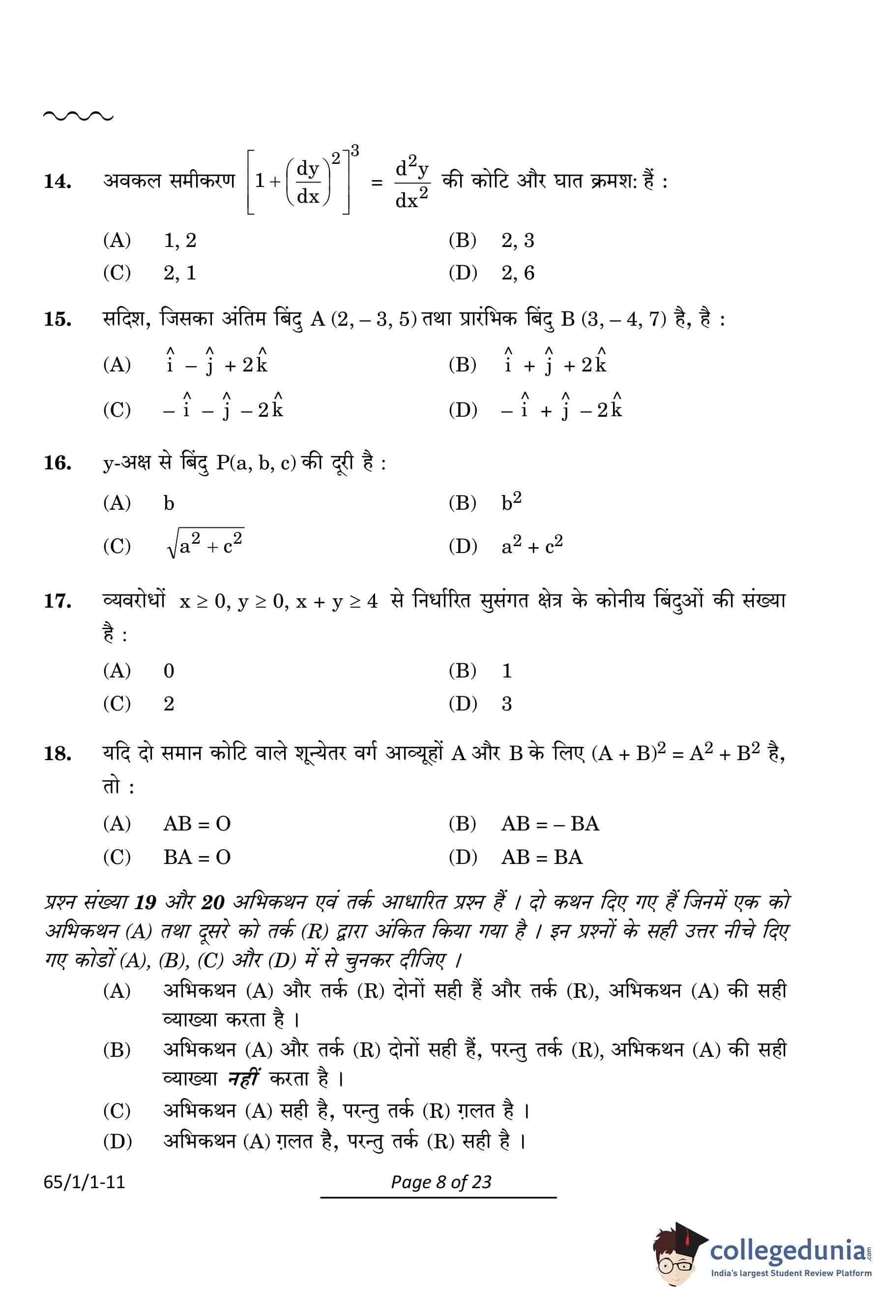 CBSE Class 12 Mathematics Question Paper 2024 PDF (Set 1- 65/1/1) is available for download here. CBSE conducted the Mathematics exam on March 9, 2024 from 10:30 AM to 1:30 PM. The total marks for the theory paper are 80. The question paper contains 20% MCQ-based questions, 40% competency-based questions, and 40% short and long answer type questions.