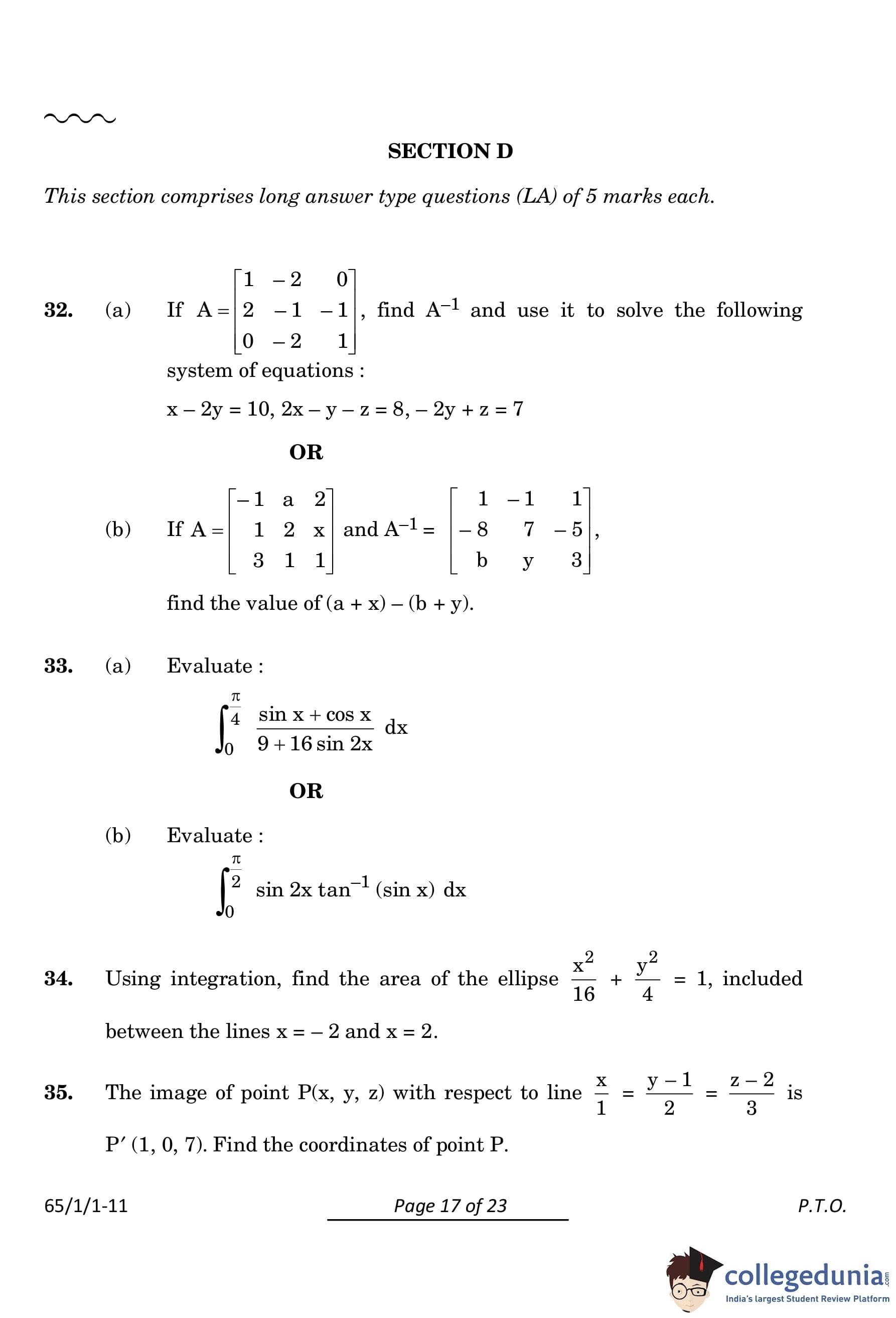 The coordinates of \(P\) are: \[ P(x, y, z) = (0, 4, 0). \] Quick Tip: To find the coordinates of a point whose image with respect to a line is given: 1. Write the parametric form of the line. 2. Use the midpoint formula to relate the point and its image. 3. Solve the resulting equations systematically to find the unknown coordinates.