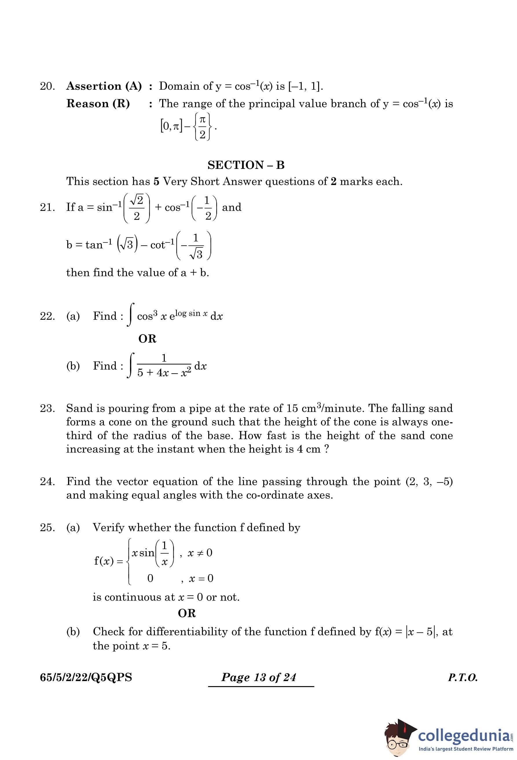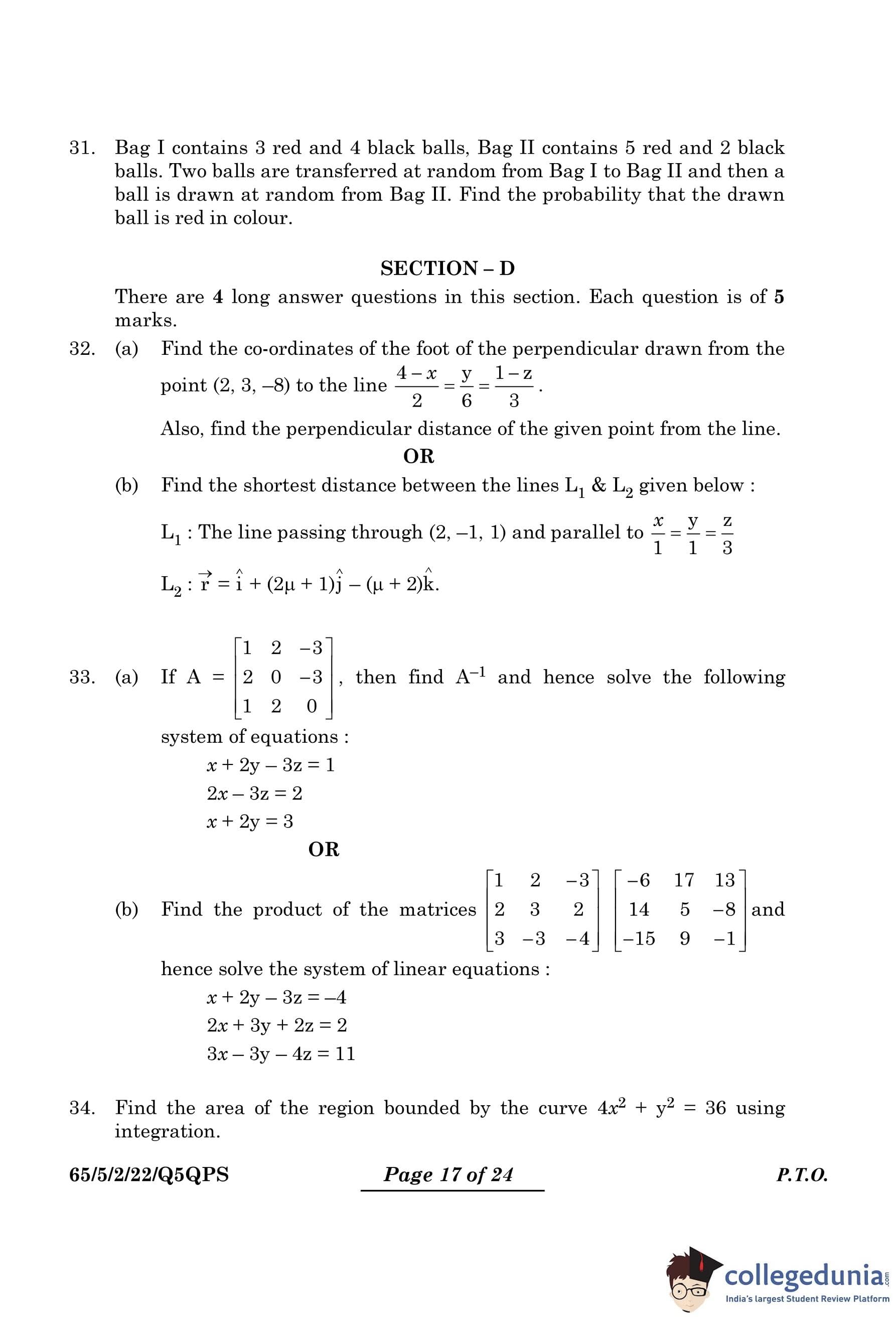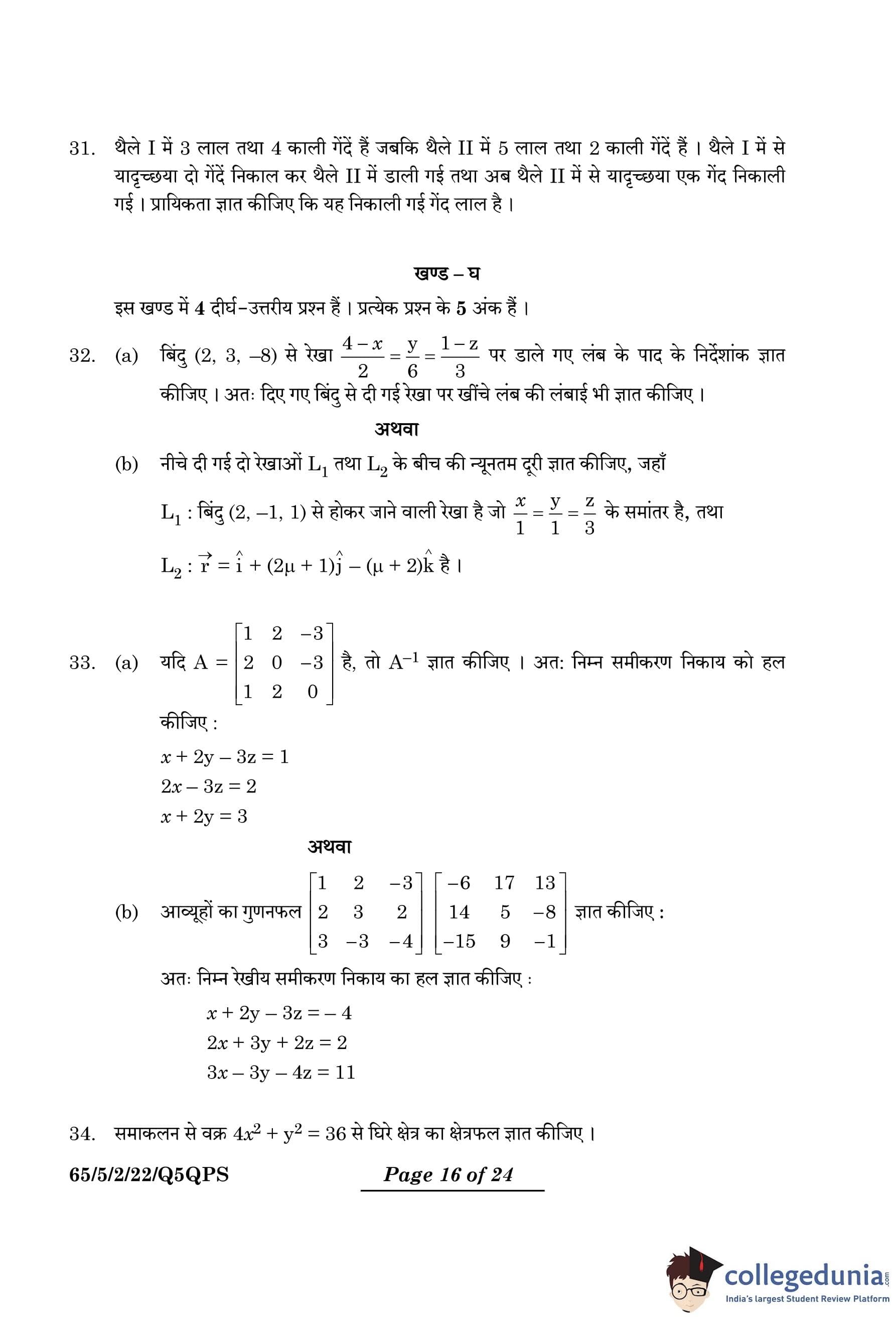 CBSE Class 12 Mathematics Question Paper 2024 PDF (Set 2- 65/5/2) is available for download here. CBSE conducted the Mathematics exam on March 9, 2024 from 10:30 AM to 1:30 PM. The total marks for the theory paper are 80. The question paper contains 20% MCQ-based questions, 40% competency-based questions, and 40% short and long answer type questions.