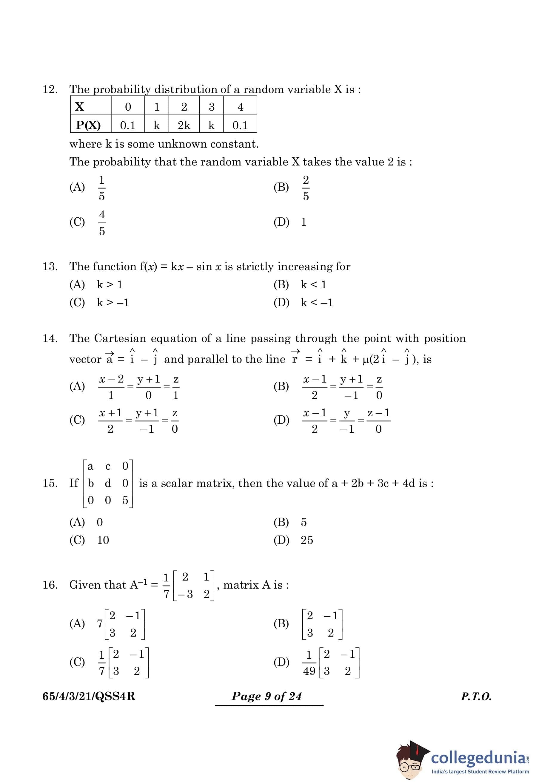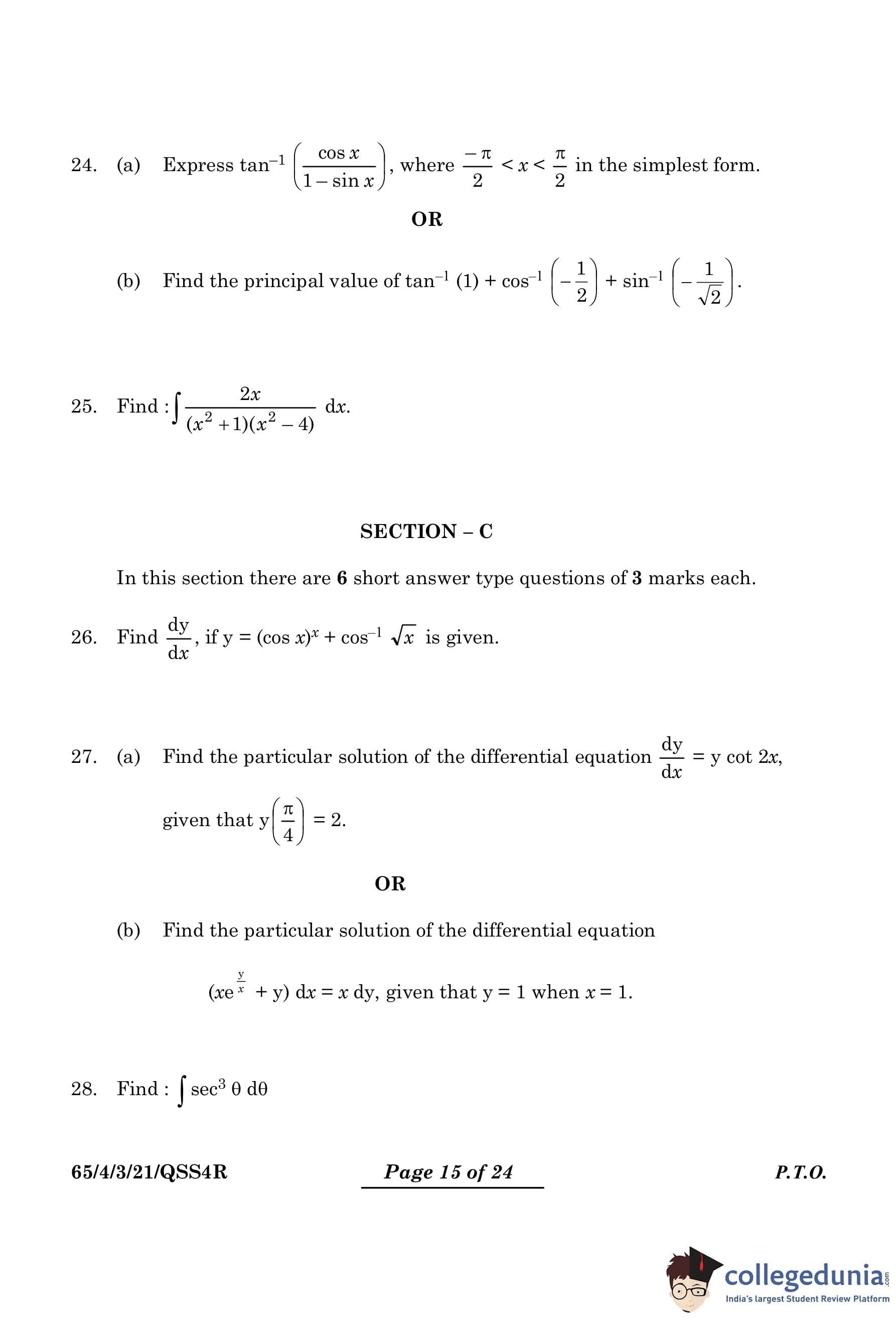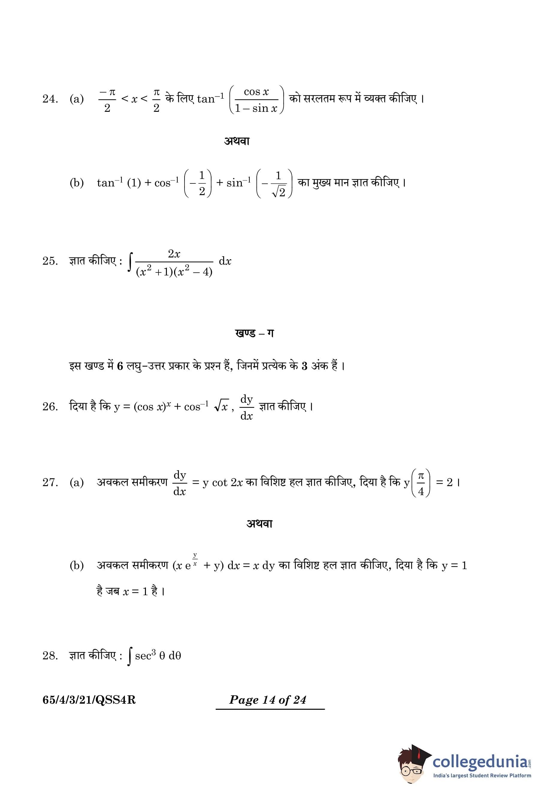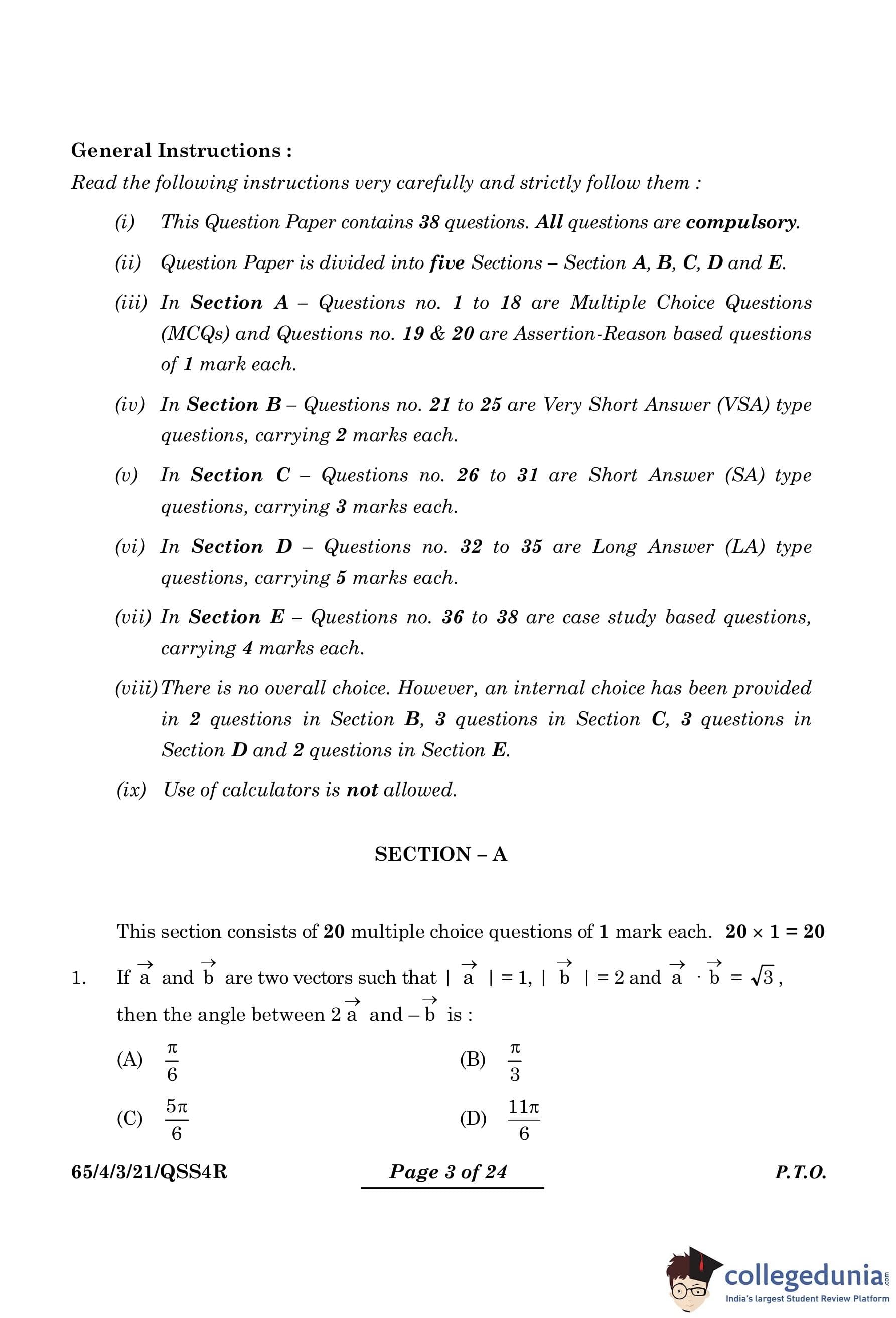 CBSE Class 12 Mathematics Question Paper 2024 PDF (Set 3- 65/4/3) is available for download here. CBSE conducted the Mathematics exam on March 9, 2024 from 10:30 AM to 1:30 PM. The total marks for the theory paper are 80. The question paper contains 20% MCQ-based questions, 40% competency-based questions, and 40% short and long answer type questions.