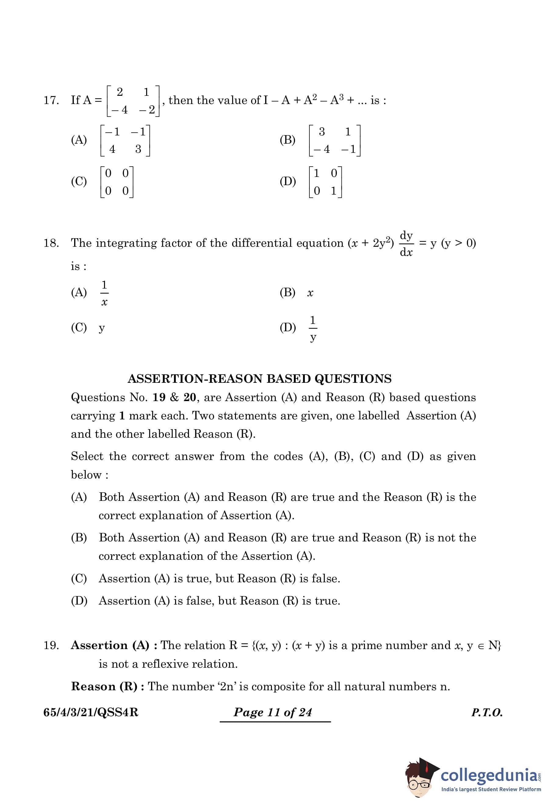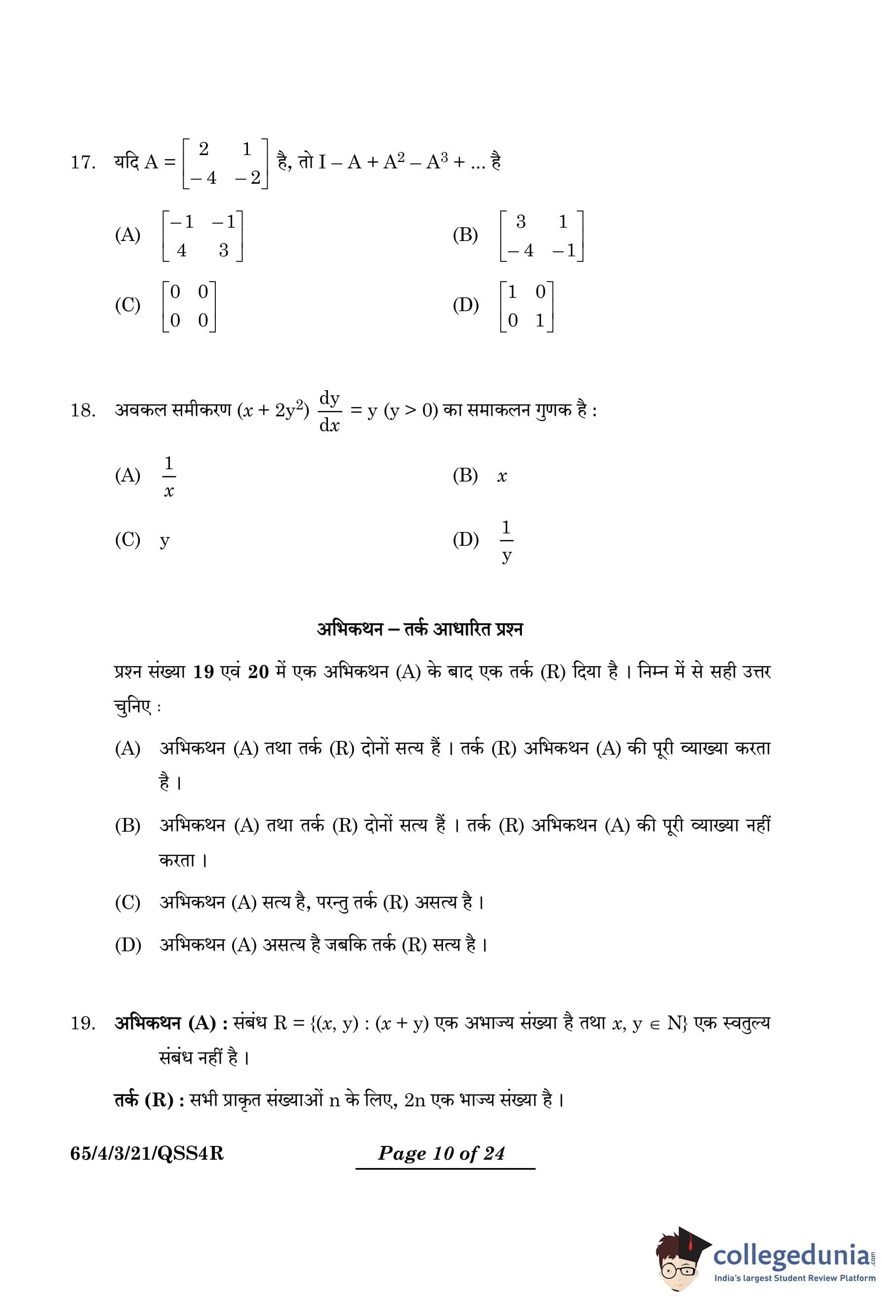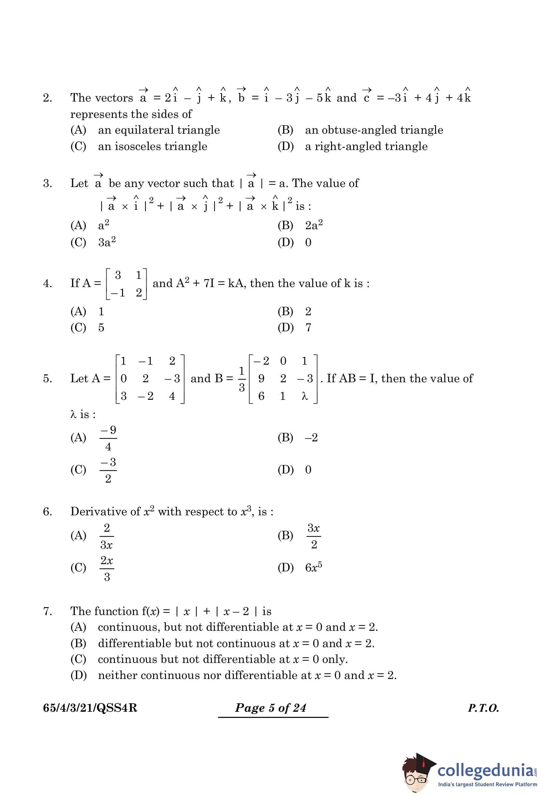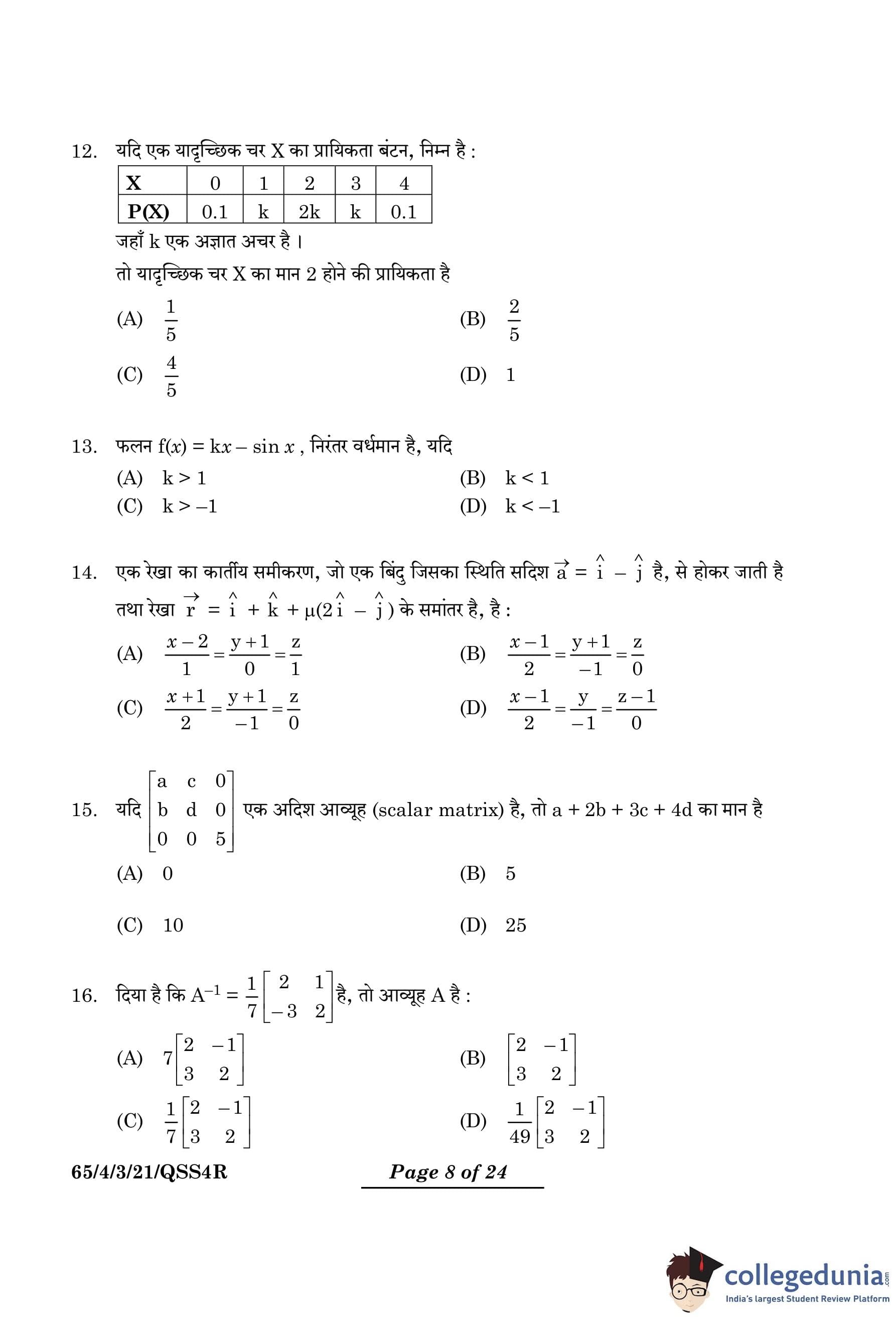 CBSE Class 12 Mathematics Question Paper 2024 PDF (Set 3- 65/4/3) is available for download here. CBSE conducted the Mathematics exam on March 9, 2024 from 10:30 AM to 1:30 PM. The total marks for the theory paper are 80. The question paper contains 20% MCQ-based questions, 40% competency-based questions, and 40% short and long answer type questions.