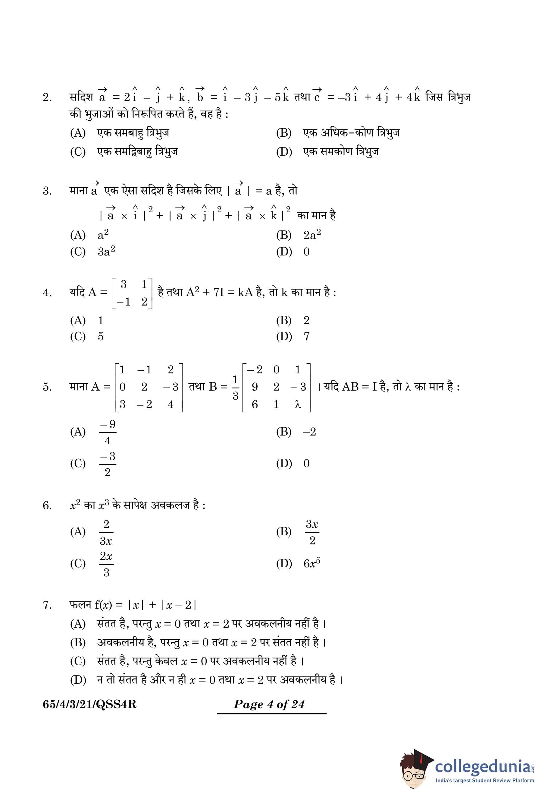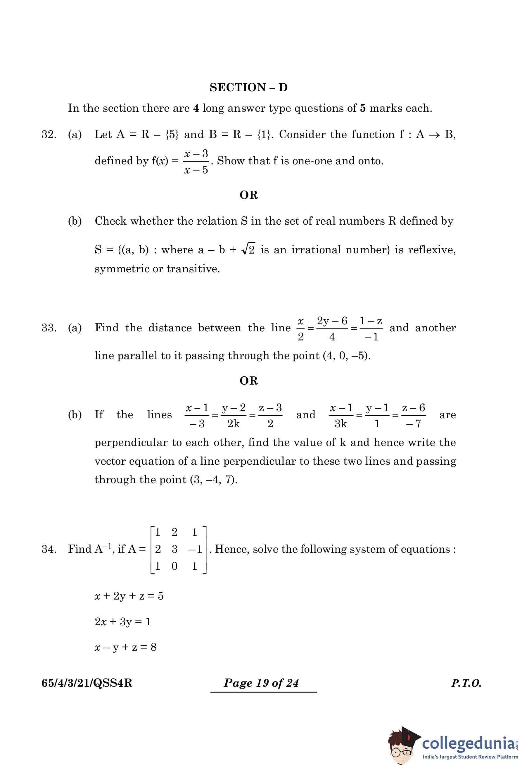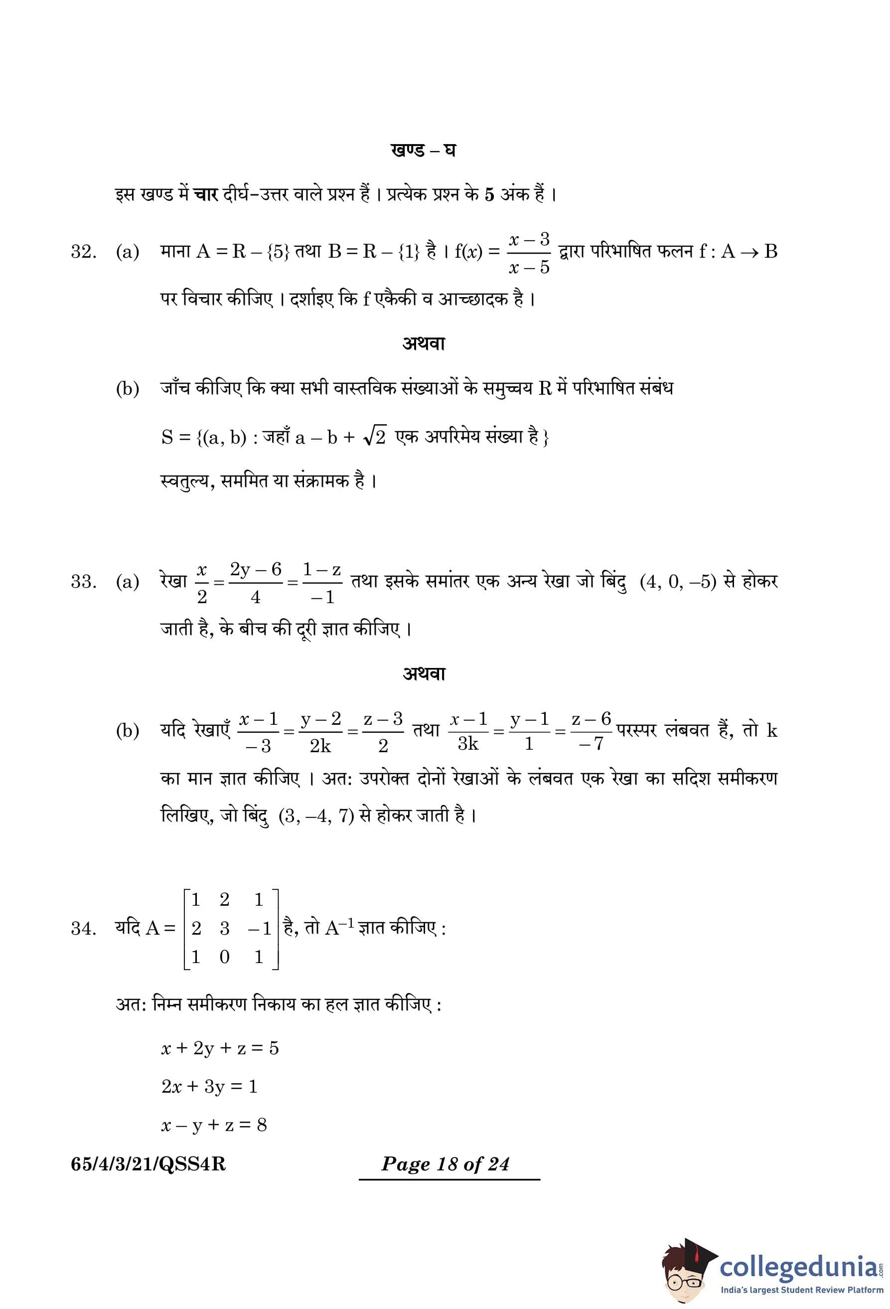 CBSE Class 12 Mathematics Question Paper 2024 (Set 3- 65/4/3) with Answer Key