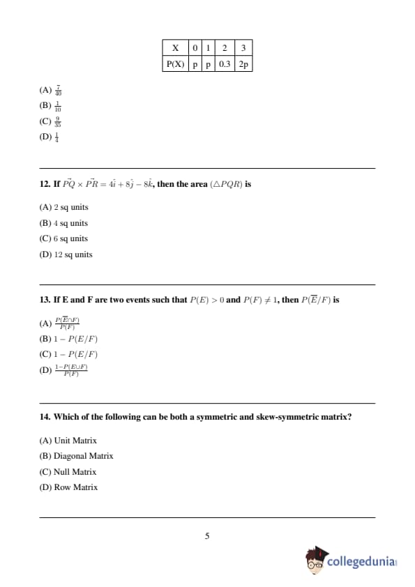 The area of \( \triangle PQR \) is 6 square units. Quick Tip: The magnitude of the cross product of two vectors \( \vec{a \) and \( \vec{b} \), \( |\vec{a} \times \vec{b}| \), represents the area of the parallelogram formed by these two vectors as adjacent sides. The area of the triangle formed by these two vectors as two of its sides is half the area of the parallelogram, i.e., \( \frac{1}{2} |\vec{a} \times \vec{b}| \).