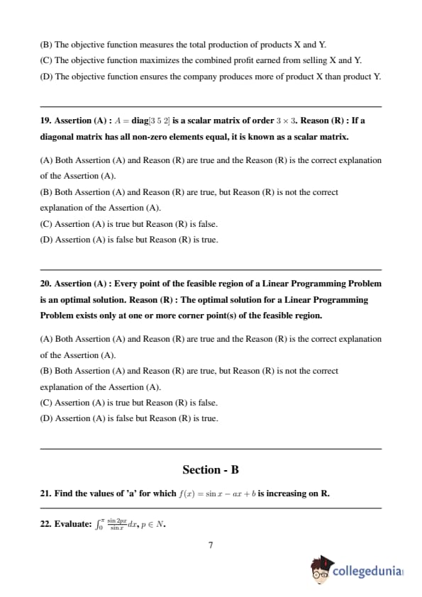 Since \( I_p = I_{p-1} \) and \( I_1 = 0 \), it follows that \( I_p = 0 \) for all \( p \in N \). Quick Tip: Using reduction formulas or recurrence relations can be helpful for integrals involving parameters. In this case, by relating \( I_p \) to \( I_{p-1} \), we found a pattern. Remember the values of trigonometric functions at multiples of \( \pi \): \( \sin(n\pi) = 0 \) for any integer \( n \).