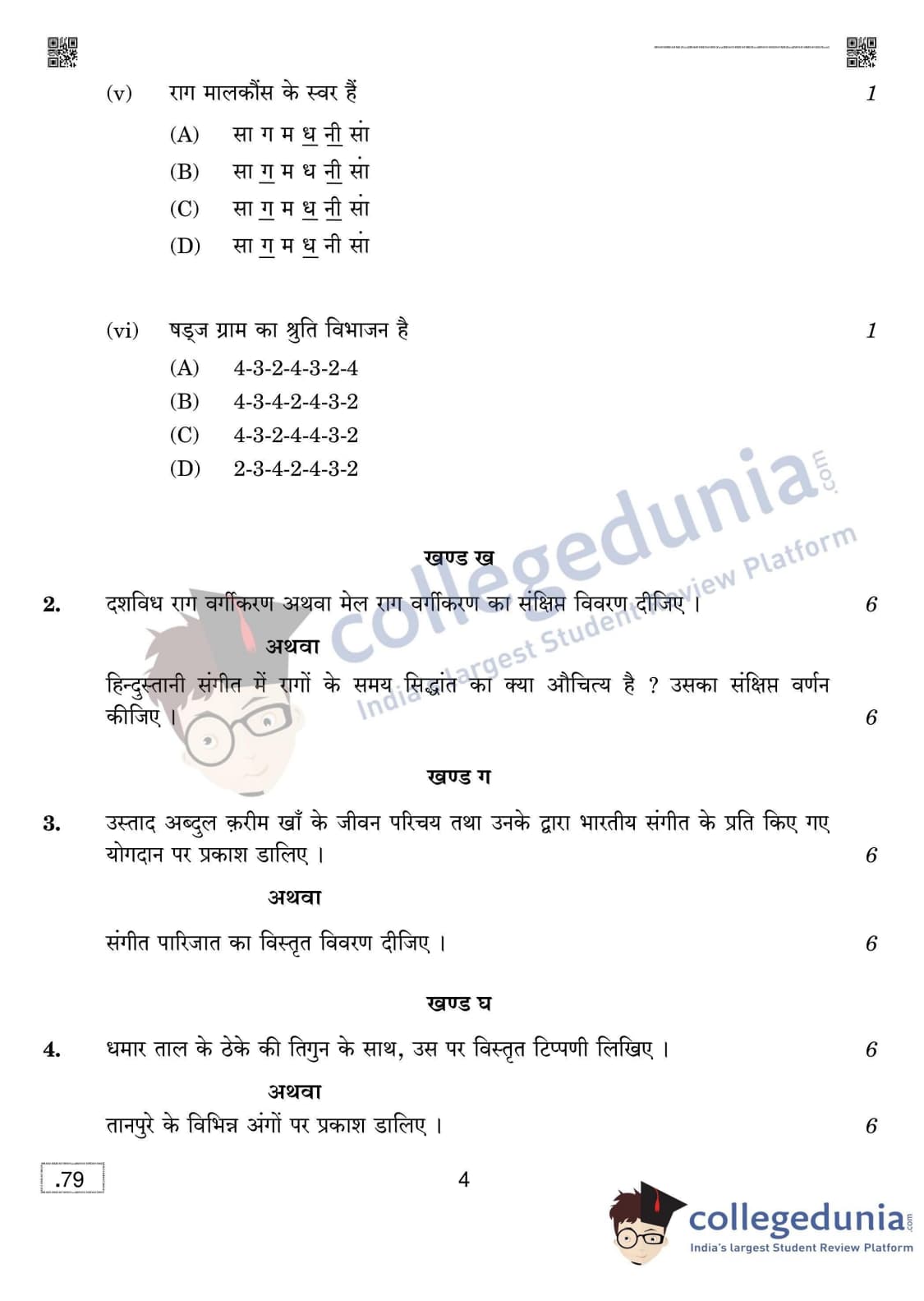 CBSE Class 12 Music Hindustani (Vocal) Question Paper 2020 with Answer Key Set 4 is available for download. The exam was conducted by the Central Board of Secondary Education on March 16, 2020 in the Morning Session 10:30 AM to 12:30 PM. The medium of paper was English & Hindi. The question paper comprised a total of 5 questions divided among 4 sections.