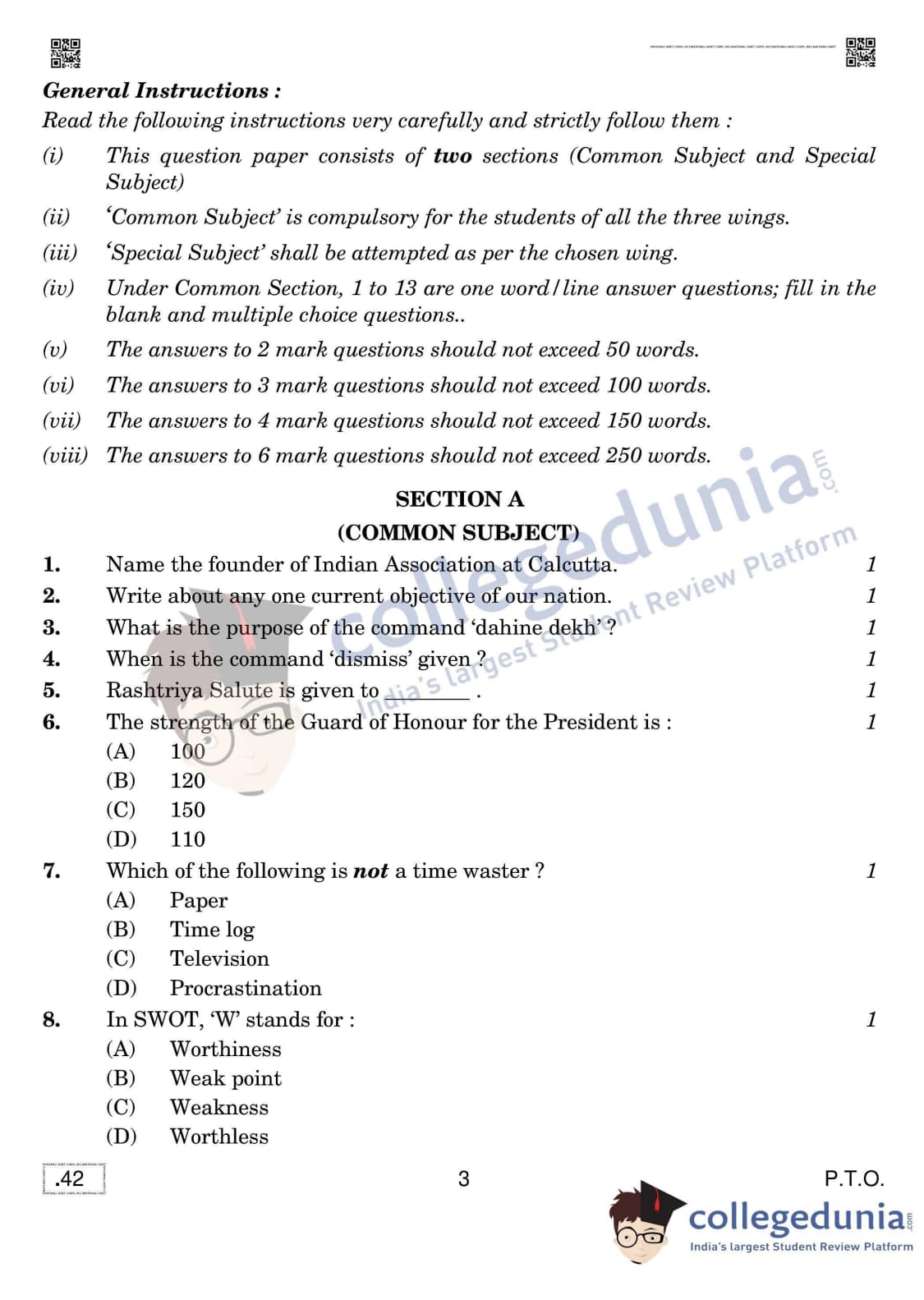 CBSE Class 12 National Cadet Corps Question Paper 2020 with Answer Key (February 28)