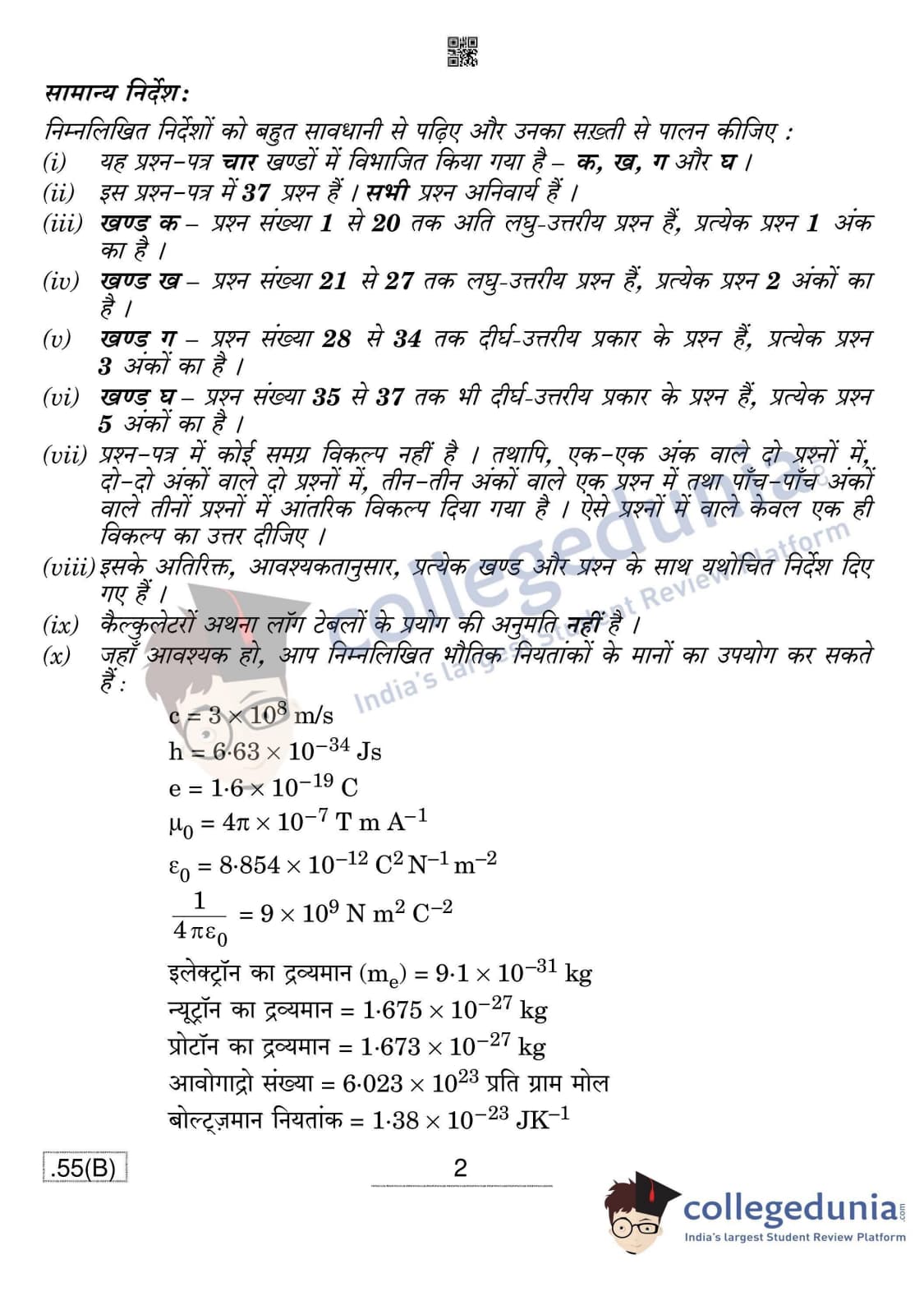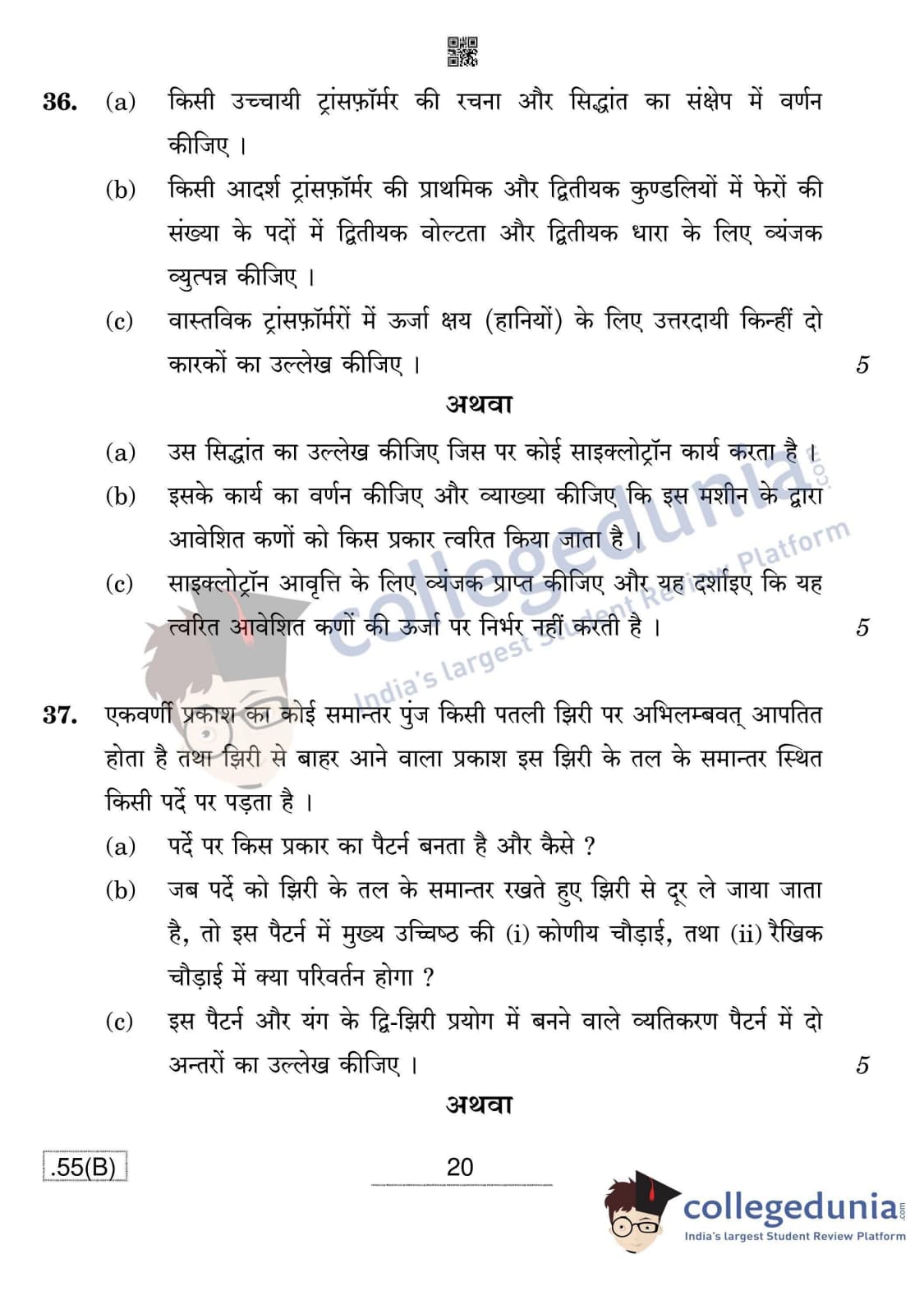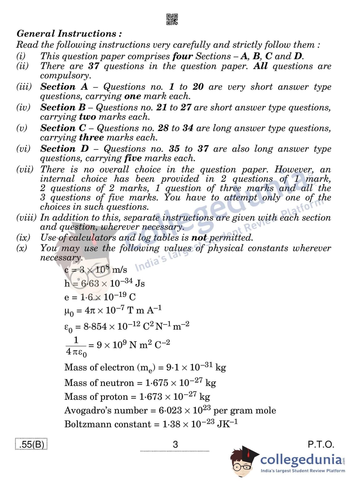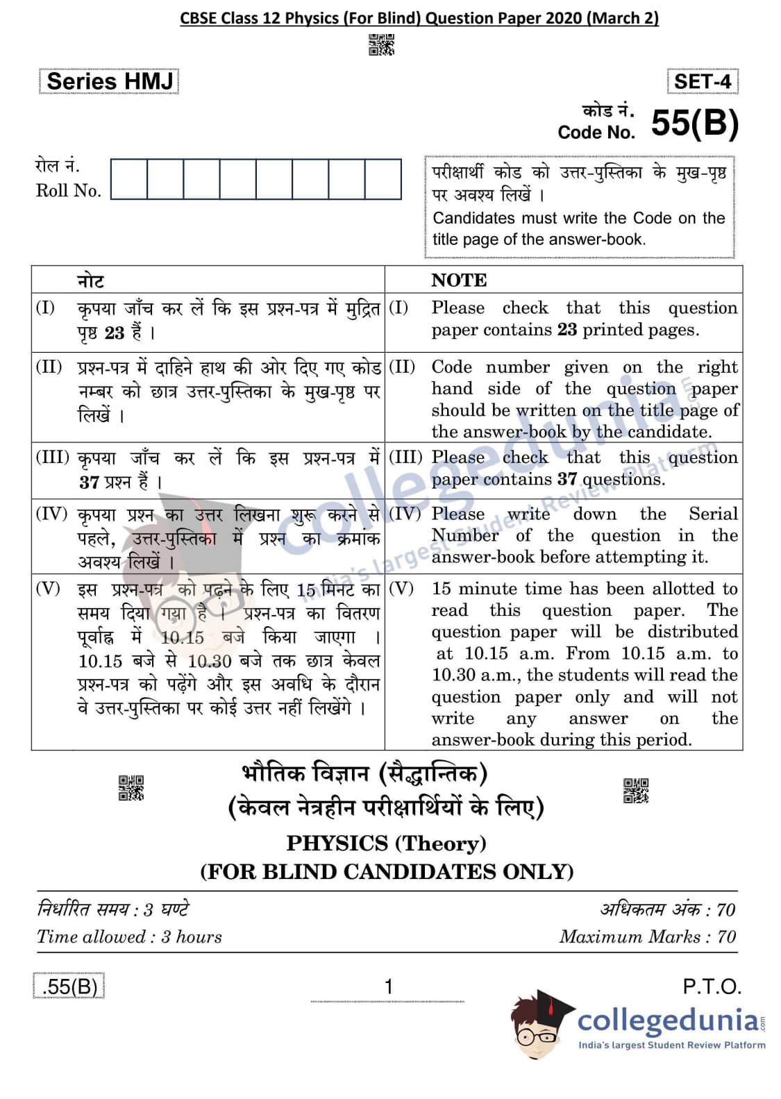 CBSE Class 12 Physics (For Blind) Question Paper 2020 with Answer Key is available for download. The exam was conducted by the Central Board of Secondary Education on March 2, 2020 in the Morning Session 10:30 AM to 1:30 PM. The medium of paper was English & Hindi. In terms of difficulty level, CBSE Class 12 Physics paper was of Difficult level. The question paper comprised a total of 37 questions divided among 4 sections.