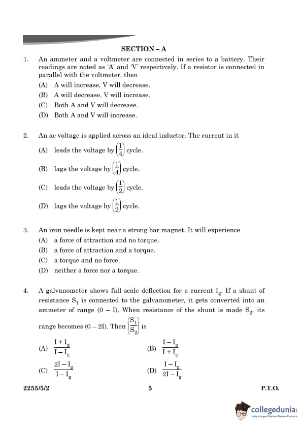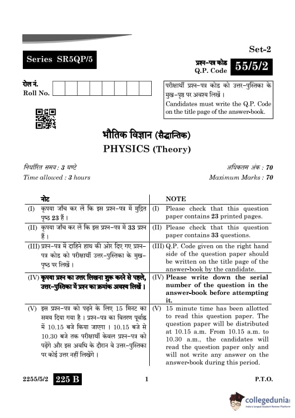 CBSE Class 12 Physics Question Paper 2024 PDF (Set 2- 55/5/2) is available for download here. CBSE conducted the Physics exam on March 4, 2024, from 10:30 AM to 1:30 PM. The total marks for the theory paper are 70. The question paper contains 20% MCQ-based questions, 40% competency-based questions, and 40% short and long answer type questions. As per the students, the Physics exam was moderately difficult.