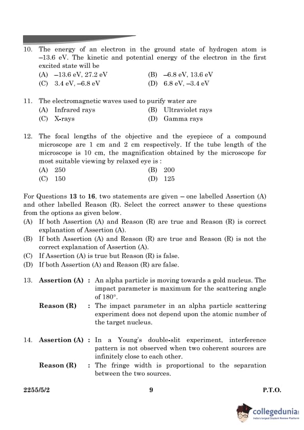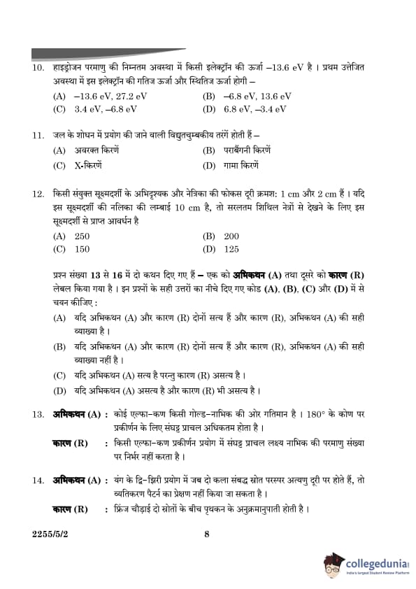 Thus, the kinetic energy is \( +3.4 \, eV \), and the potential energy is \( -6.8 \, eV \). Quick Tip: In the hydrogen atom, the total energy is negative, and the kinetic energy is always positive and equal in magnitude to half the potential energy but with the opposite sign.