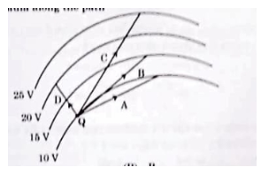 From the figure, the maximum potential difference occurs when the charge moves from the 25V surface to the 10V surface along path D. This gives the maximum potential difference, and thus the maximum work done will be along path D.