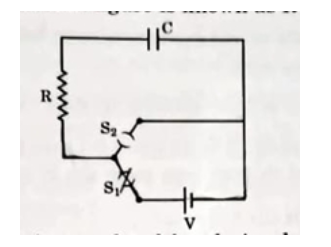 As soon as the circuit is completed by closing key \( S_1 \) (keeping \( S_2 \) open), charges begin to flow between the capacitor plates and the battery terminals. The charge on the capacitor increases and consequently the potential difference \( V_C = \frac{q}{C} \) across the capacitor also increases with time. When this potential difference equals the potential difference across the battery, the capacitor is fully charged (\( Q = VC \)). During this process of charging, the charge \( q \) on the capacitor changes with time \( t \) as \[ q = Q \left( 1 - e^{-t/RC} \right) \]