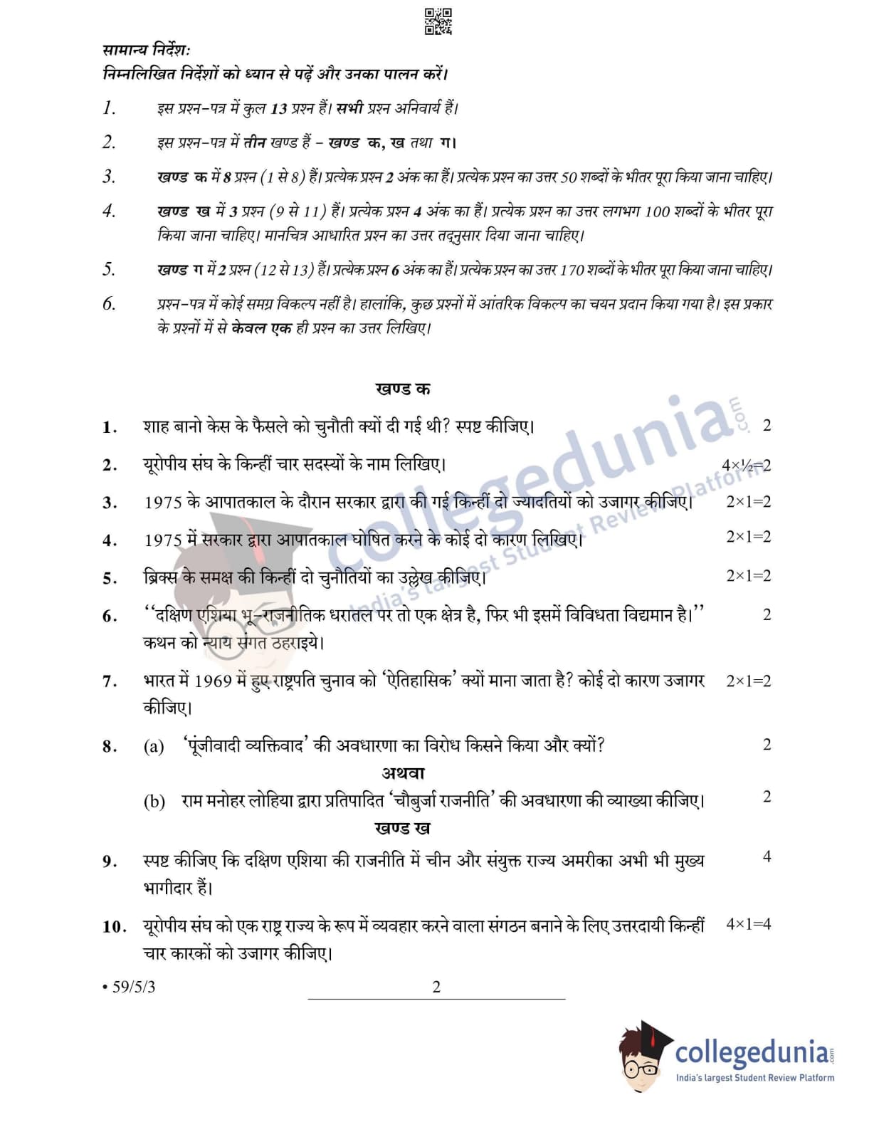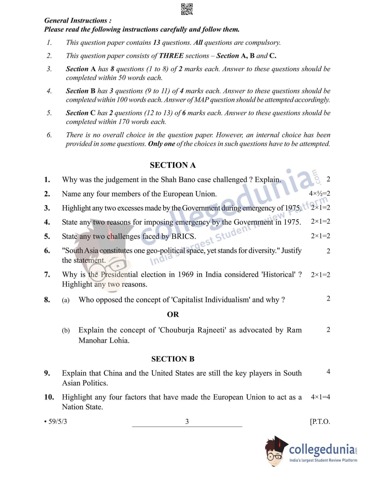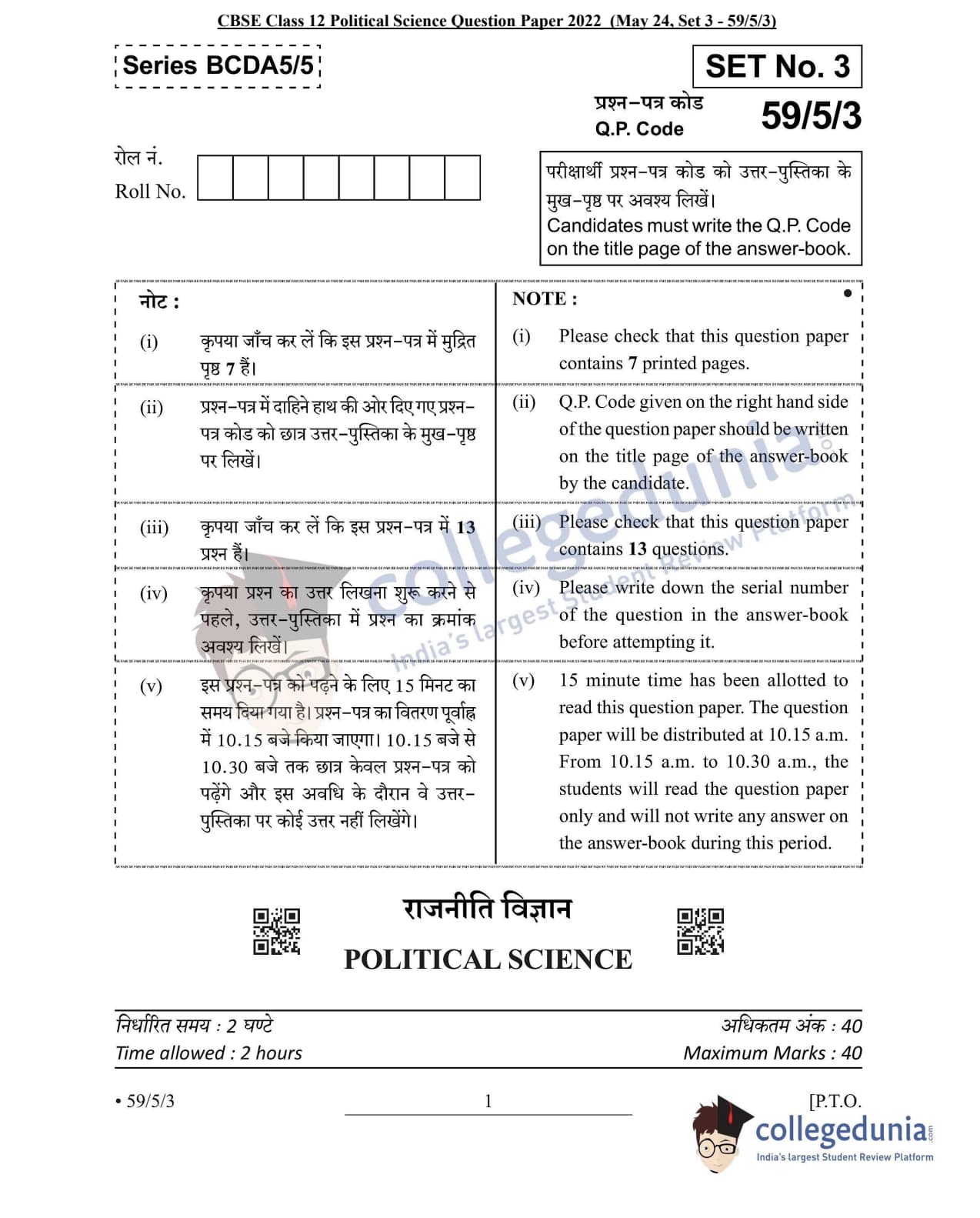 CBSE Class 12 2022 Political Science Question Paper Set 3 - 59/5/3 with Answer Key pdf is available for download. The exam was conducted by Central Board of Secondary Education on May 24, 2022 in the Morning Session 10:30 AM to 12:30 PM. The medium of paper was English & Hindi. In terms of difficulty level, CBSE Class 12 Political Science paper was of Easy level. The question paper comprised a total of 13 questions divided among 3 sections.