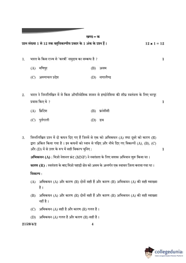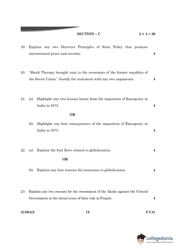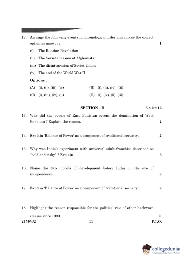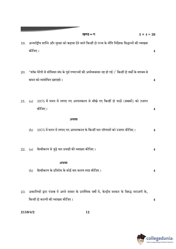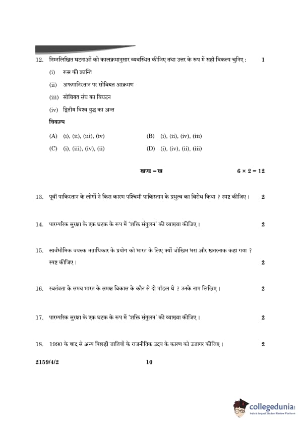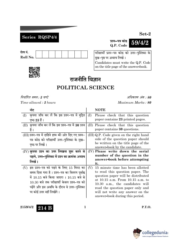 CBSE Class 12 Political Science Question Paper 2024 PDF (Set 2- 59/4/2) is available for download here. CBSE conducted the Political Science exam on March 22, 2024 from 10:30 AM to 1:30 PM. The total marks for the theory paper are 80. The question paper contains 20% MCQ-based questions, 40% competency-based questions, and 40% short and long answer type questions.