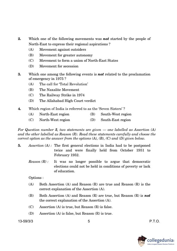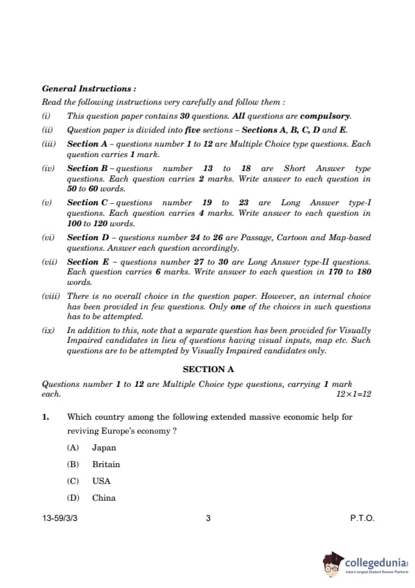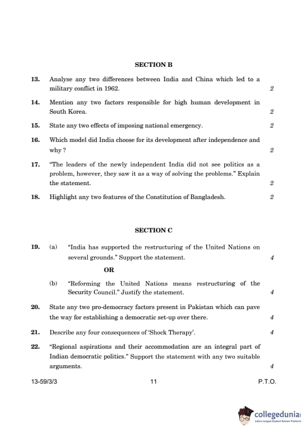 CBSE Class 12 Political Science Question Paper 2024 PDF (Set 3- 59/3/3) is available for download here. CBSE conducted the Political Science exam on March 22, 2024 from 10:30 AM to 1:30 PM. The total marks for the theory paper are 80. The question paper contains 20% MCQ-based questions, 40% competency-based questions, and 40% short and long answer type questions.
