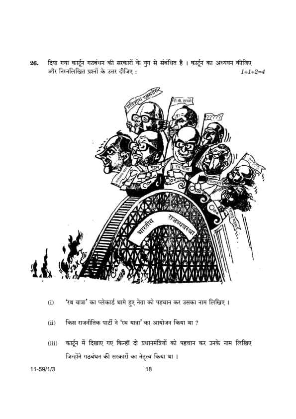 (iii) Two Prime Ministers shown in the cartoon who led coalition governments are V.P. Singh and Chandra Shekhar. Quick Tip: The era of coalition governments in India (1989–2014) involved multiple parties and leaders, with events like the Rath Yatra and Mandal Commission shaping political dynamics.