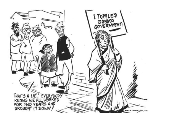 The cartoon shows Indira Gandhi holding a placard that reads “I toppled the Janata Government!” symbolizing her political comeback and active role in defeating the Janata Party in the 1980 elections. Quick Tip: Indira Gandhi’s strategic political moves and Congress revival led to the fall of the Janata coalition.