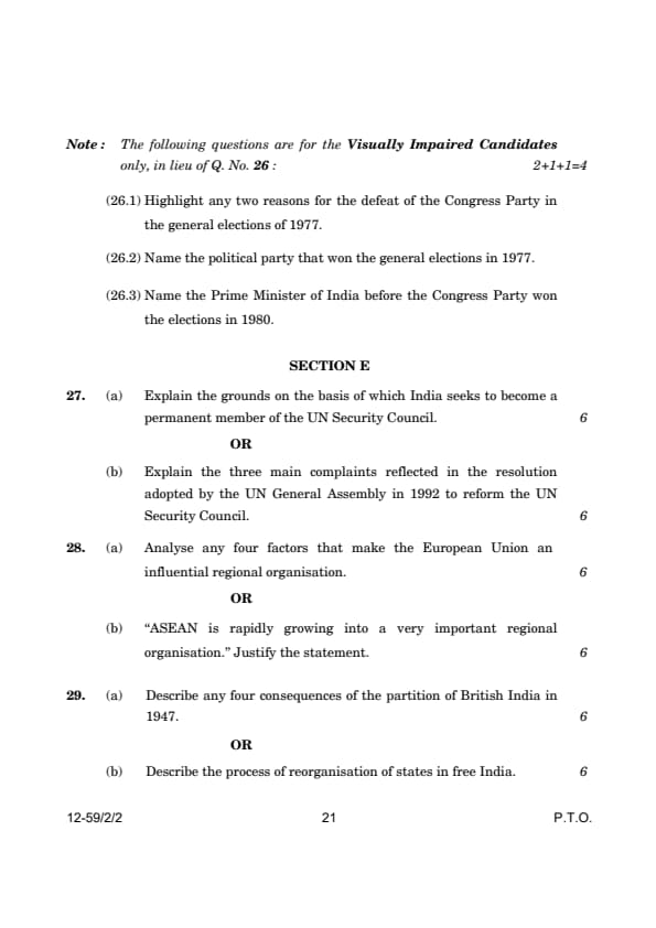 Note: The following questions are for the \textit{Visually Impaired Candidates only, in lieu of Q. No. 26 :
