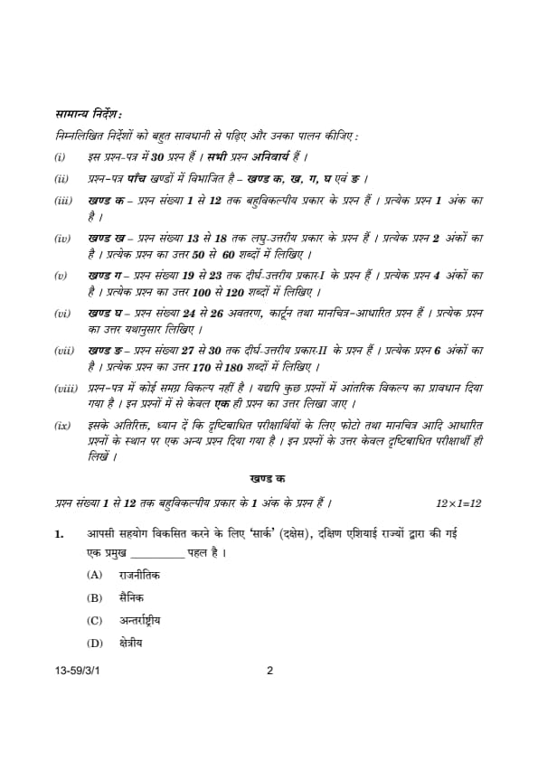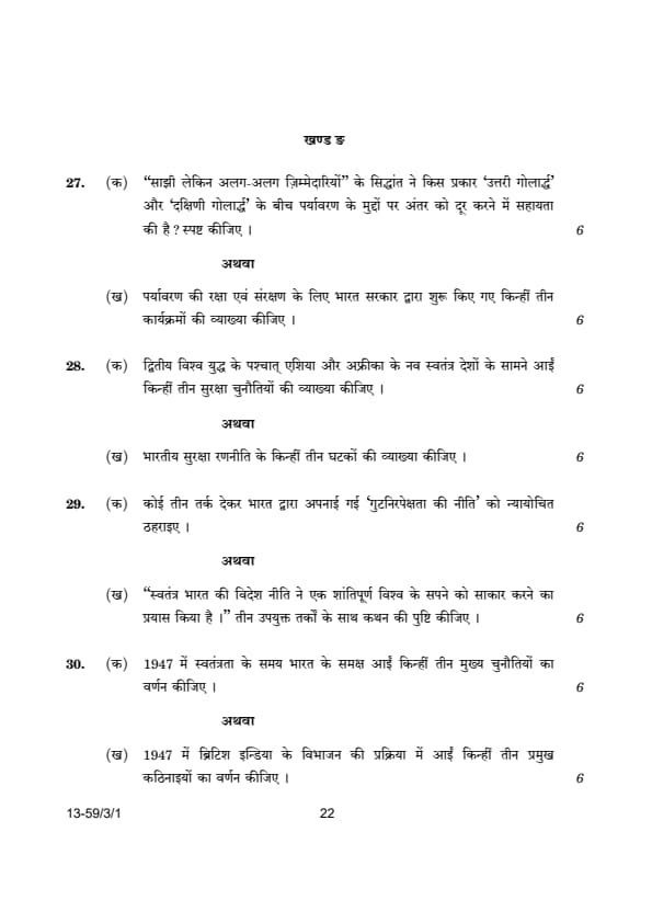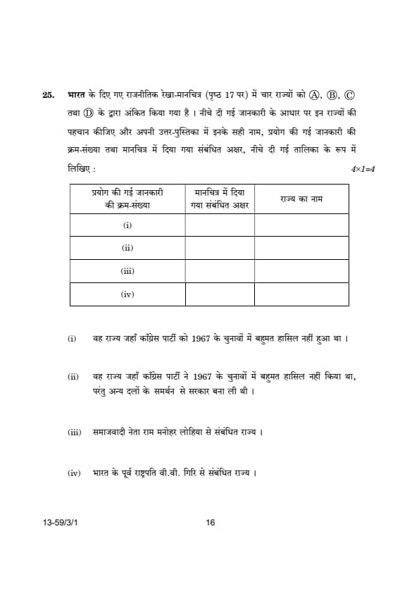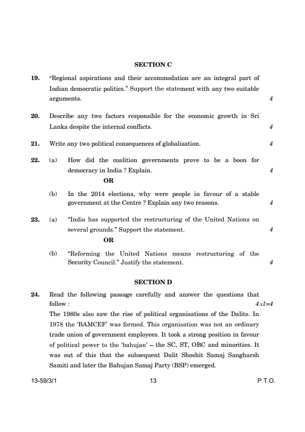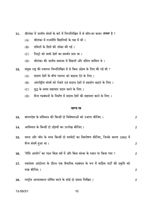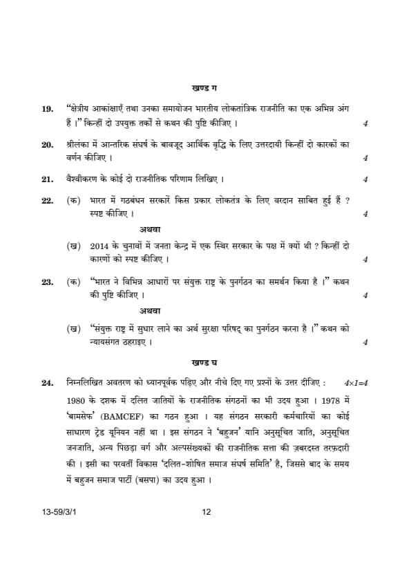 CBSE Class 12 Political Science (59/3/1) Question Paper 2024 with Answer Key