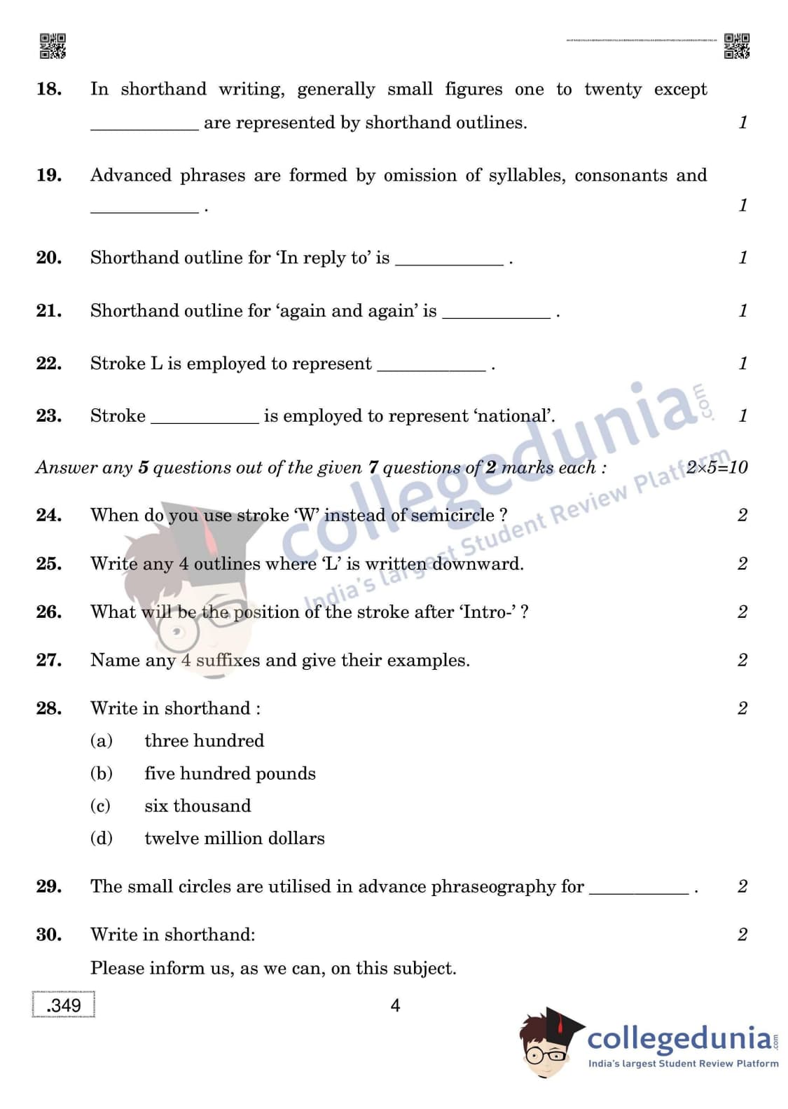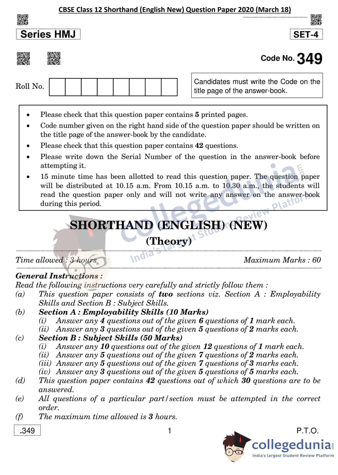 CBSE Class 12 Shorthand (English New) Question Paper 2020 with Answer Key Set 4 is available for download. The exam was conducted by the Central Board of Secondary Education on March 18, 2020 in the Morning Session 10:30 AM to 1:30 PM. The medium of paper was English. The question paper comprised a total of 42 questions divided among 2 sections.
