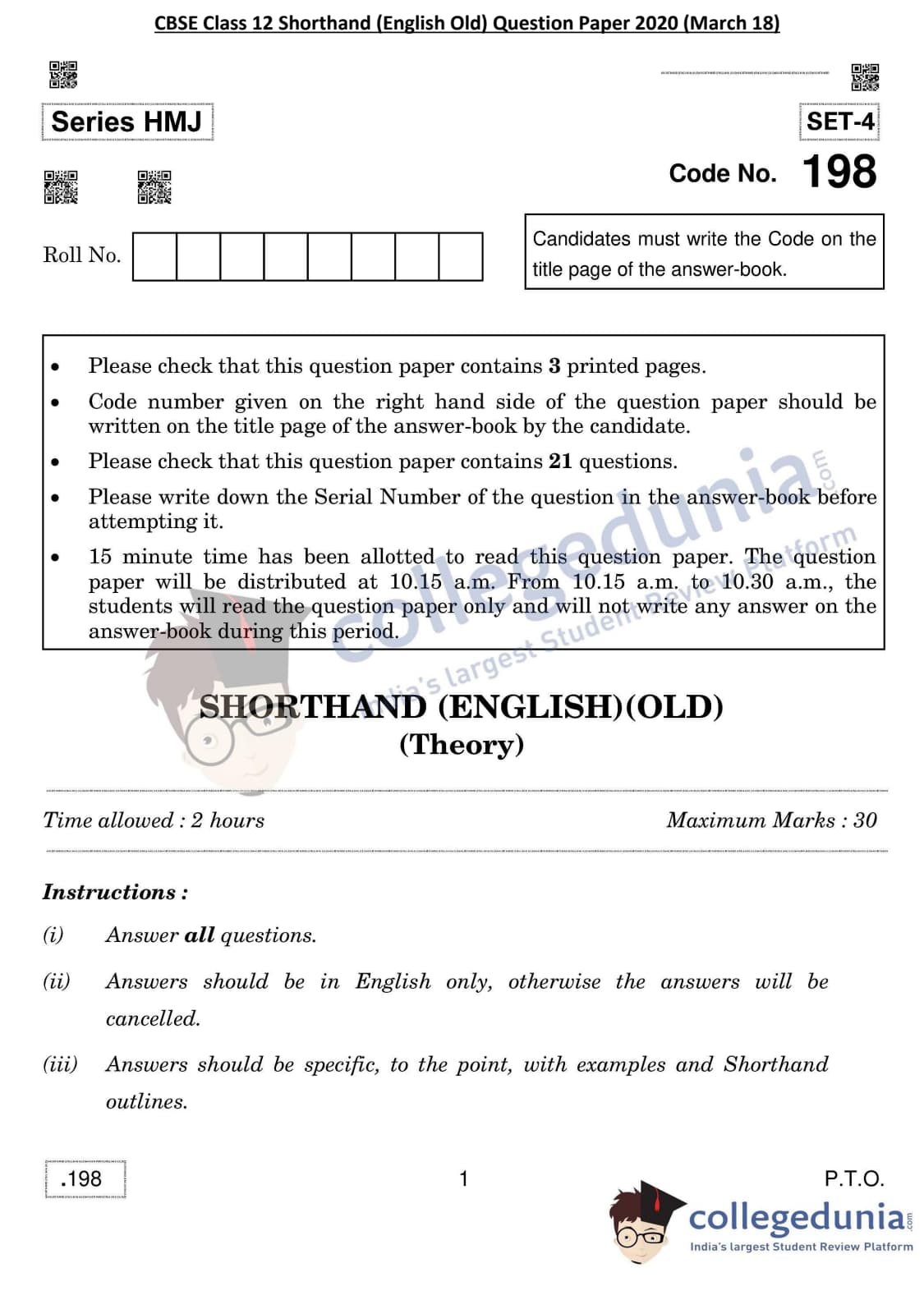 | CBSE Class 12 Shorthand (English Old) Question Paper 2020 PDF | CBSE Class 12 Shorthand (English Old) Answer Key 2020 PDF |