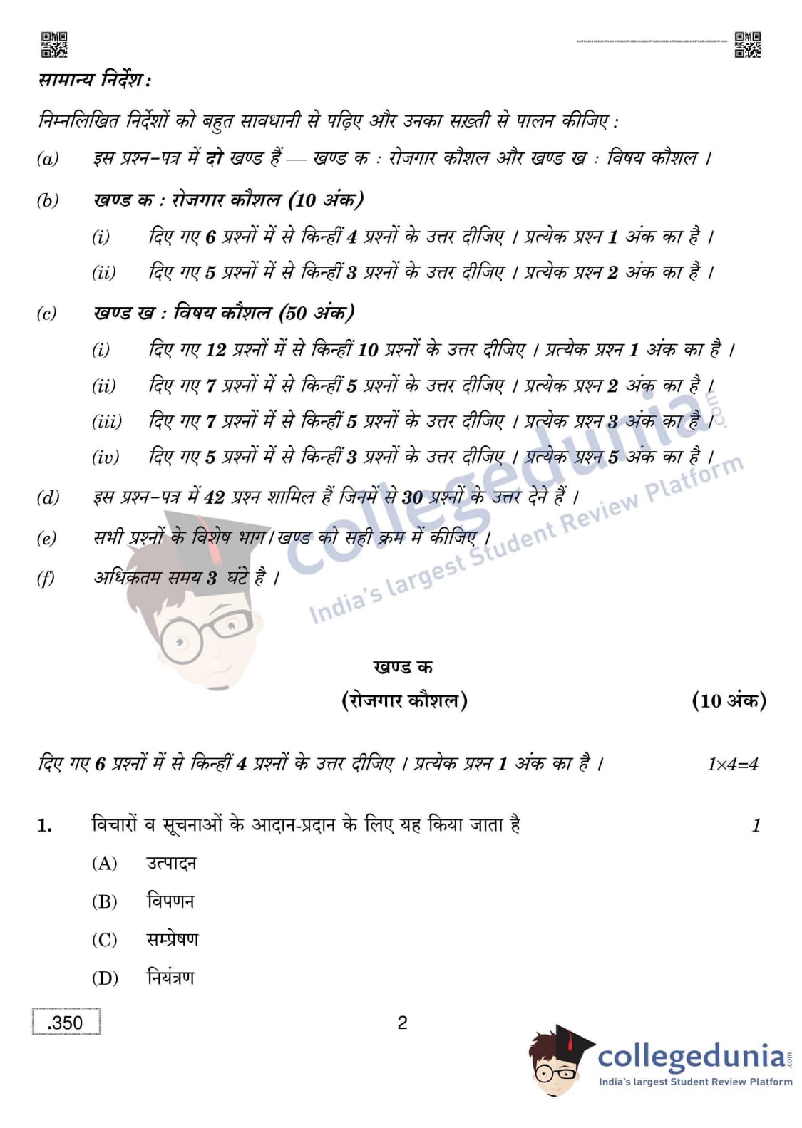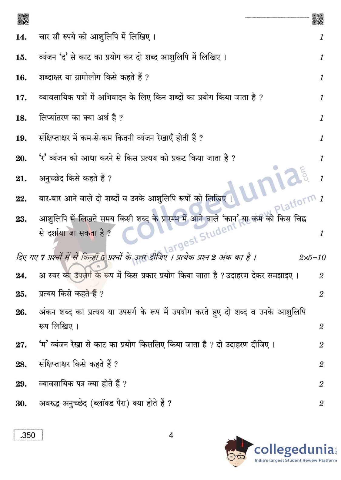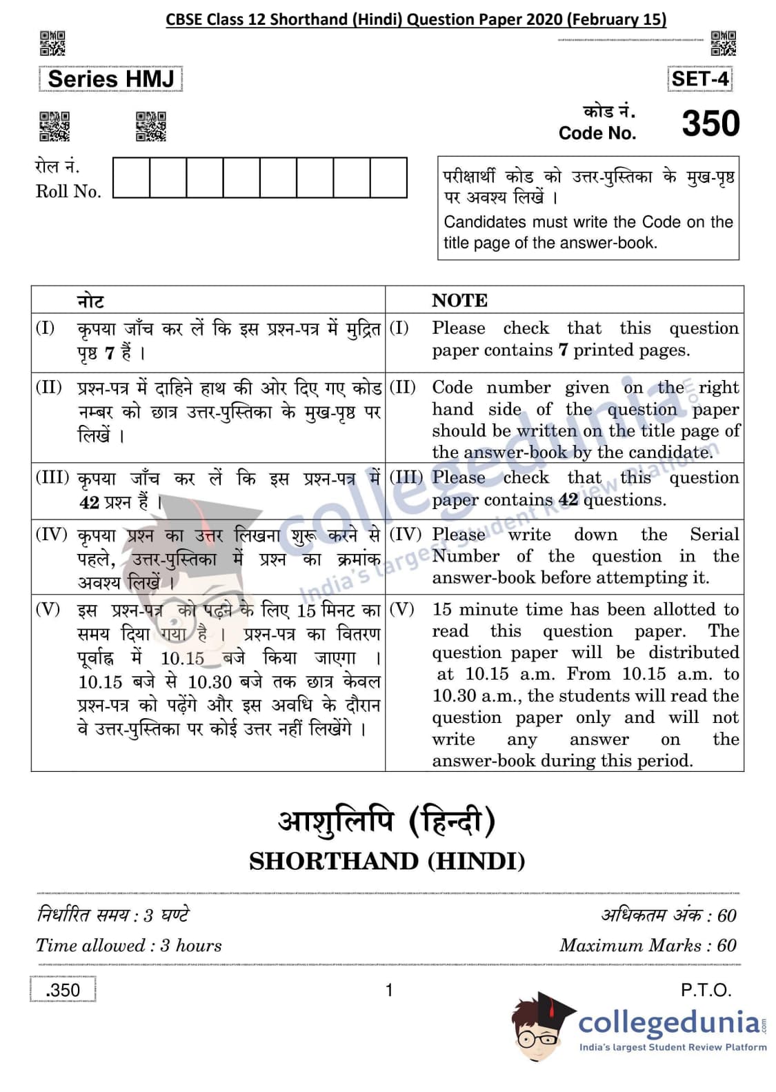 CBSE Class 12 Shorthand (Hindi) Question Paper 2020 with Answer Key Set 4 is available for download. The exam was conducted by the Central Board of Secondary Education on February 15, 2020 in the Morning Session 10:30 AM to 1:30 PM. The medium of paper was Hindi. The question paper comprised a total of 42 questions divided among 2 sections.