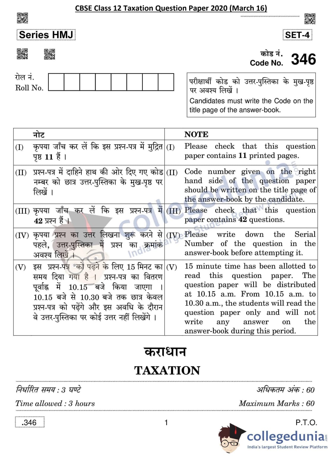 CBSE Class 12 Taxation Question Paper 2020 with Answer Key Set 4 is available for download. The exam was conducted by the Central Board of Secondary Education on March 16, 2020 in the Morning Session 10:30 AM to 1:30 PM. The medium of paper was English & Hindi. The question paper comprised a total of 42 questions divided among 2 sections.