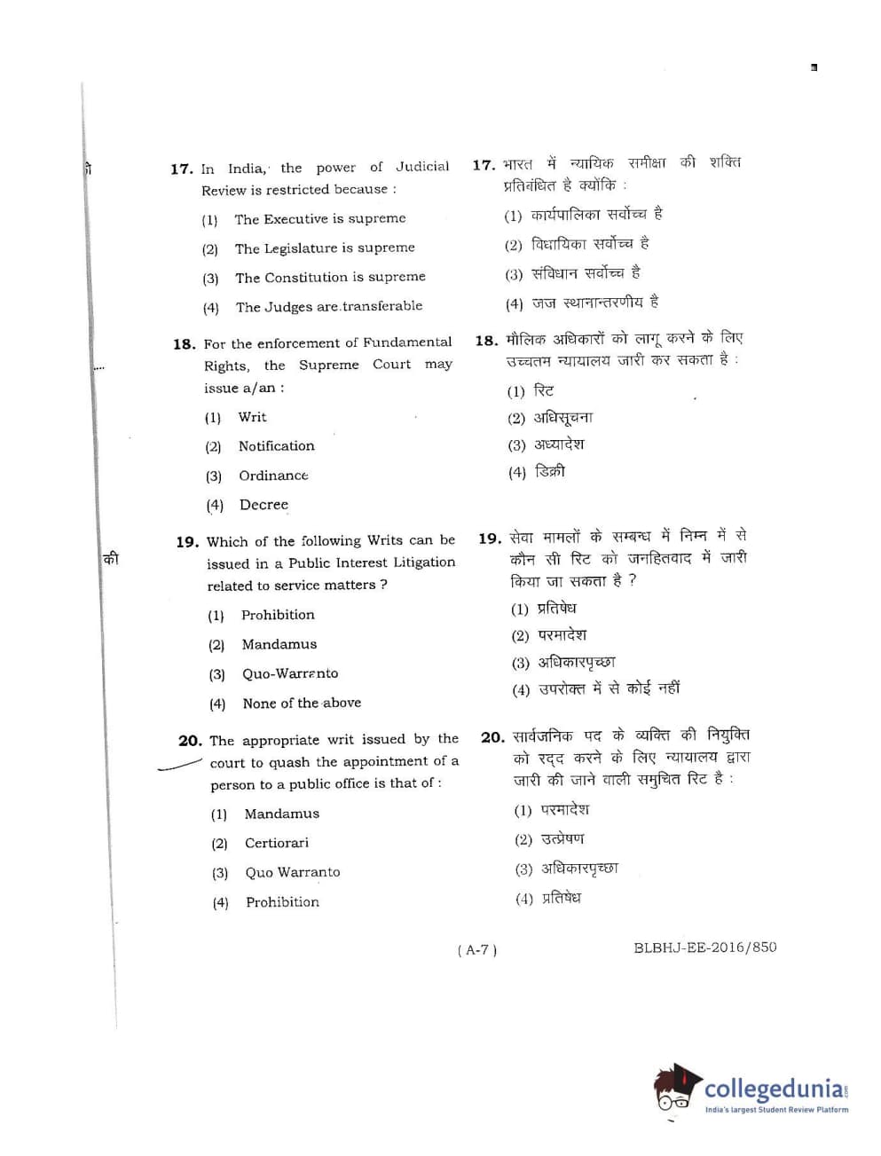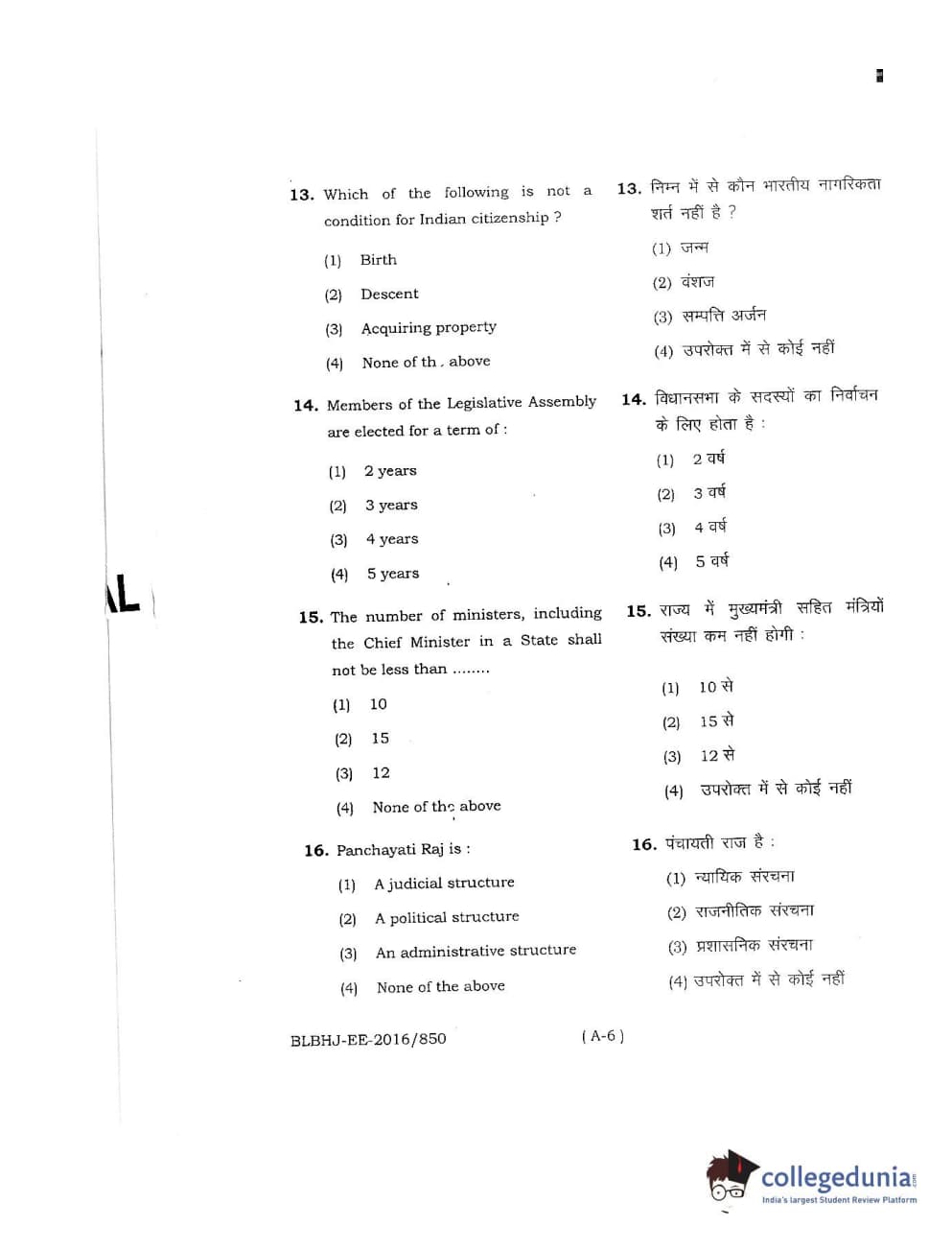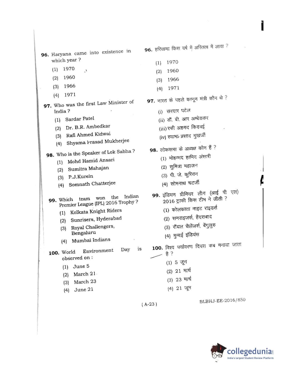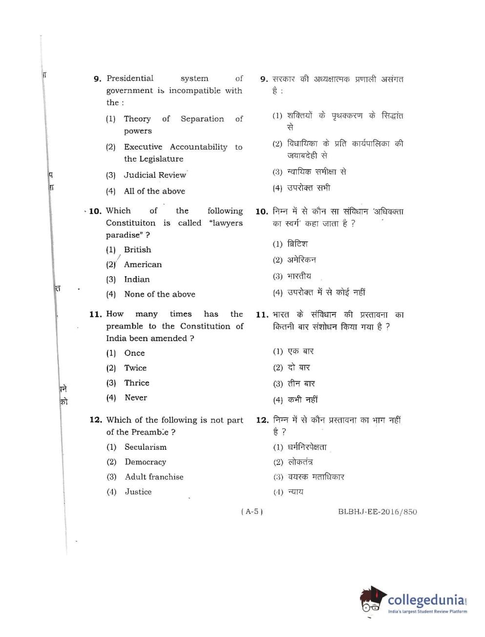 MDUCEE 2016 LL.B. (Hons) 5 Year Integrated Set A Question Paper with Answer Key PDFs