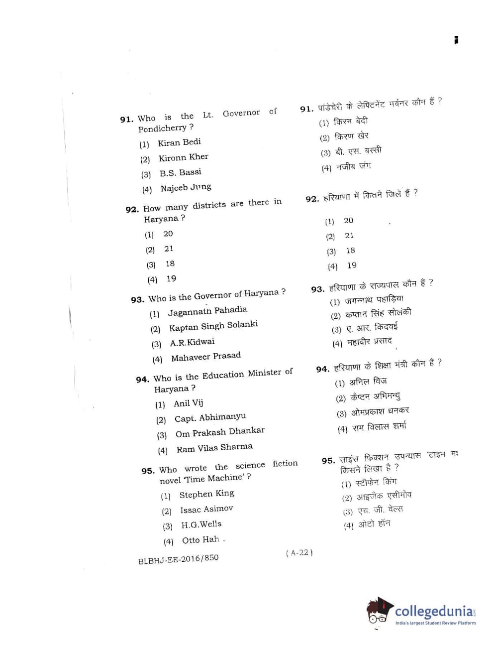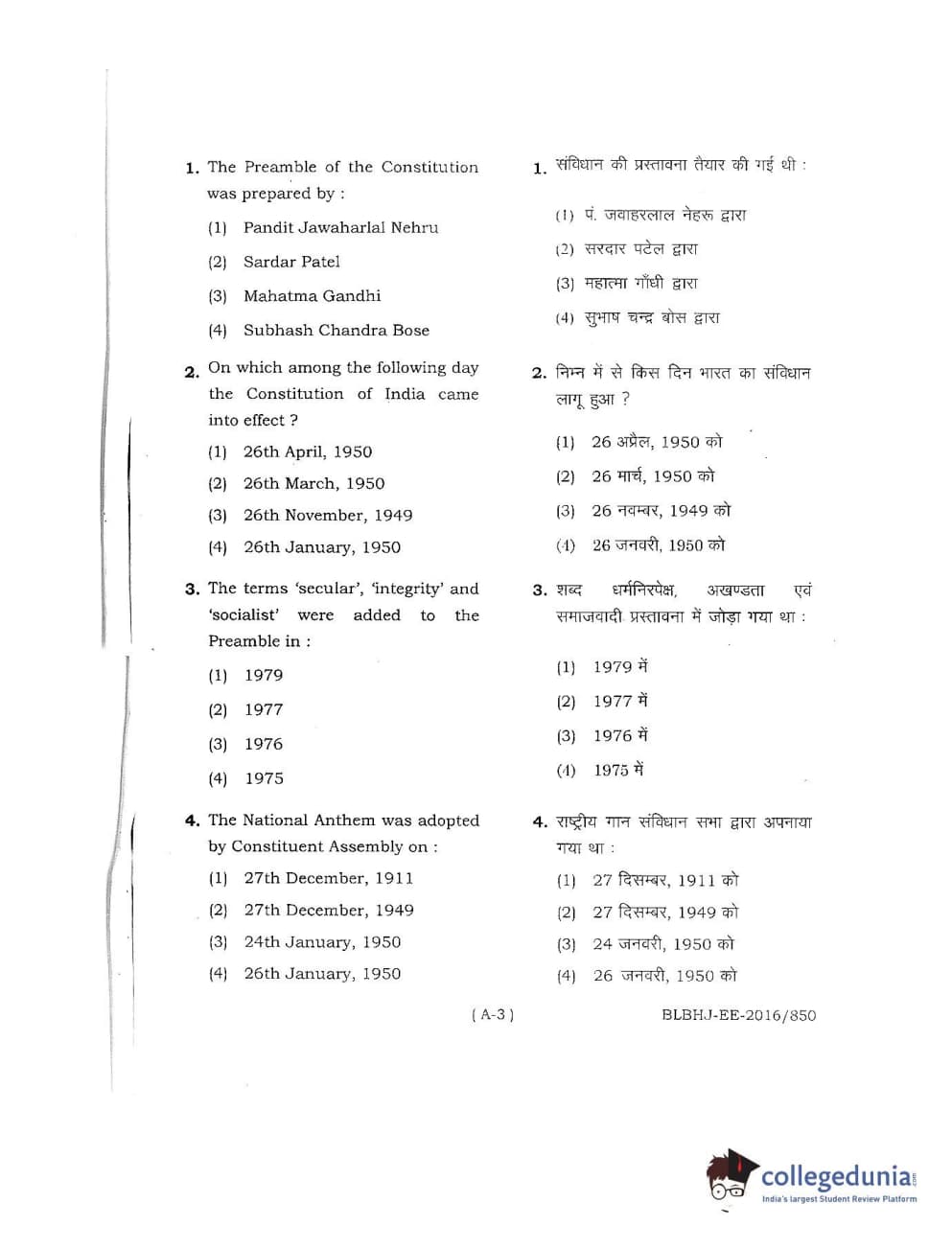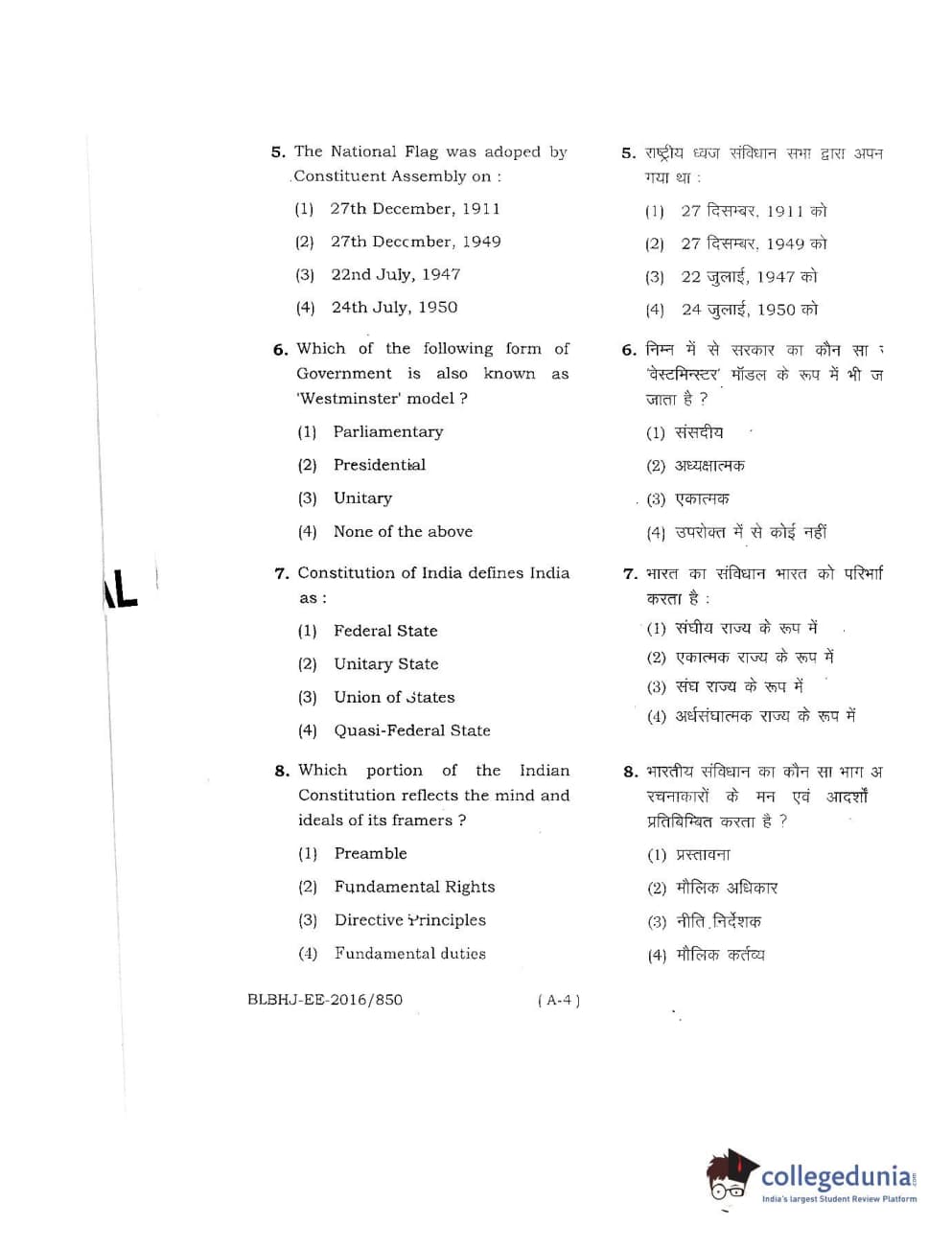 MDUCEE 2016 LL.B. (Hons) 5 Year Integrated Set A Question Paper with Answer Key PDFs