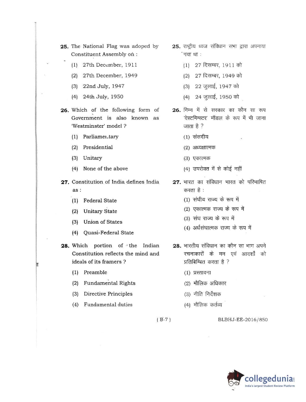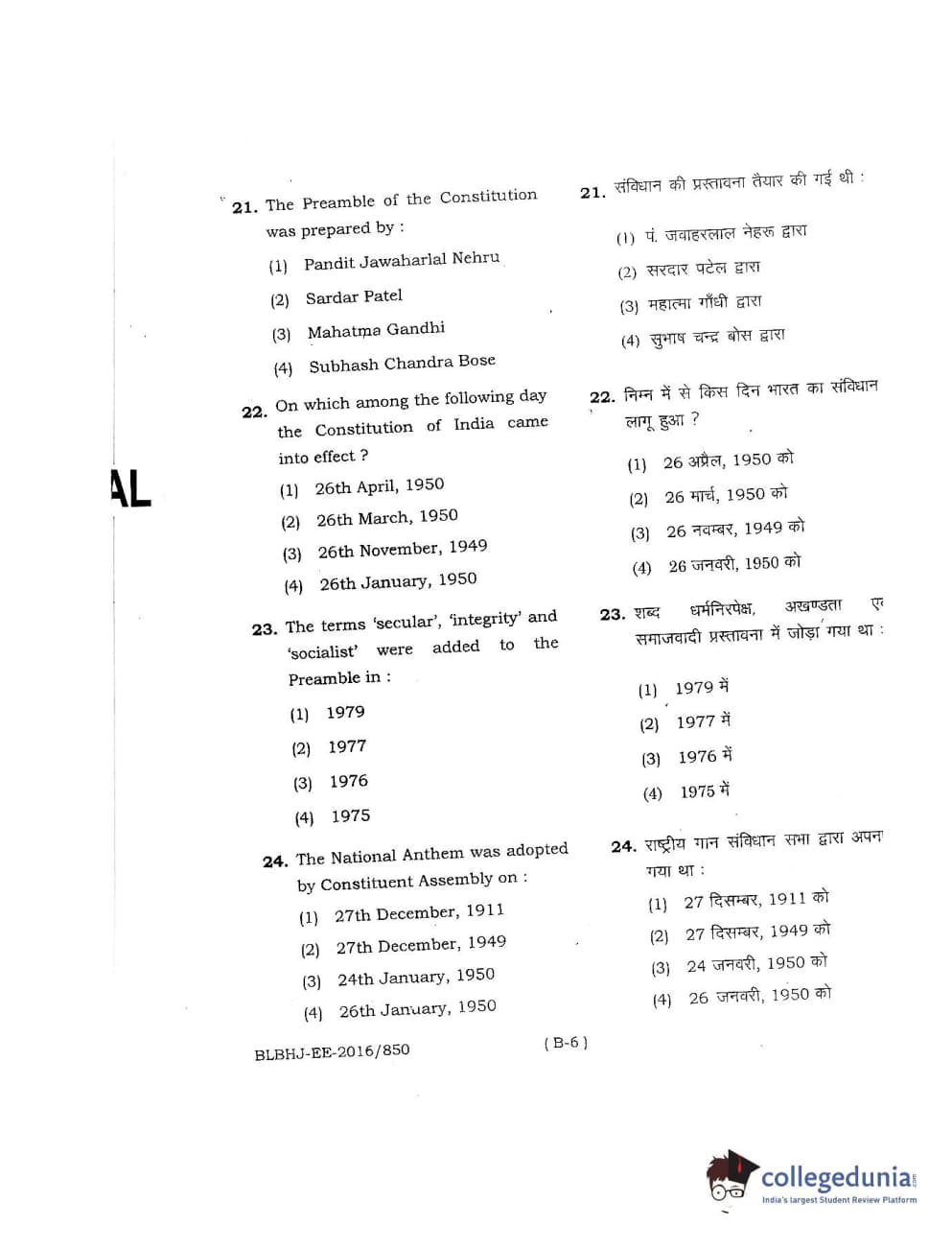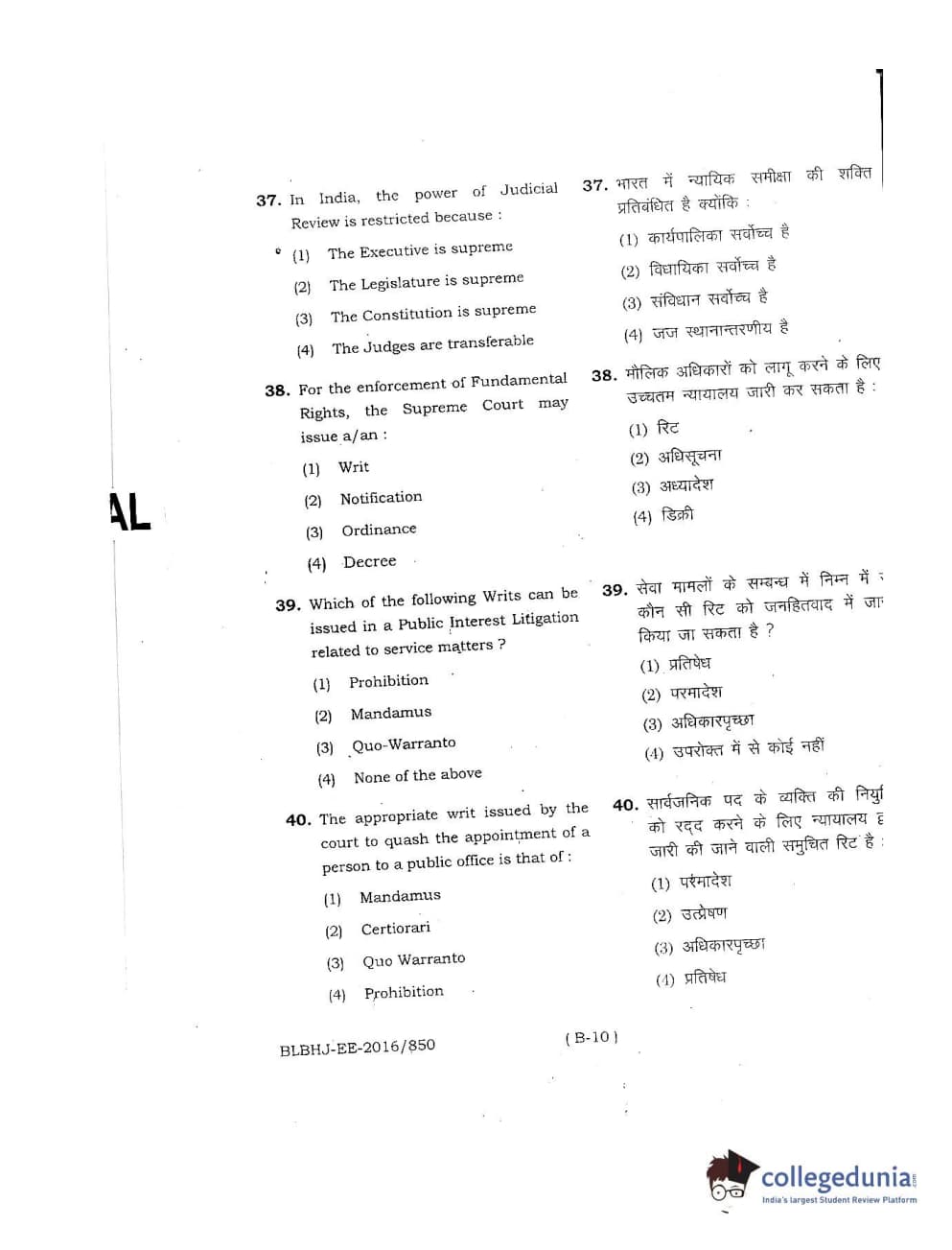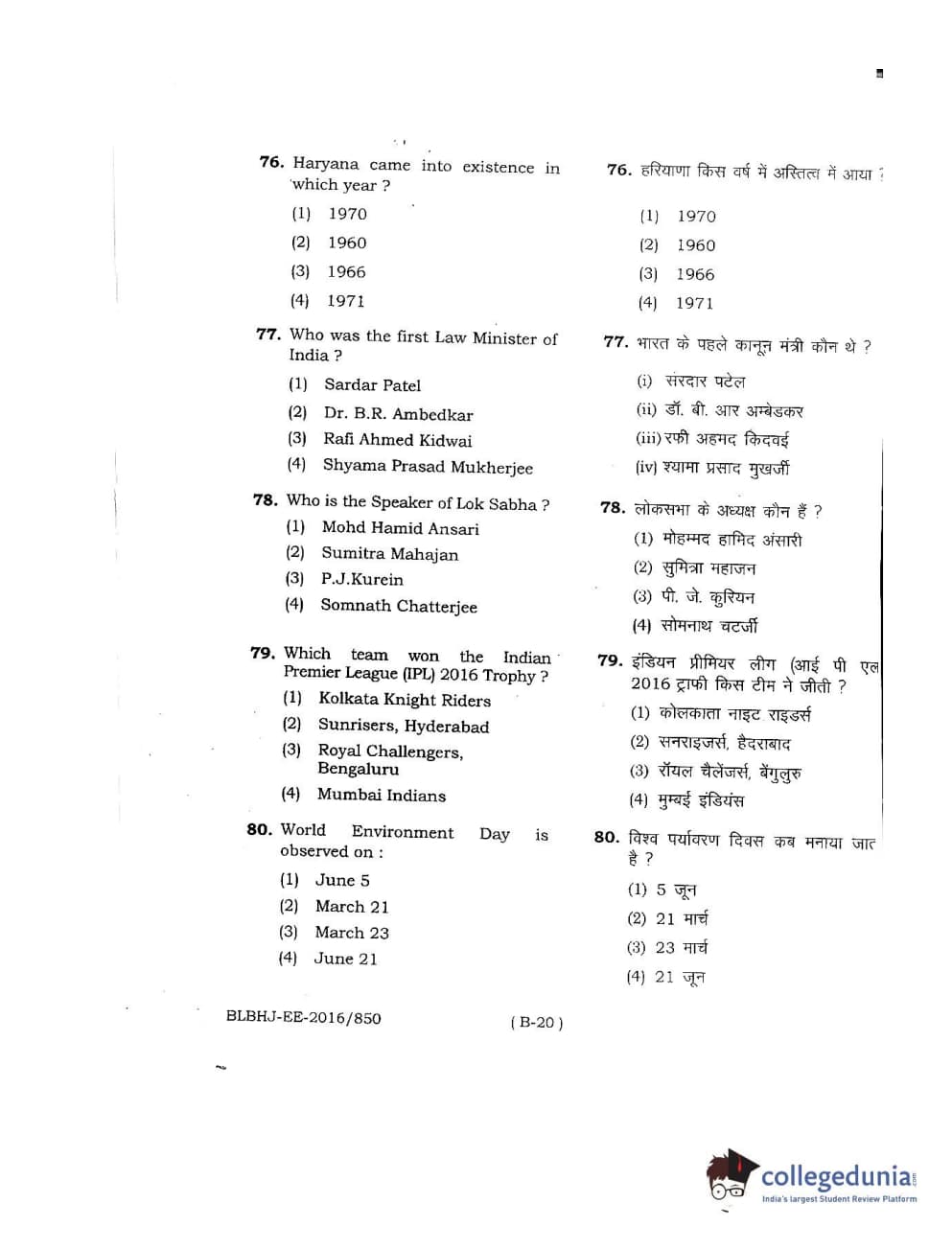 MDUCEE 2016 LL.B. (Hons) 5 Year Integrated Set B Question Paper with Answer Key PDFs